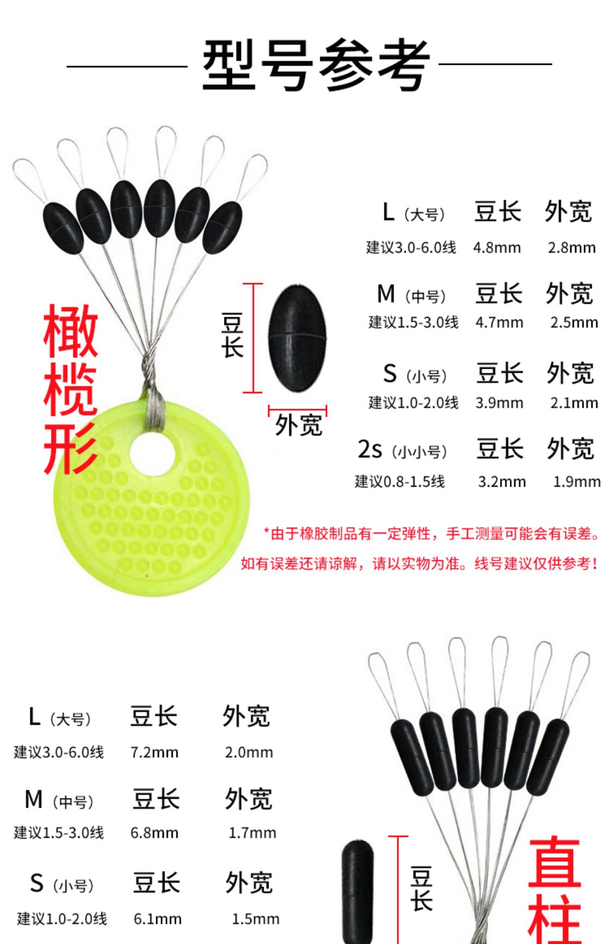 슈퍼 단단한 공간 콩 벌크 스몰 사이즈 올리브 모양의 원통형 테이블 낚시 라인 세트 작은 액세서리 낚시 용품 고무 잠금