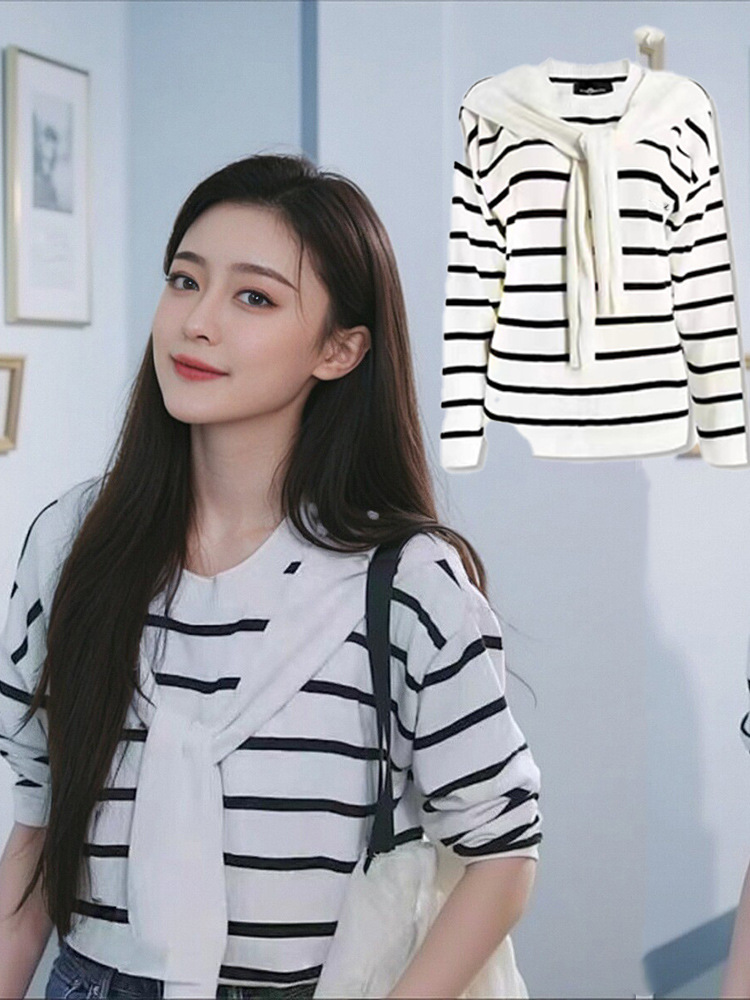 Spot Zhang Ruonan Wen Yifan의 같은 스타일 흑백 줄무늬 스웨터 가짜 투피스 숄 스웨터 연령 감소 다용도 탑