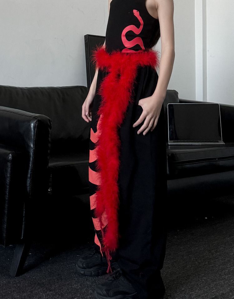 • 검정 레드 스네이크 민소매 티셔츠 + 검정 레드 스네이크 트레이닝 팬츠 + 레드 퍼 허리 스카프