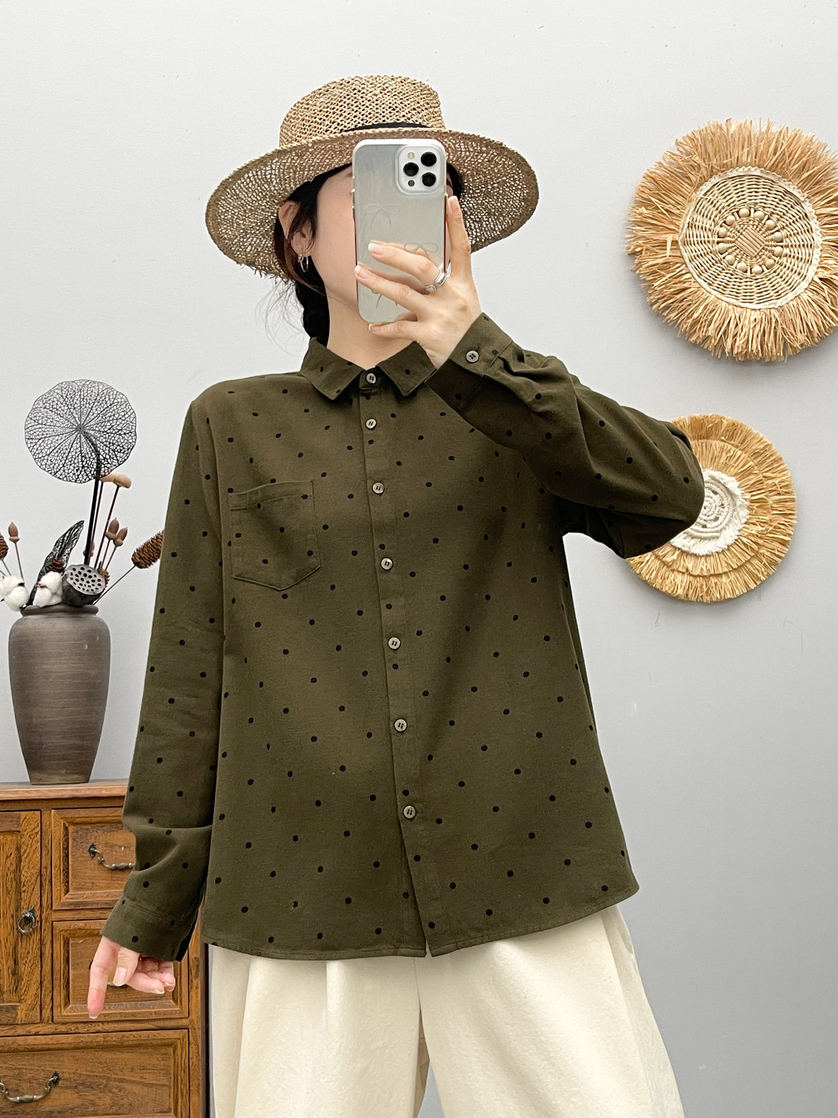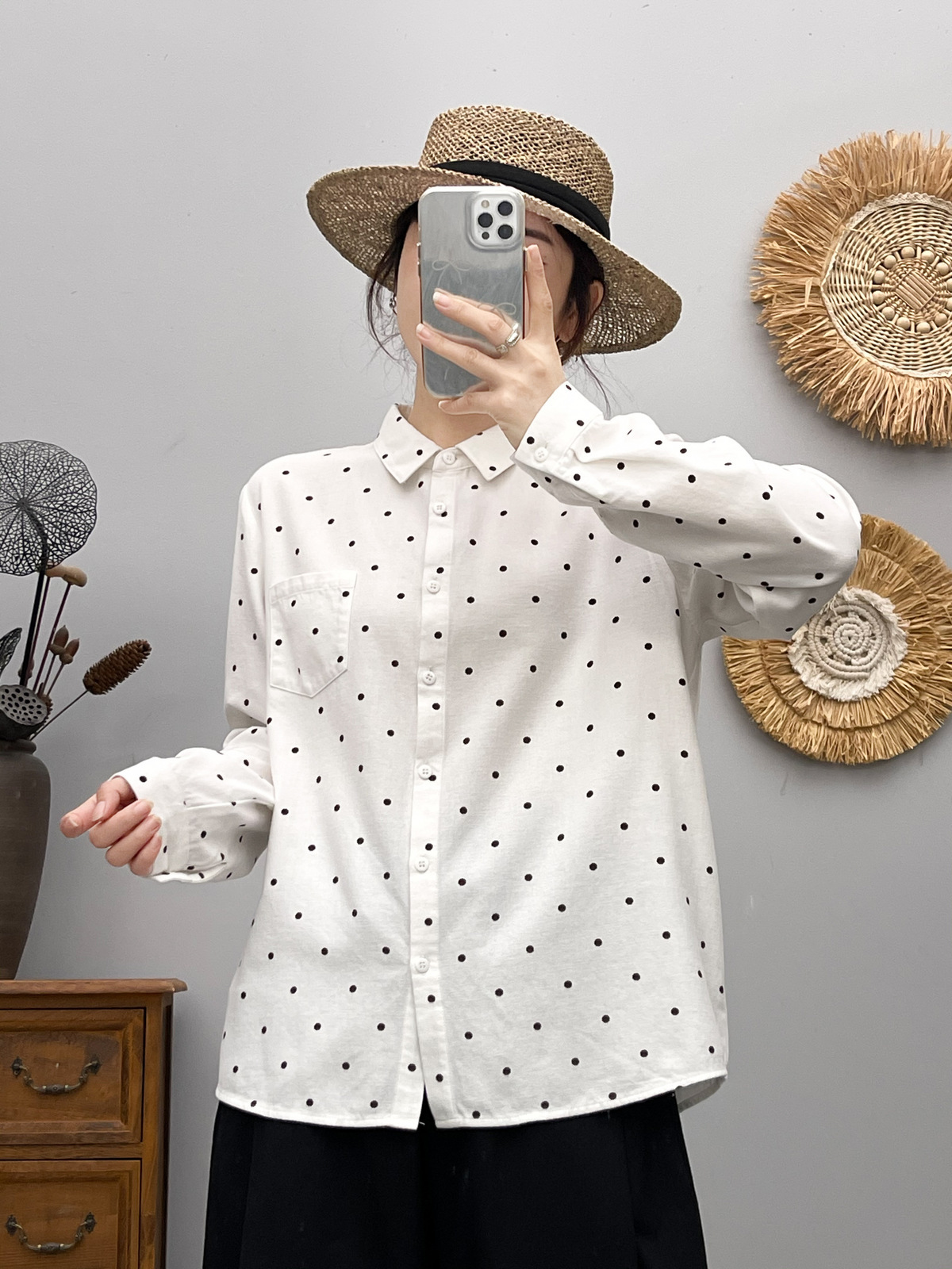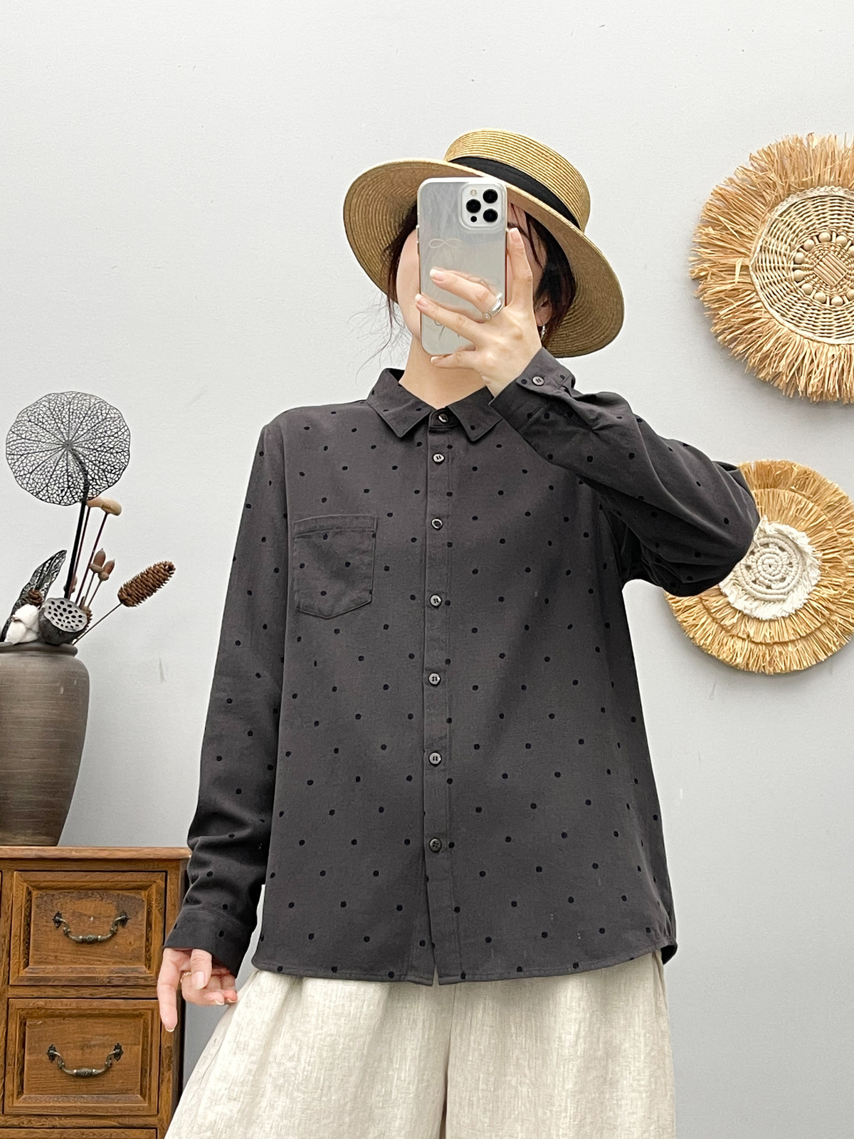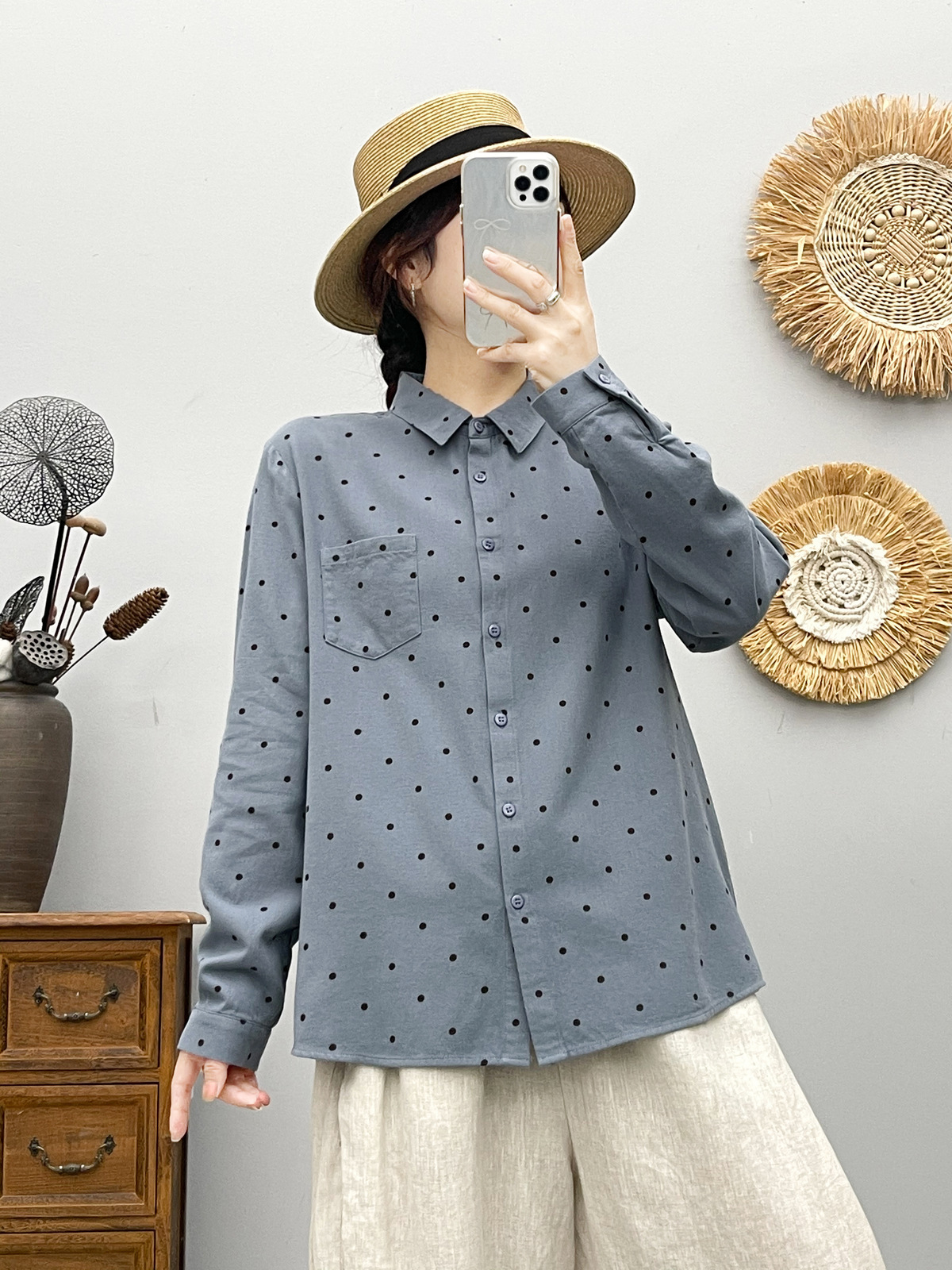 85162 두꺼운 샌딩 코튼 도트 인쇄 모든 경기 긴팔 셔츠 여성의 2024 가을 및 겨울 새로운 캐주얼 탑스토어 가기
