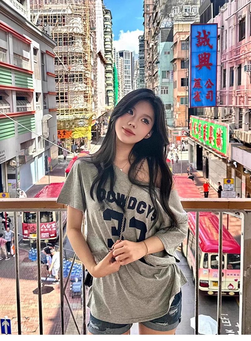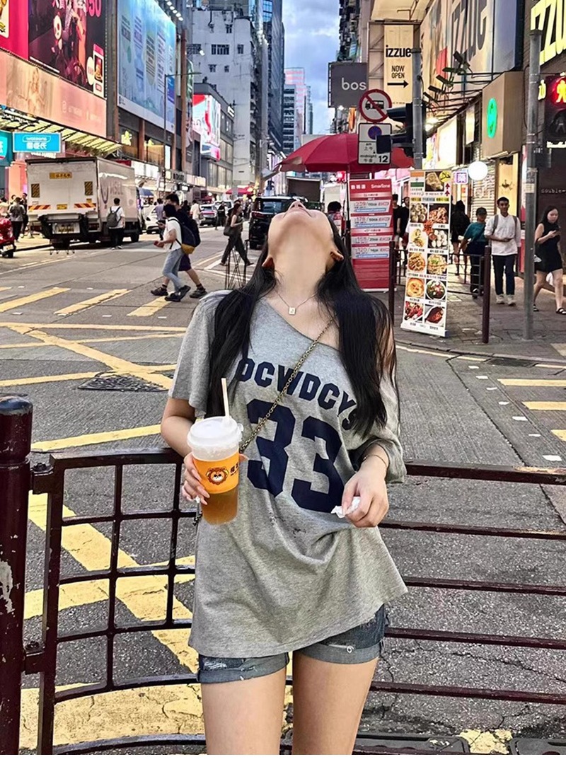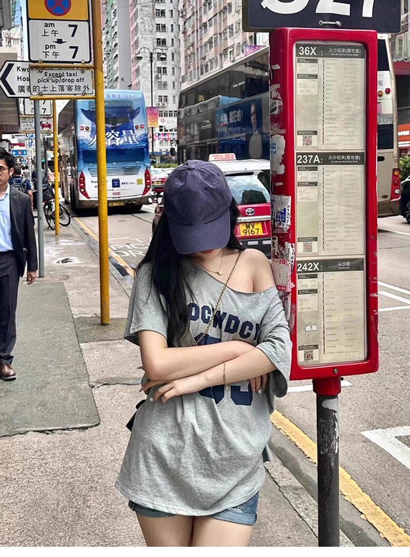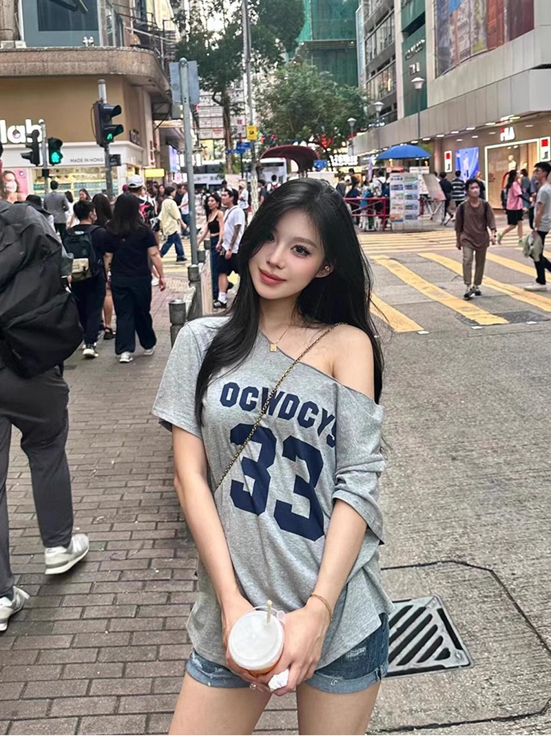 아메리칸 스타일 핫 걸 슬랜트 숄더 반팔 티셔츠 여성 여름 2025 새로운 루즈 디자인 센스 니쉬 숄더 탑스토어 가기