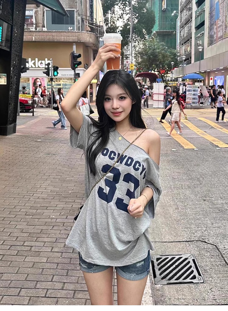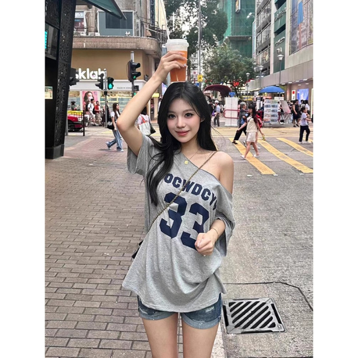 아메리칸 스타일 핫 걸 슬랜트 숄더 반팔 티셔츠 여성 여름 2025 새로운 루즈 디자인 센스 니쉬 숄더 탑