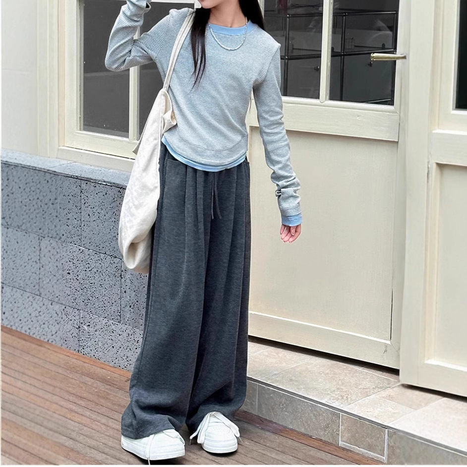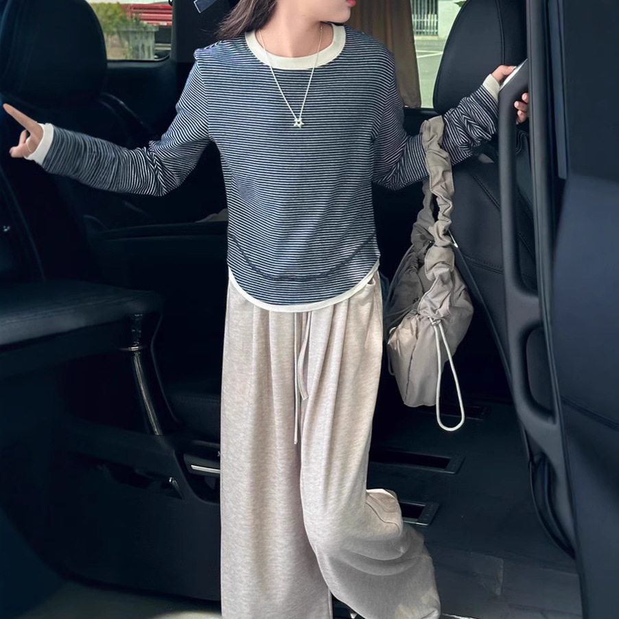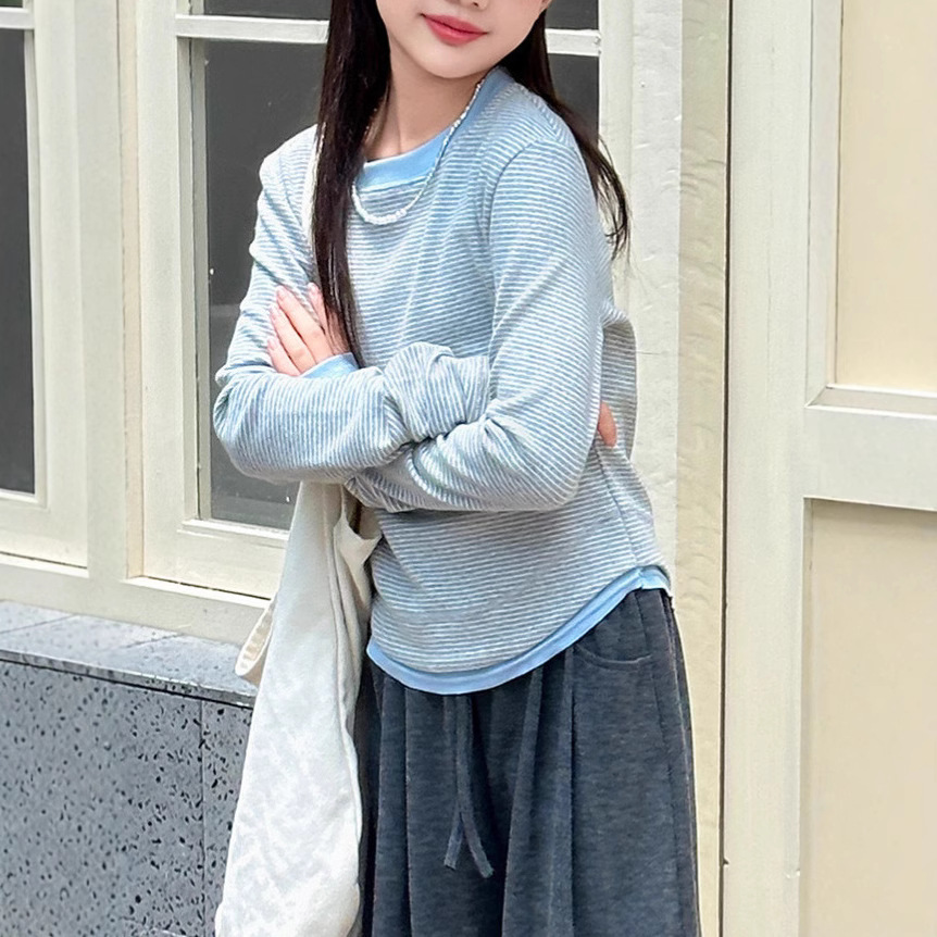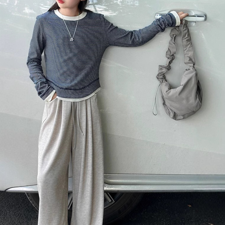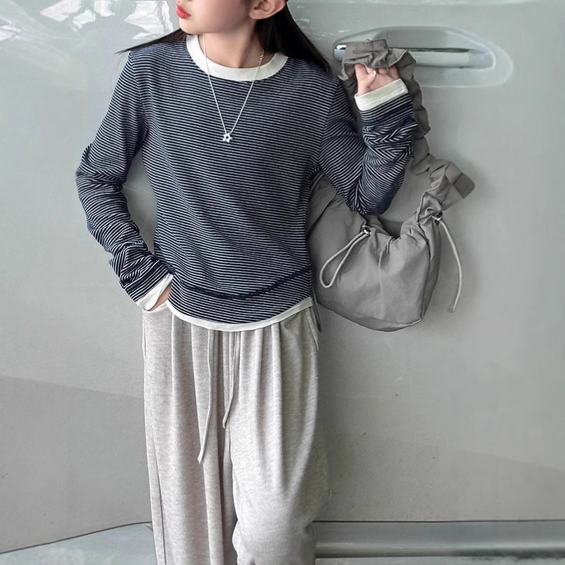 소녀 긴팔 티셔츠 가을 줄무늬베이스 셔츠 세련된 스티칭 니트웨어 소녀 캐주얼 쇼트 탑