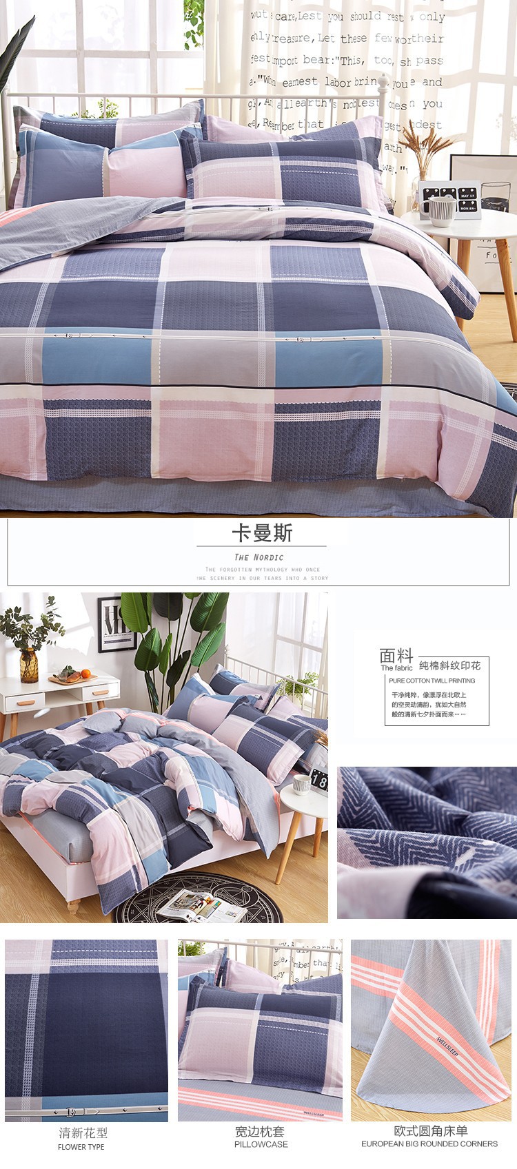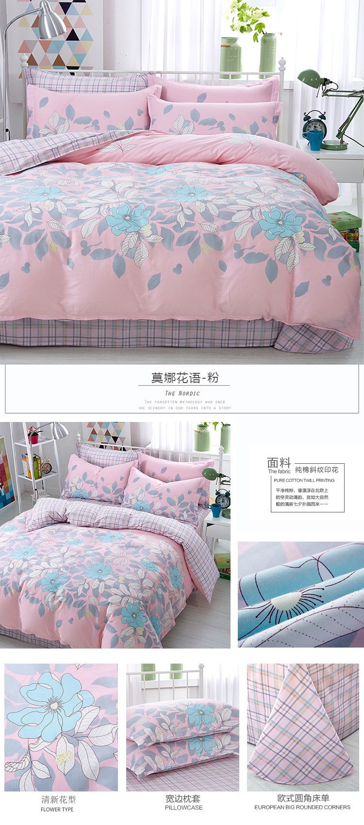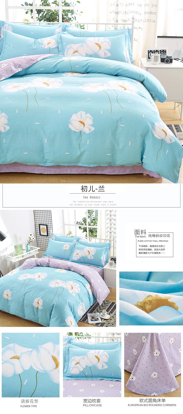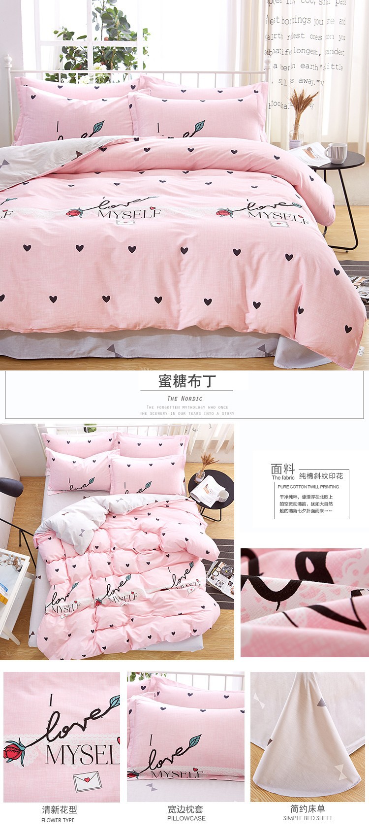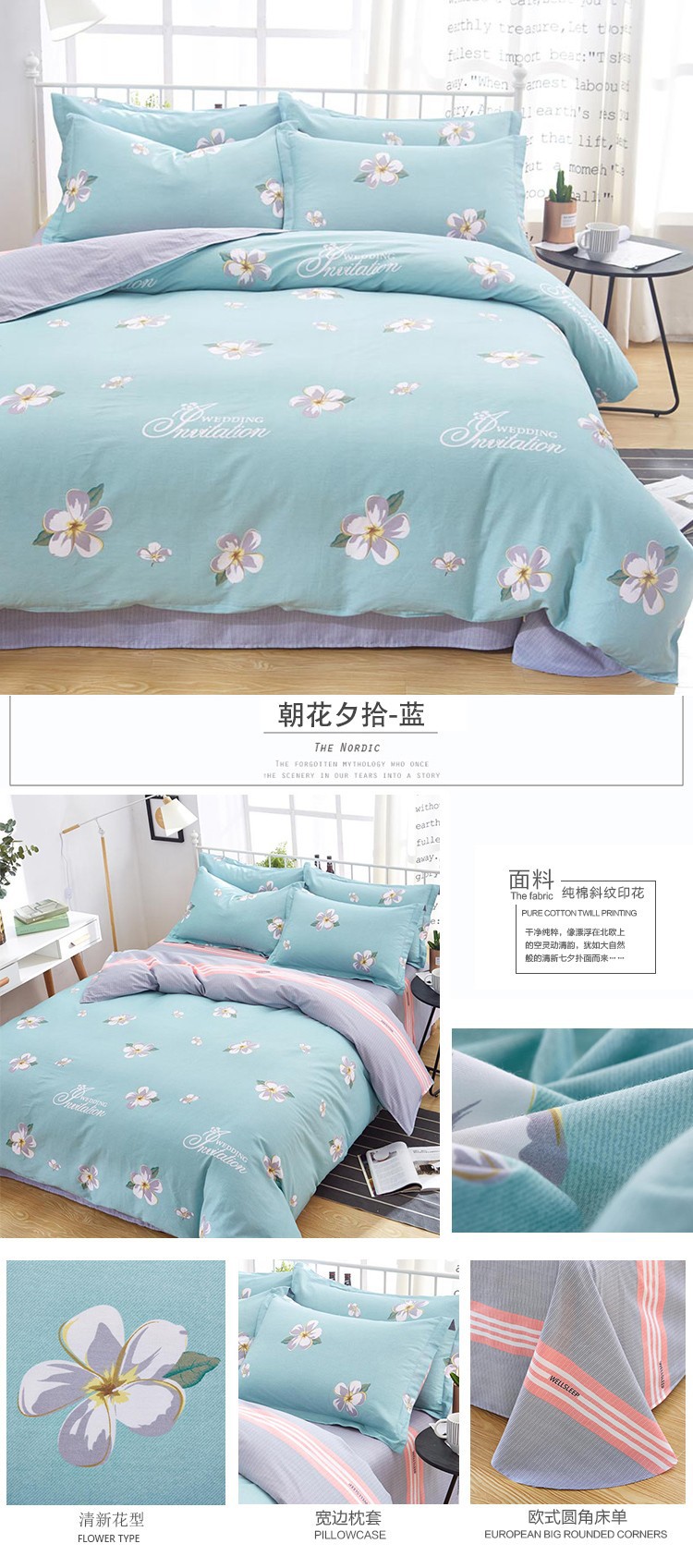 Ins 작은 신선한 면 4 조각 세트 간단한 만화 면 인쇄 학생 기숙사 침대 시트 퀼트 커버 3 피스 세트스토어 가기