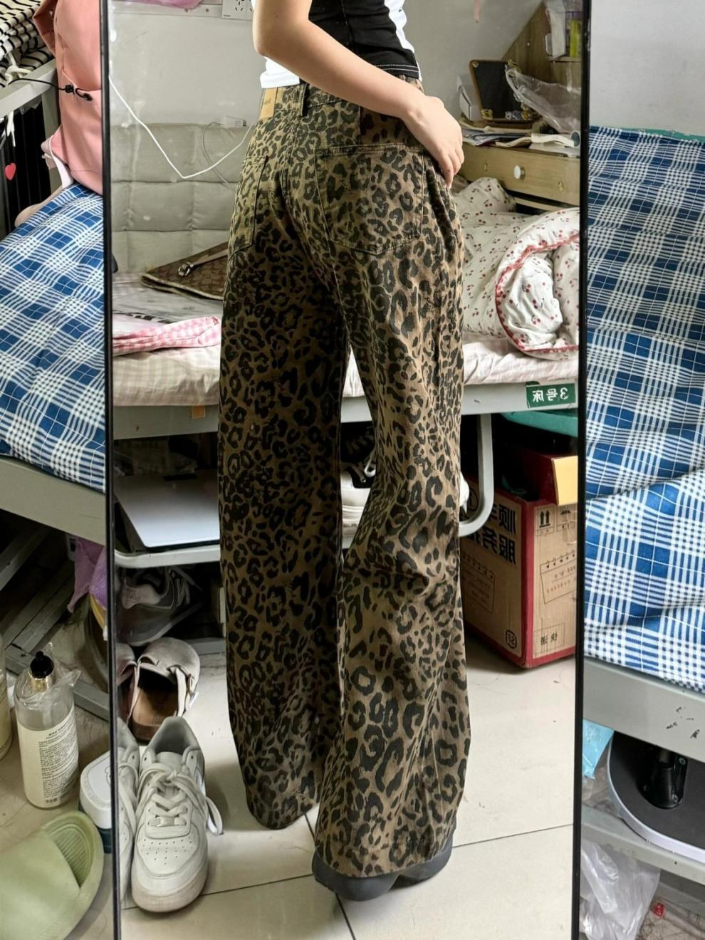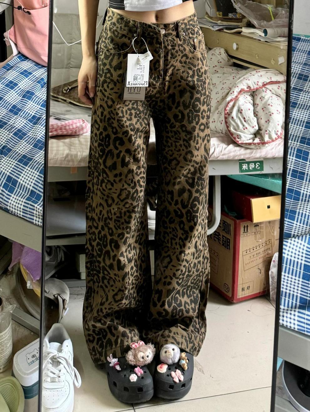 아메리칸 스타일 하이 스트리트 스파이스 소녀 레오파드 무늬 와이드 레그 청바지 여성 레트로 하이 웨이스트 루즈 슬리밍 올매치 스트레이트 캐주얼 팬츠스토어 가기