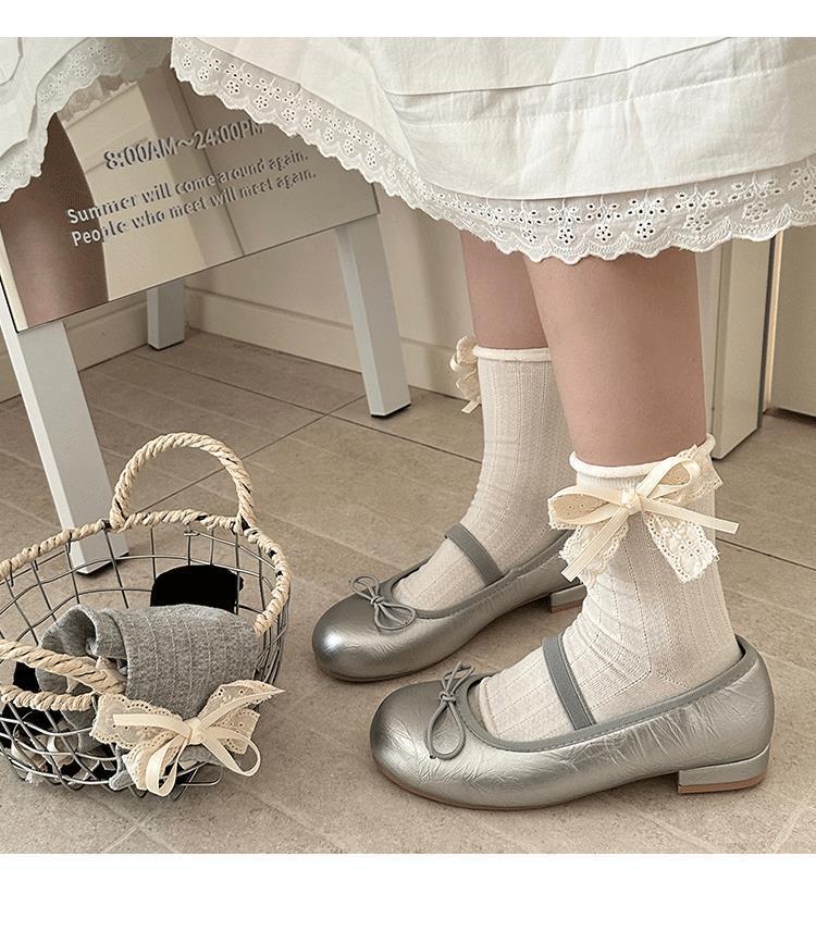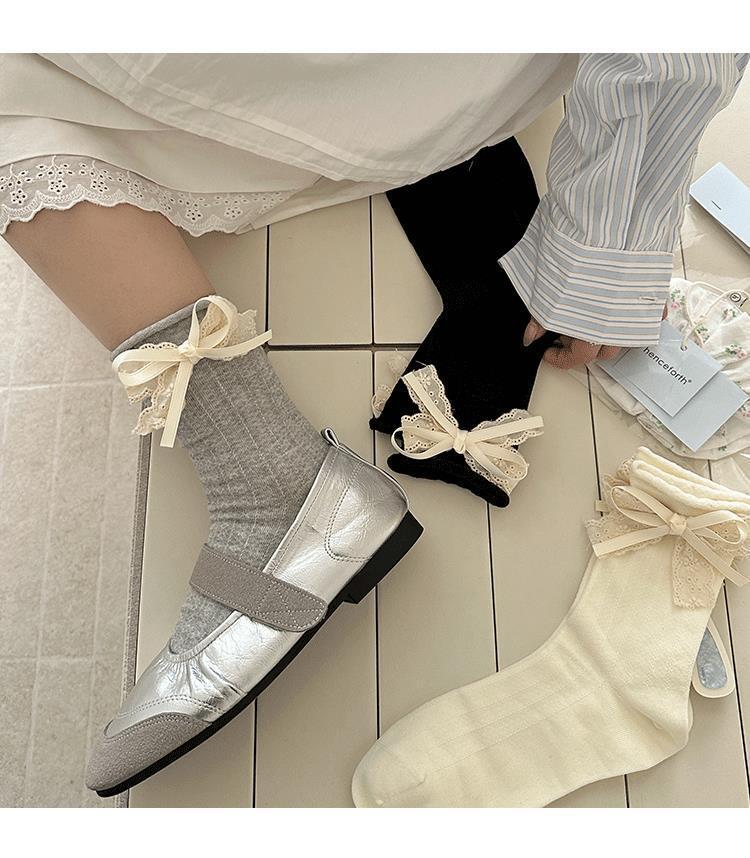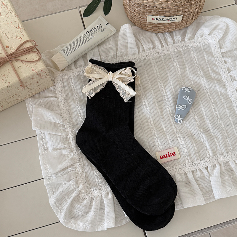 컬 보우 화이트 양말 여성 중간 길이 양말 Ins 트렌디 한 한국 스타일 여름 얇은 발레 스타일 레이스 스타킹