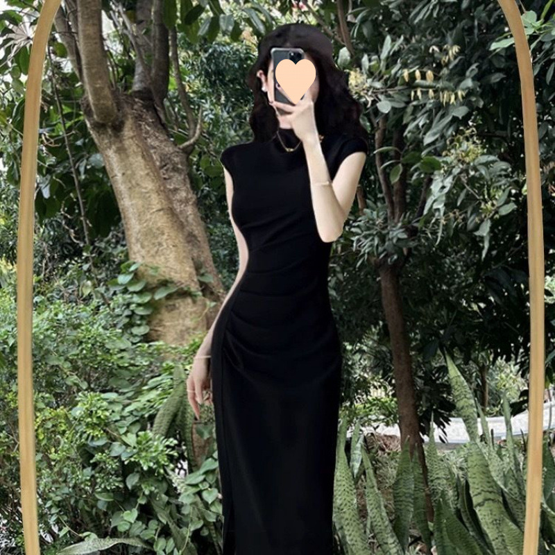 프랑스 스타일 원피스 여성 여름 새로운 헵번 스타일 우아한 슬림 핏 허리 하프 하이 칼라 핫 걸 블랙 쉬스 스커트