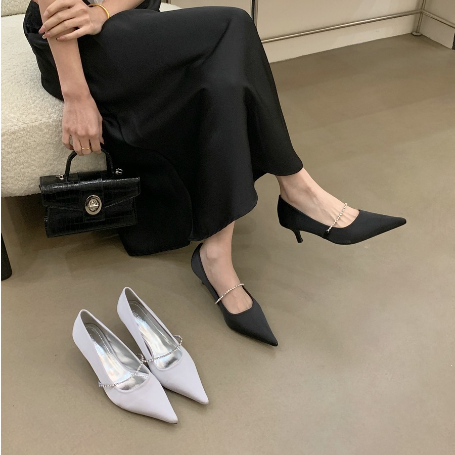 2025 봄 새로운 패션 라인스톤 금속 체인 새틴 뾰족한 하이힐 여성 외부 착용 미드 힐 얕은 입 신발스토어 가기