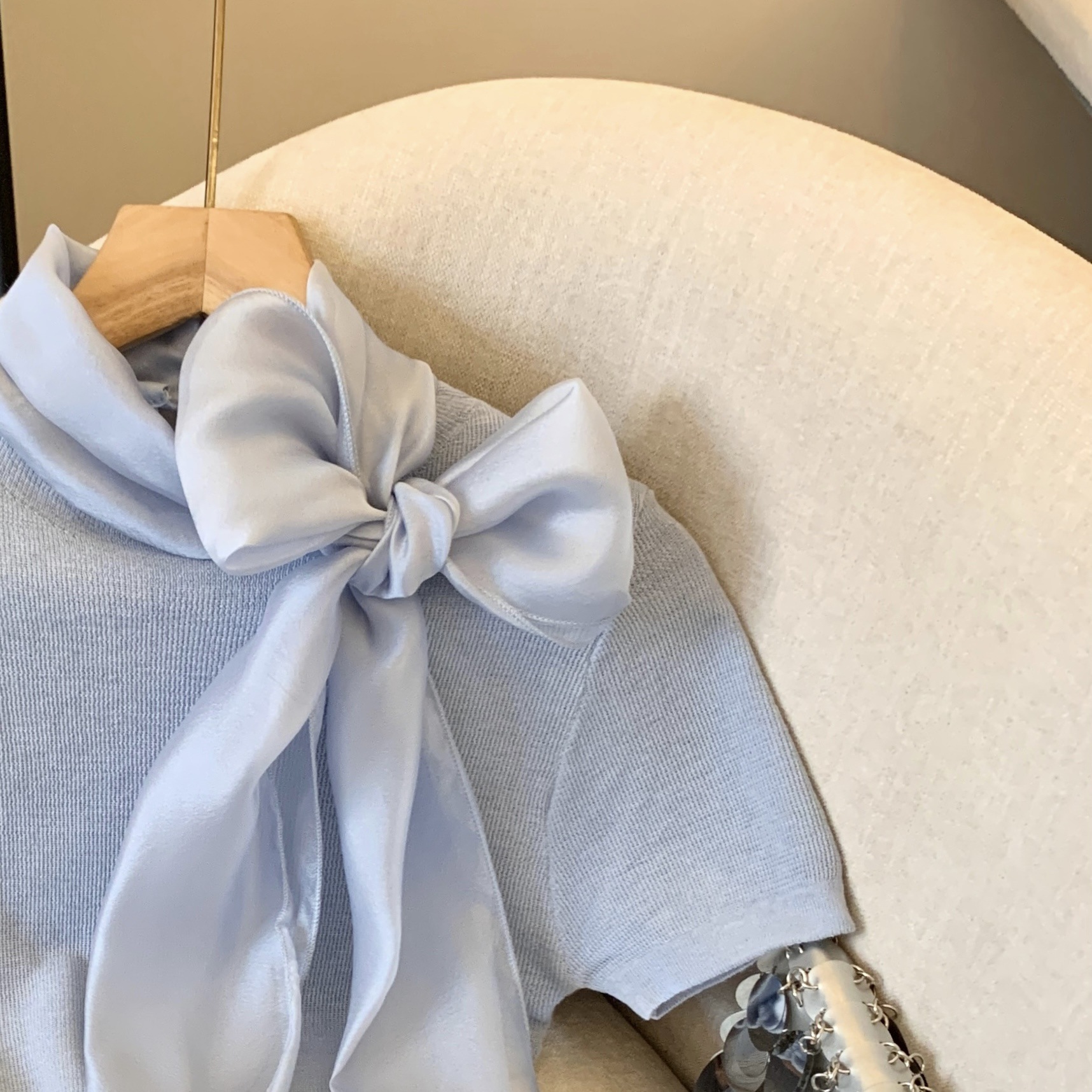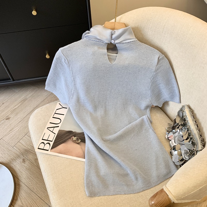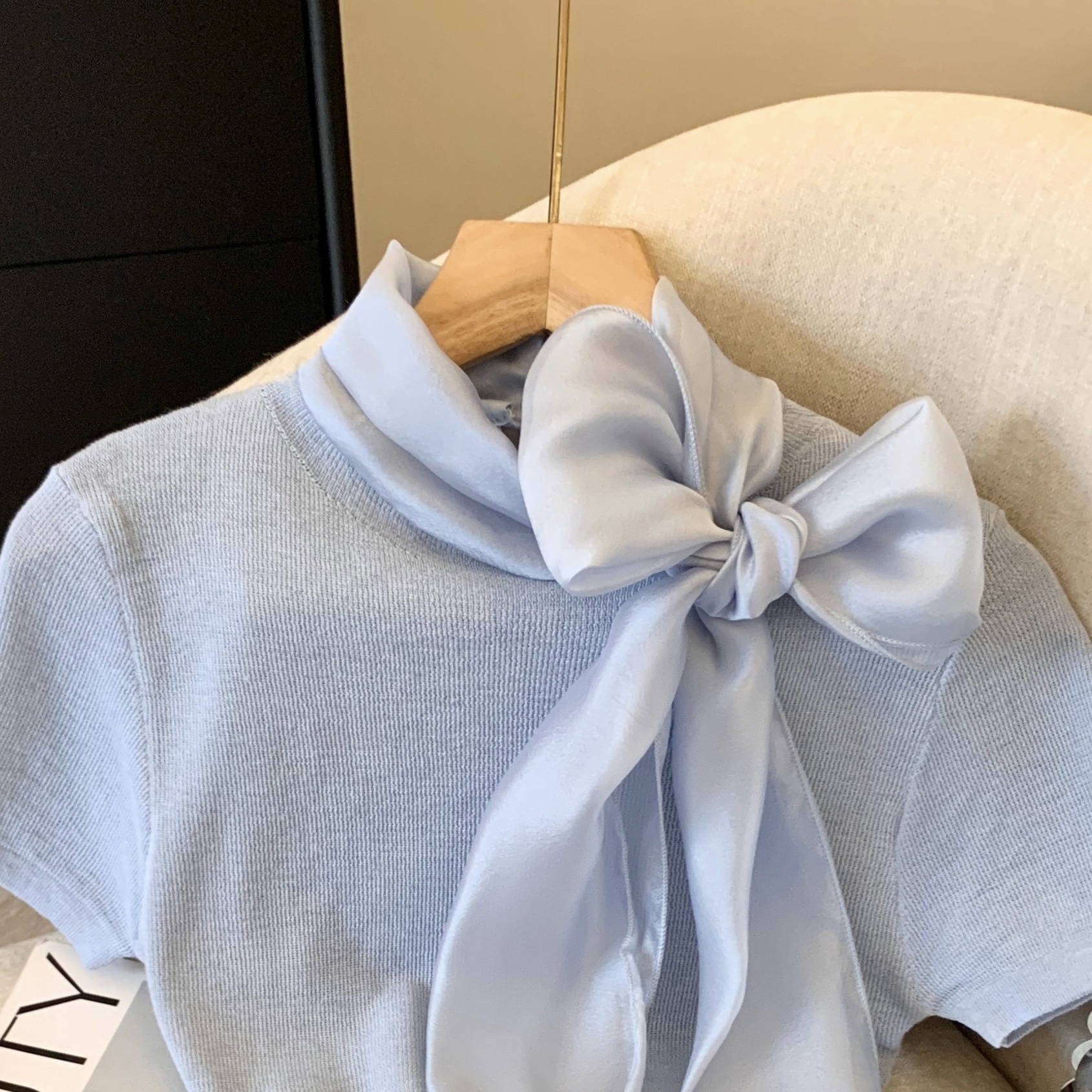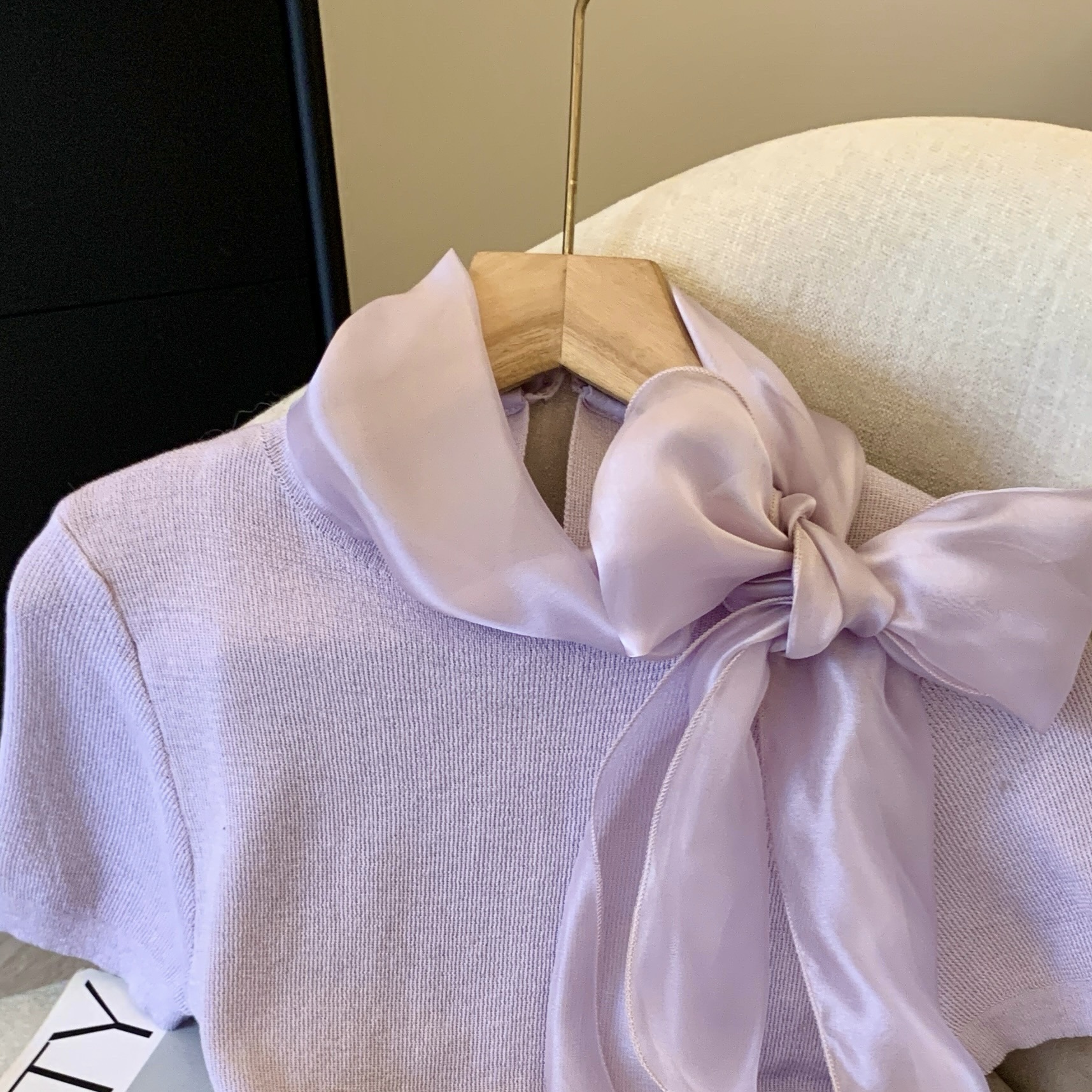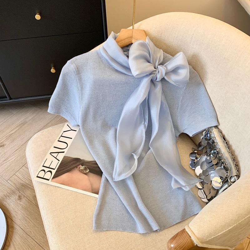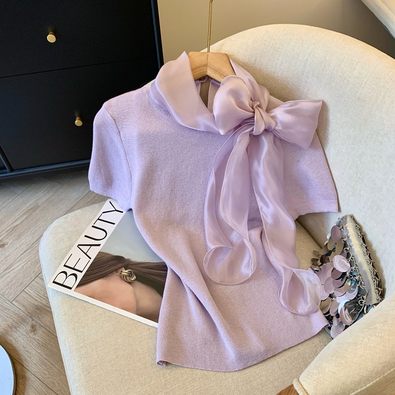 实拍蝴蝶结正肩短袖针织T恤女春季法式小香风气质修身设计感上衣