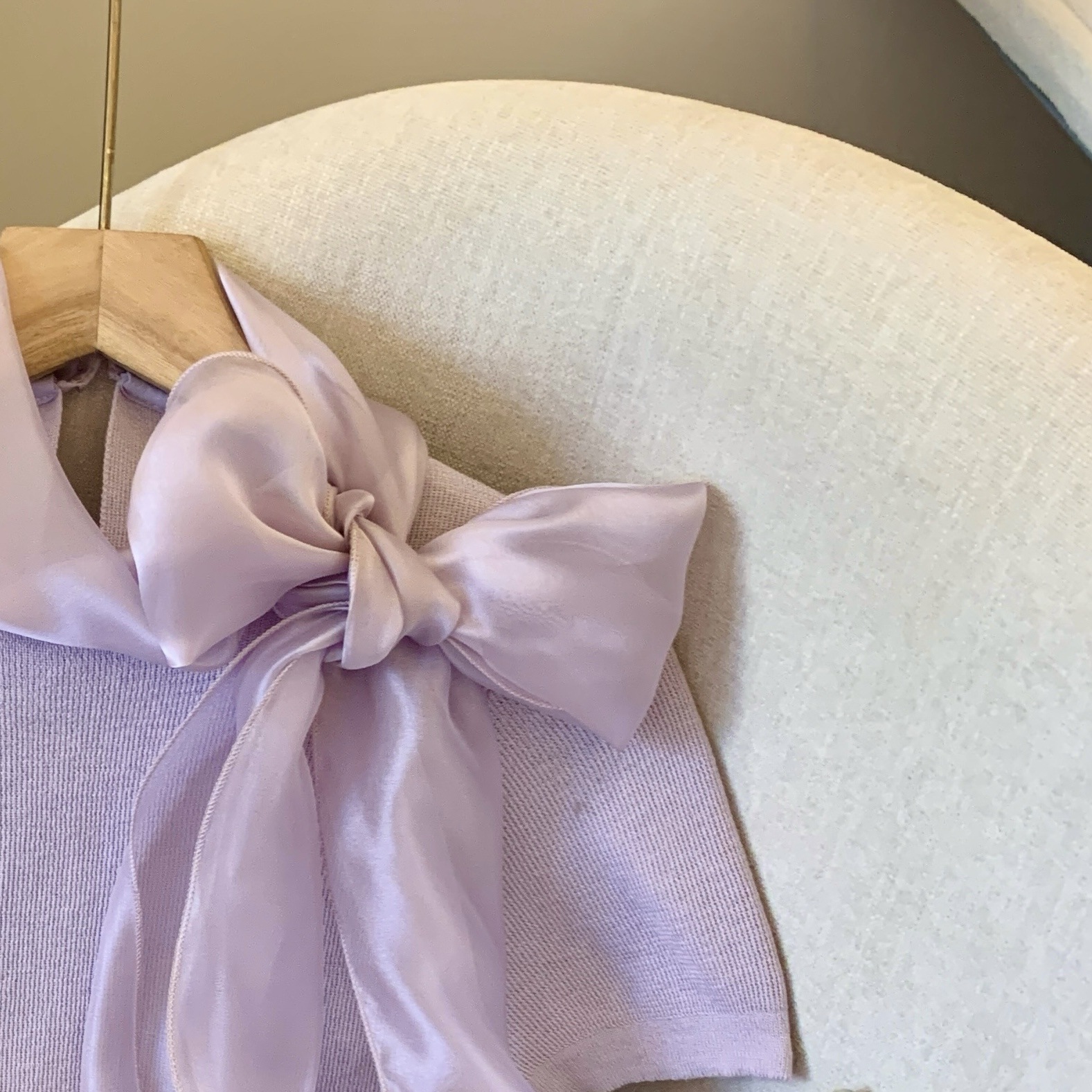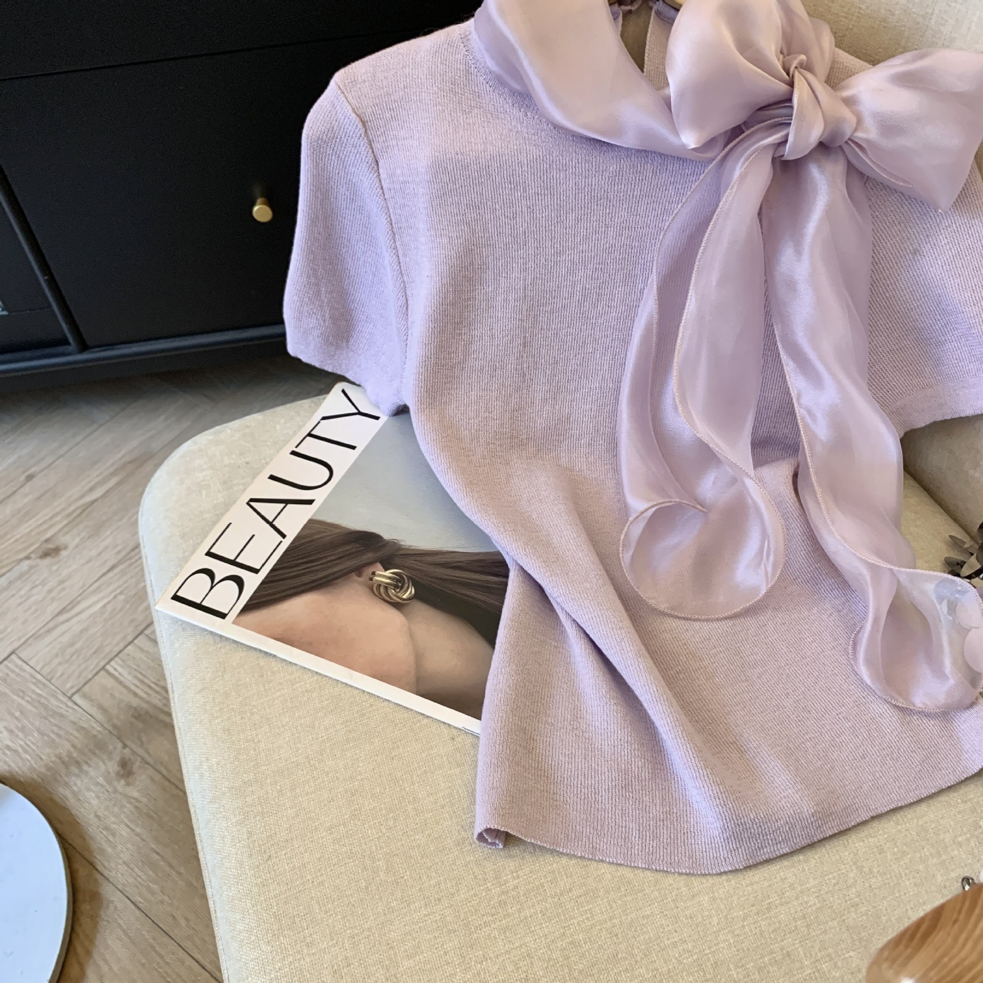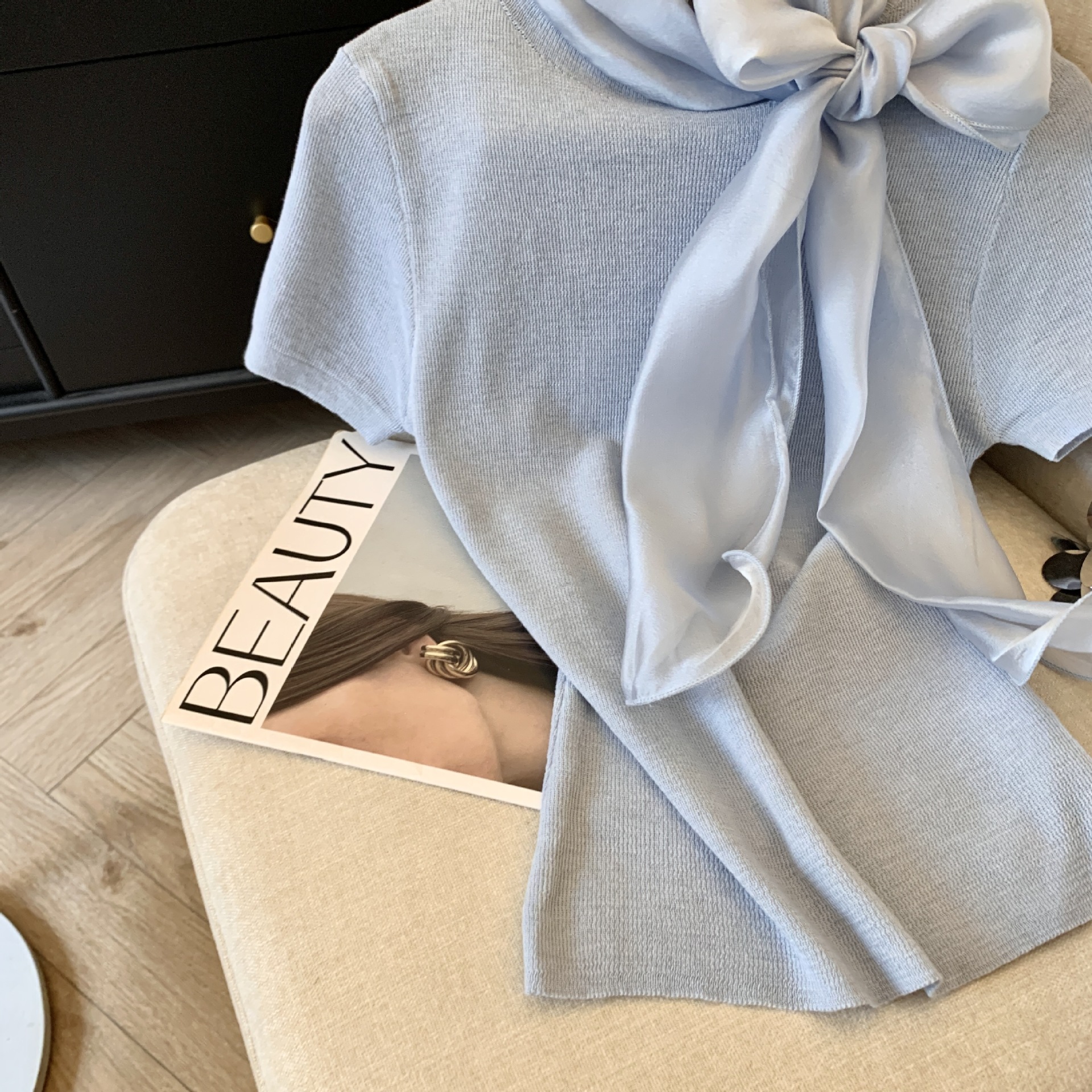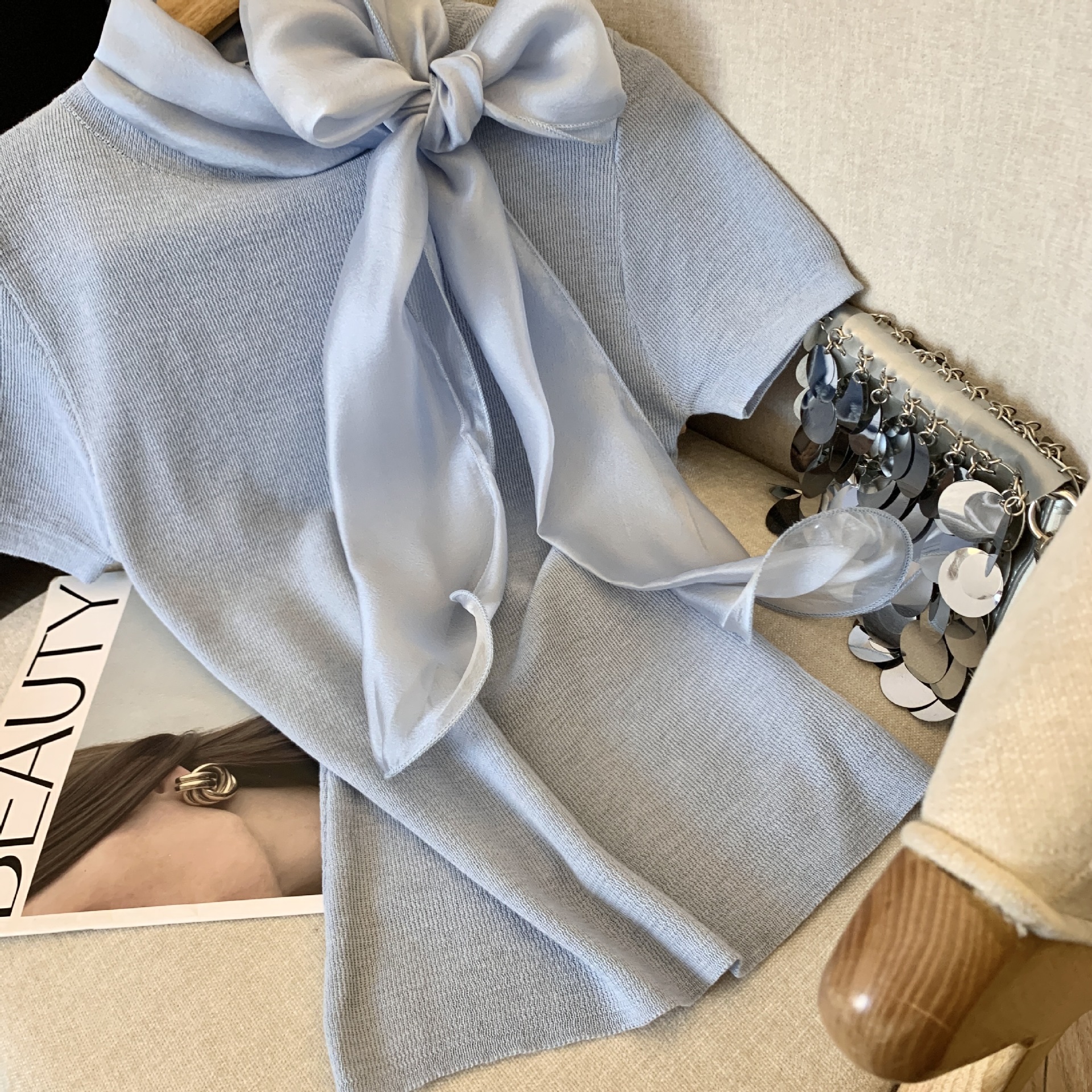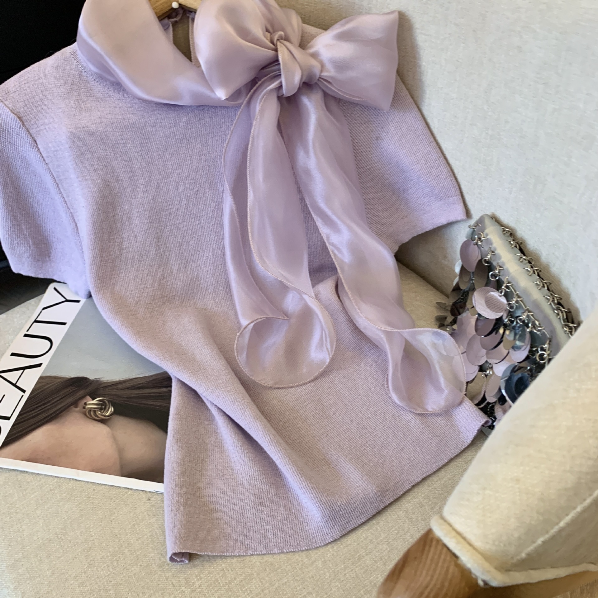 实拍蝴蝶结正肩短袖针织T恤女春季法式小香风气质修身设计感上衣