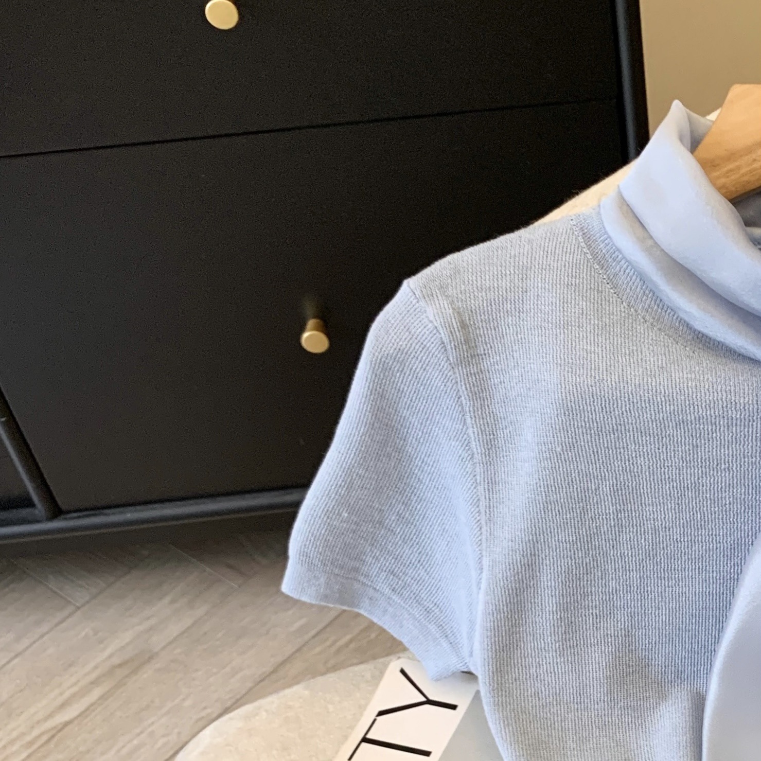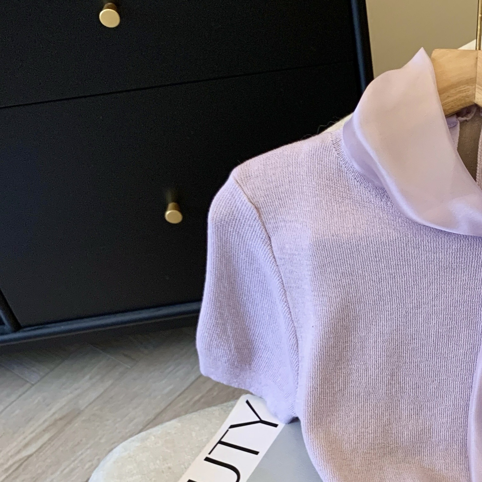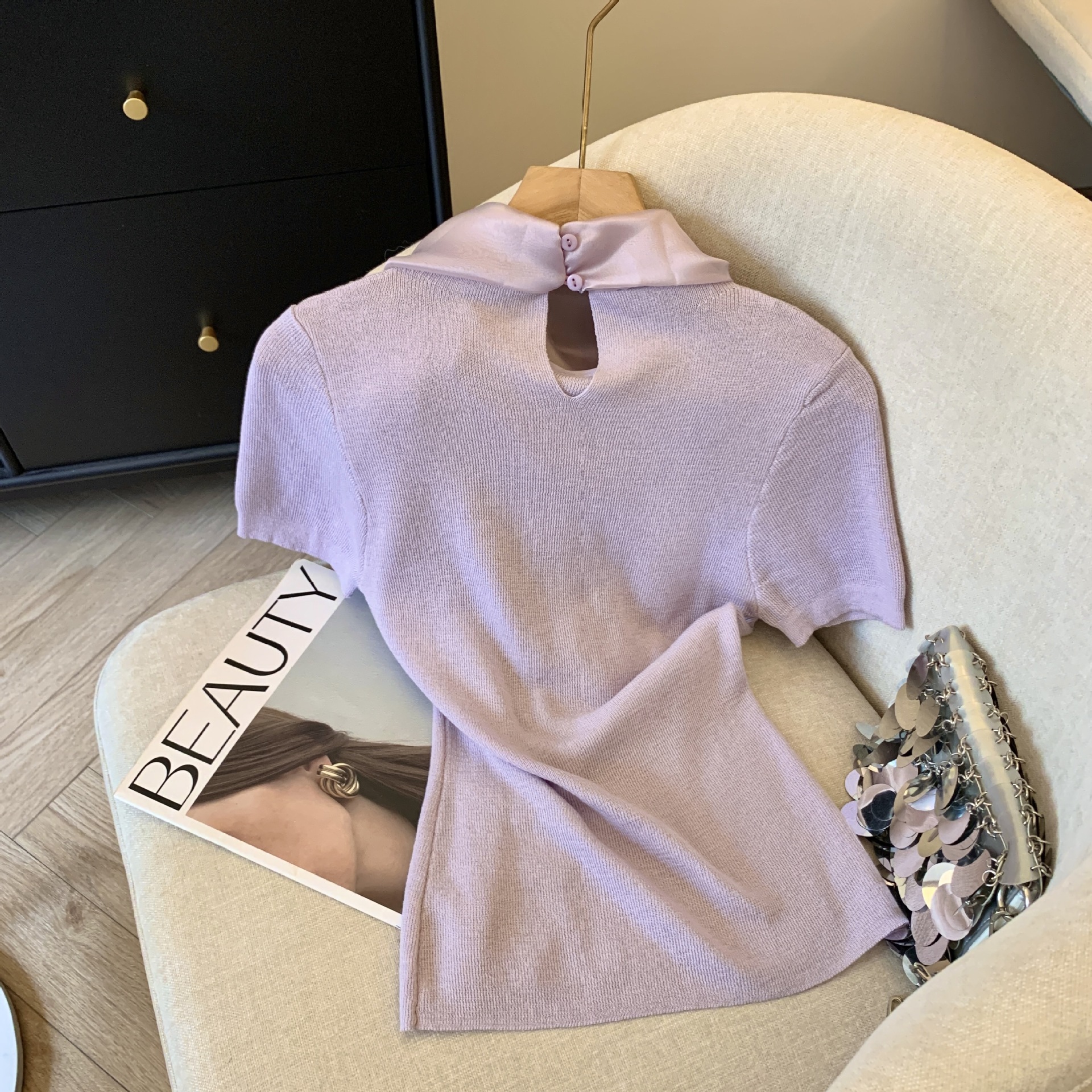 활 어깨 반팔 니트 티셔츠 여성 2025 봄과 여름 프랑스 스타일 샤넬 스타일 우아한 슬림 핏 디자인 탑스토어 가기