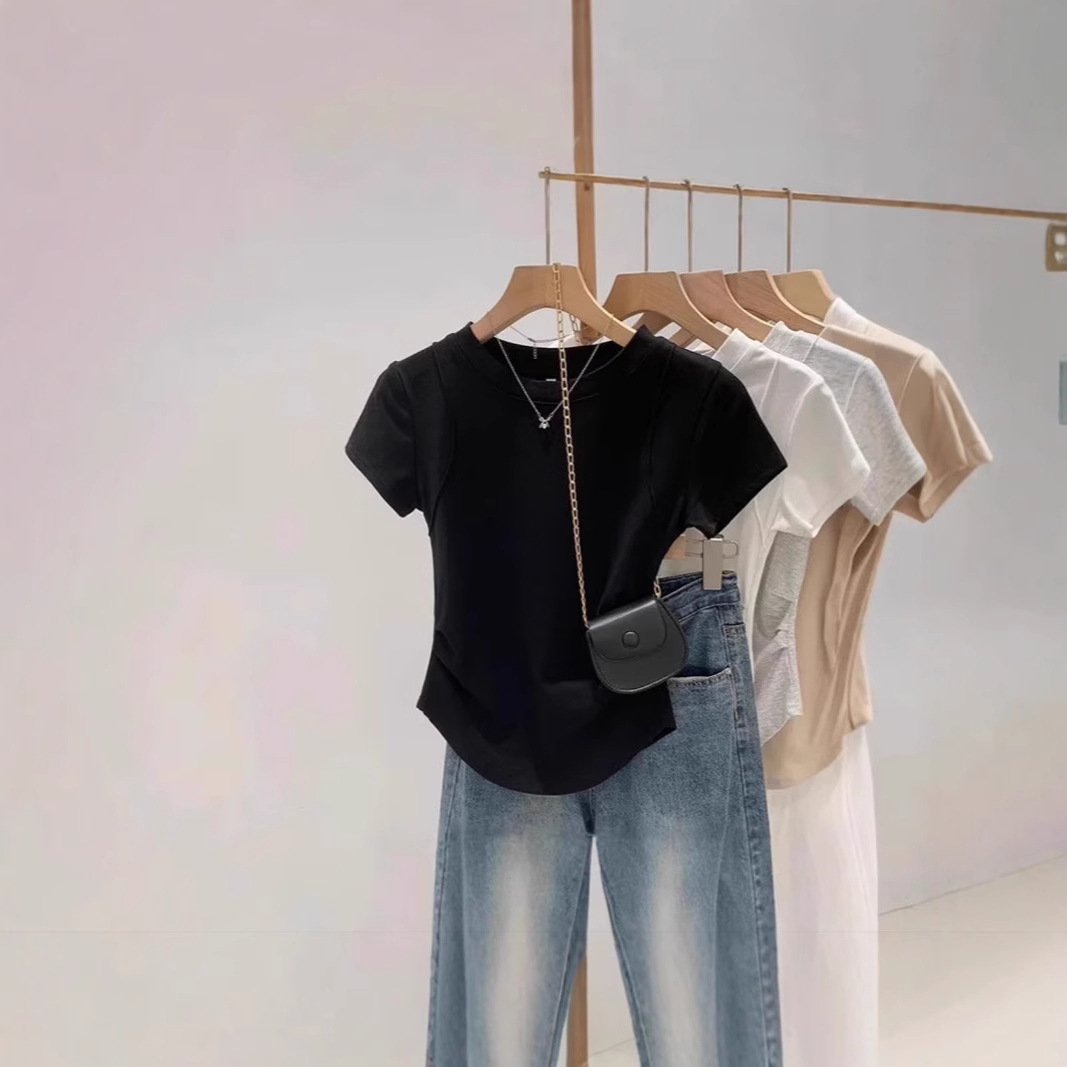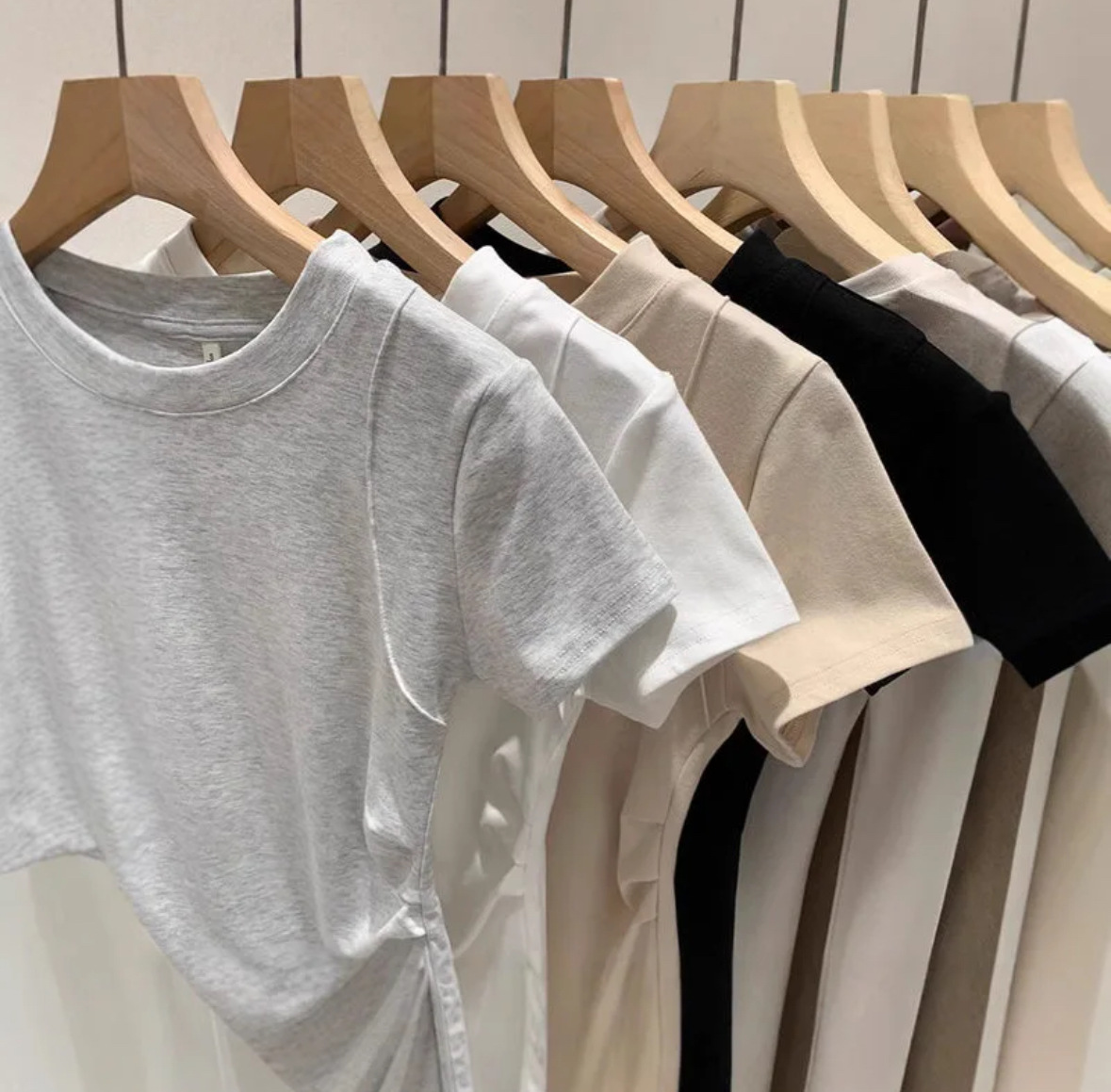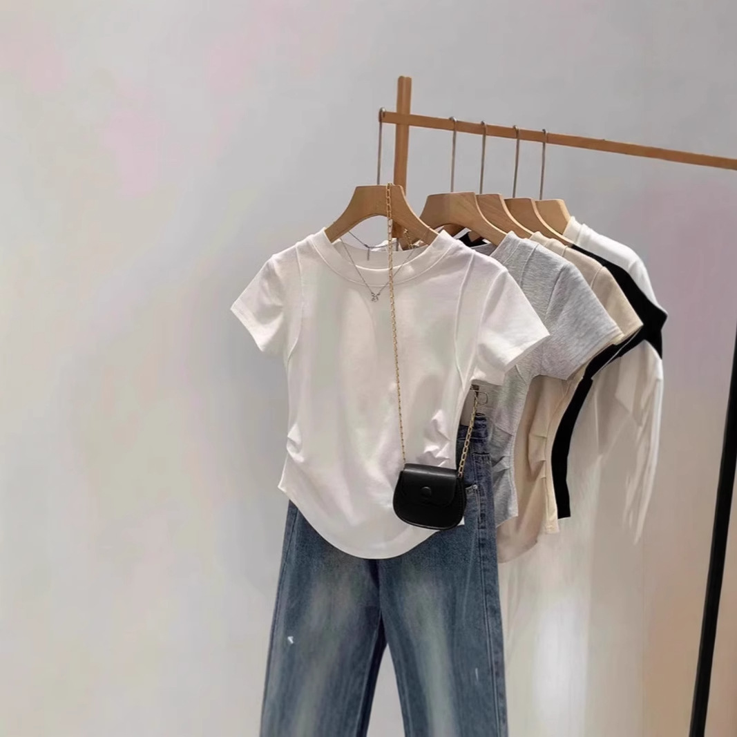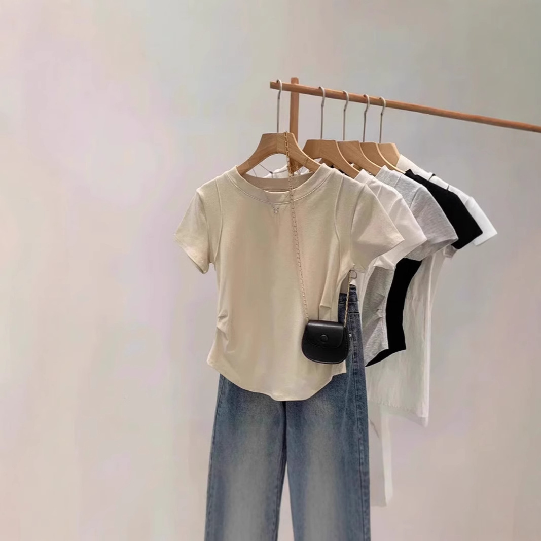코튼 허리 불규칙한 반팔 티셔츠 여성 여름 디자인 센스 2025 새로운 스타일 슬리밍 올매치 탑 트렌디 숄더스토어 가기