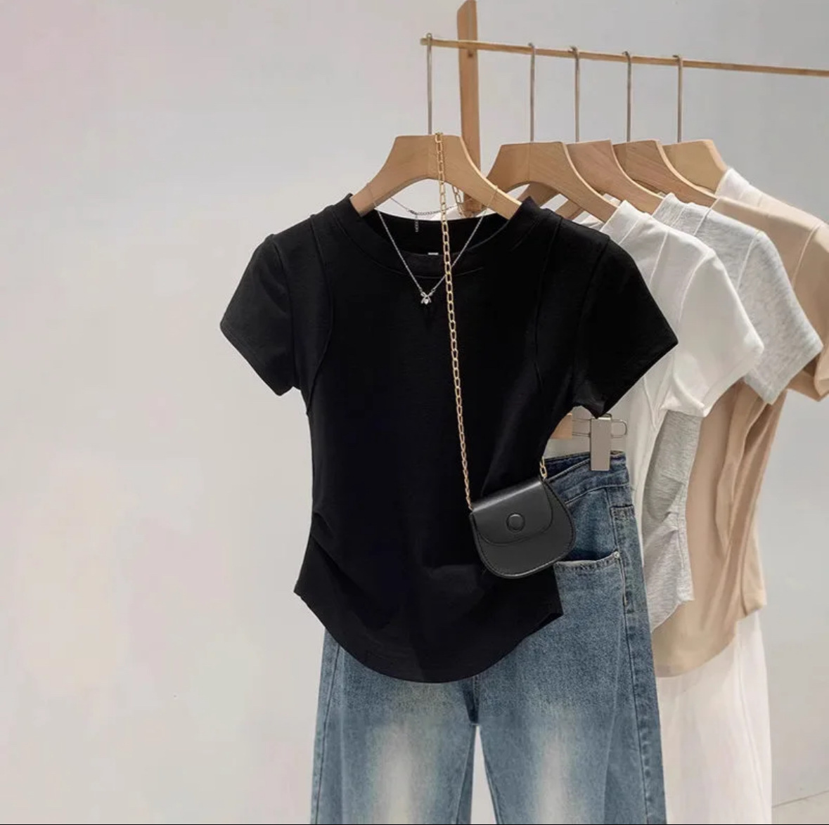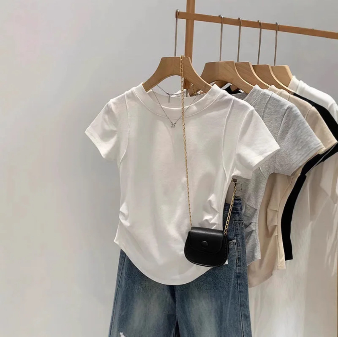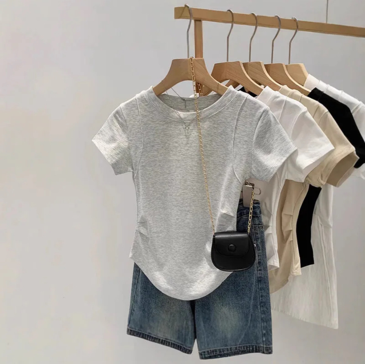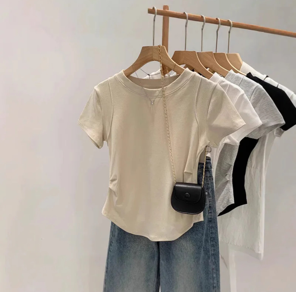 코튼 허리 불규칙한 반팔 티셔츠 여성 여름 디자인 센스 2025 새로운 스타일 슬리밍 올매치 탑 트렌디 숄더스토어 가기