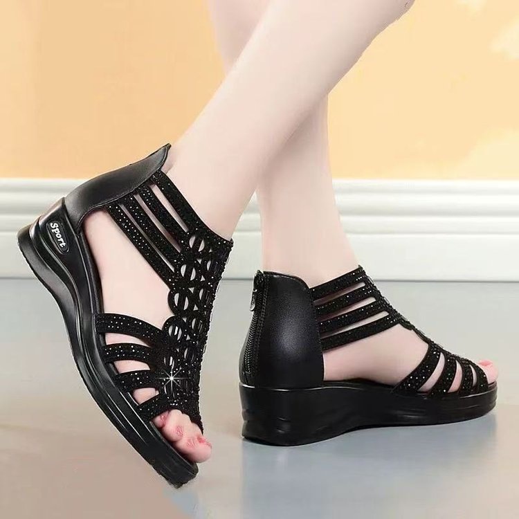 샌들 여성 여름 쐐기 2025 뉴 로마 어머니 라인스톤 물고기 입 미들 힐 여성의 부드러운 바닥 오픈 발가락 중년 샌들