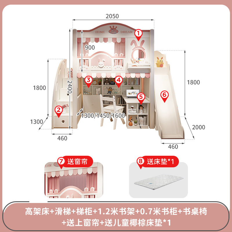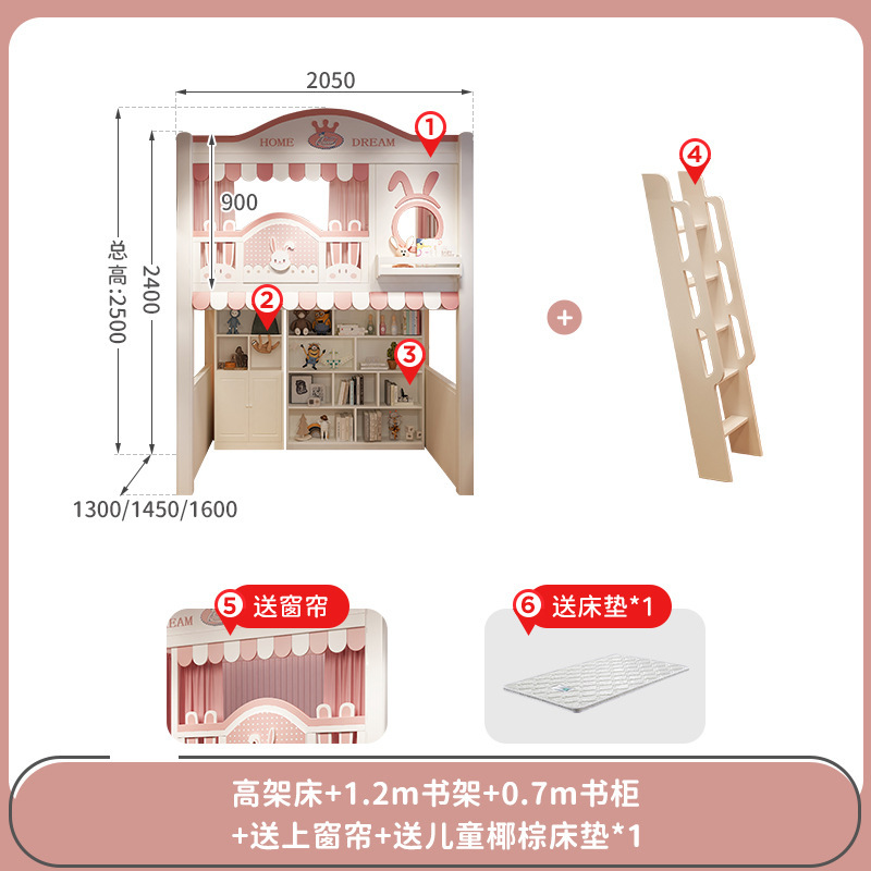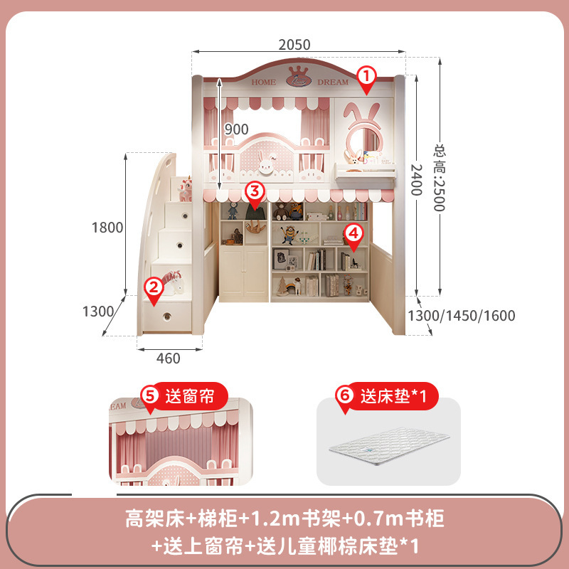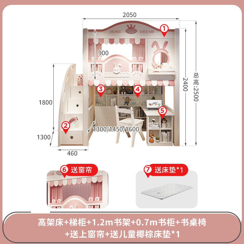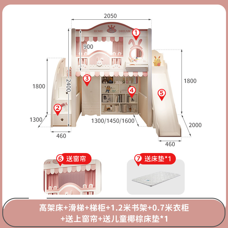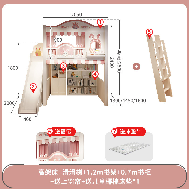 • Q 스타일 로프트 침대 + 사다리 수납장 + 슬라이드 + 1.2m 책장 + 0.7m 책장