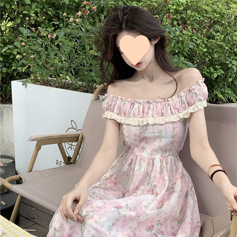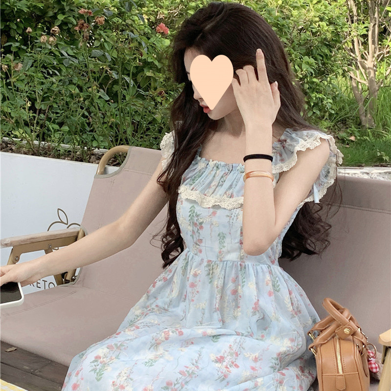 달콤한 러플 레이스 스퀘어 칼라 플라잉 슬리브 꽃 원피스 여름 새로운 우아한 타이트 허리 슬리밍 원피스스토어 가기