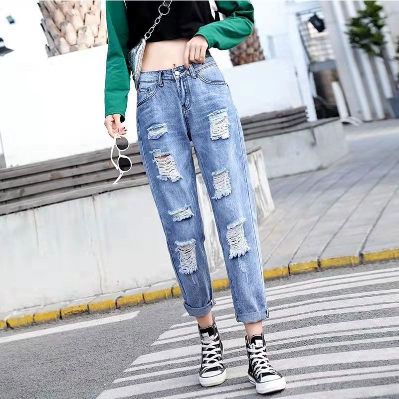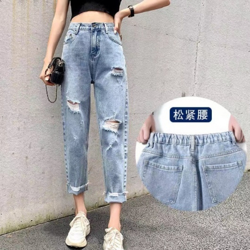 엘라 스토 탄성 허리 찢어진 청바지 여성 높은 허리 2025 새 봄 가을 여름 플러스 사이즈 통통한 소녀 할란 아빠를위한 느슨한 바지스토어 가기