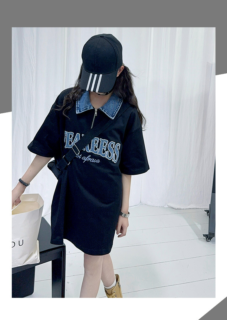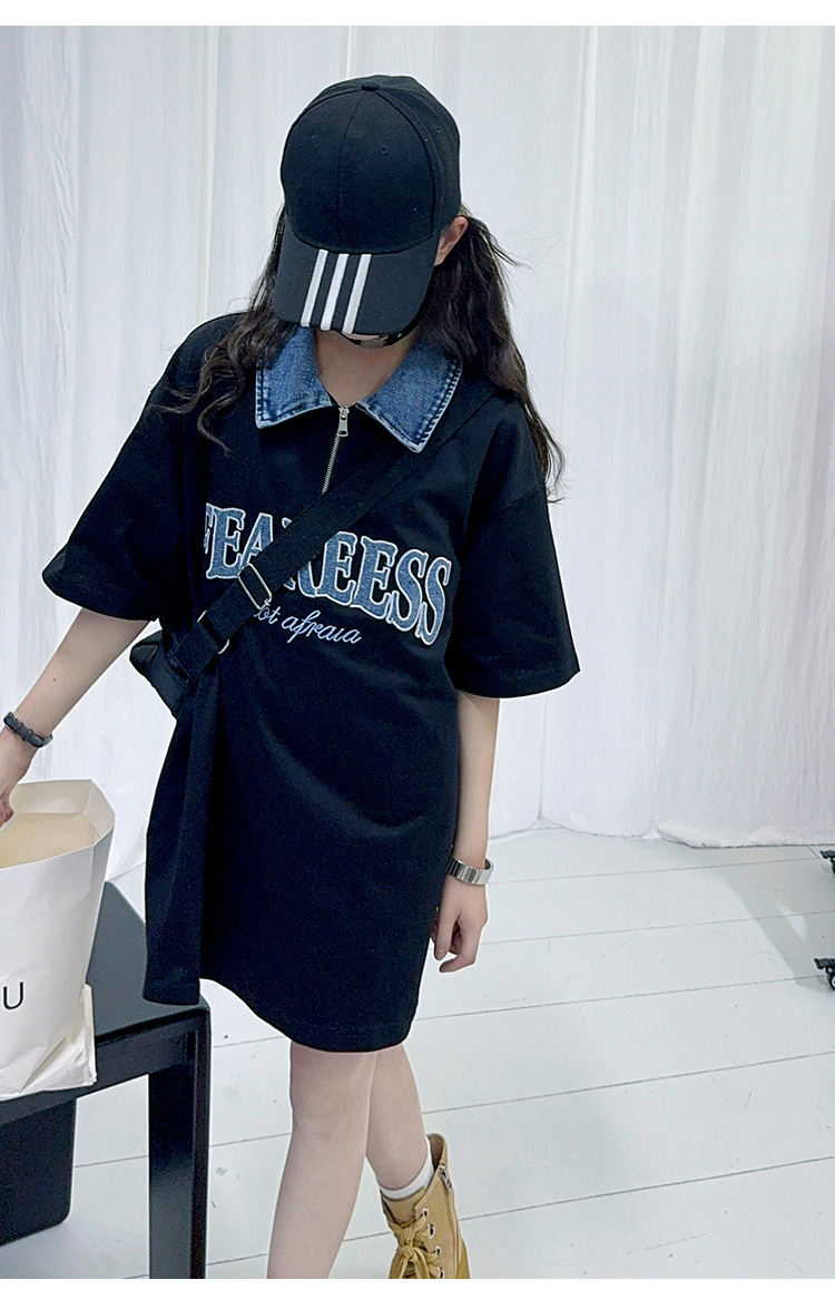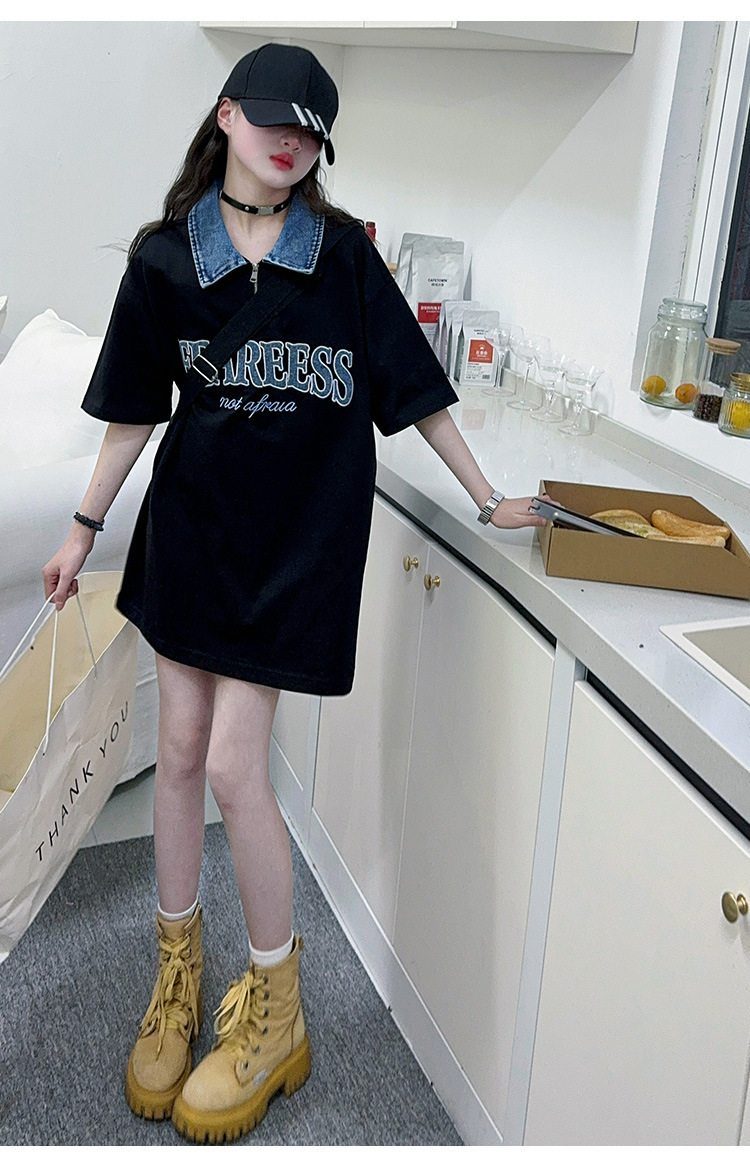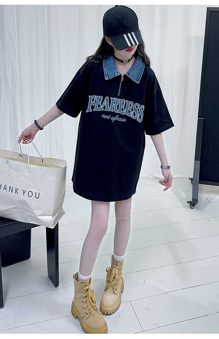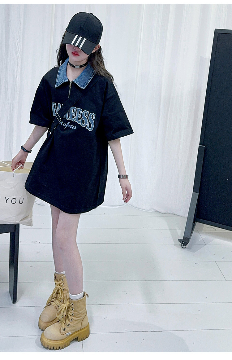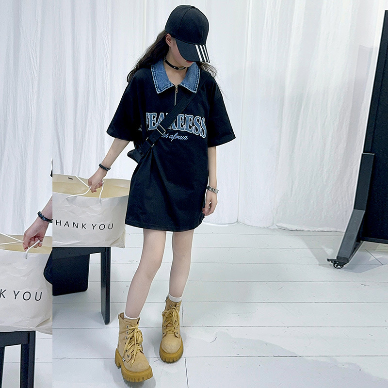 소녀 아메리칸 자수 콘트라스트 컬러 스티칭 데님 폴로 셔츠 반팔 티셔츠 여름 큰 어린이 대학 스타일 캐주얼 탑스토어 가기