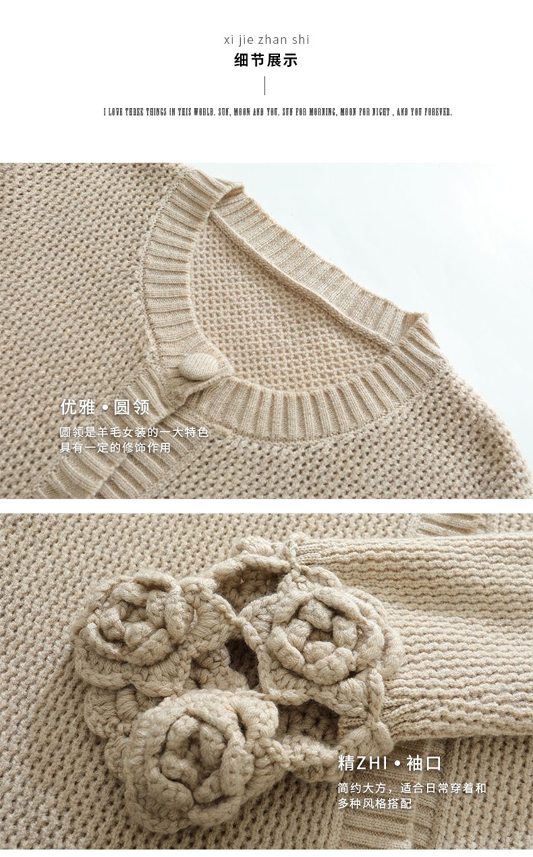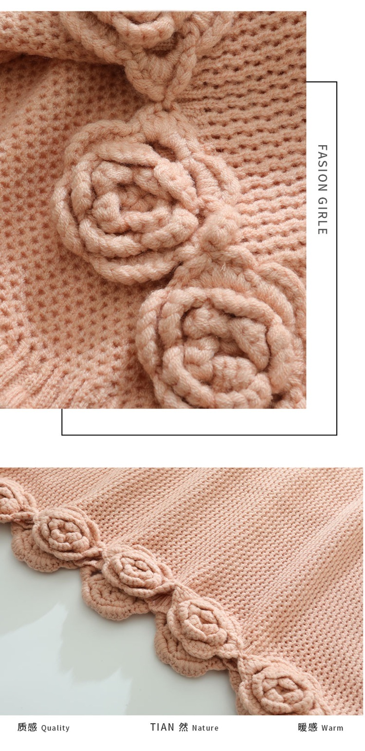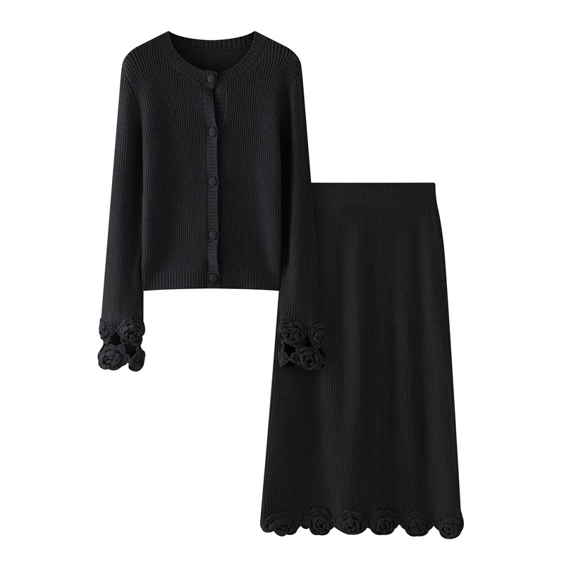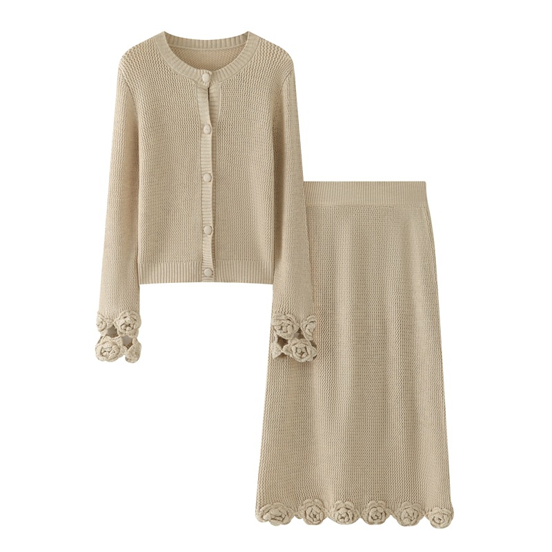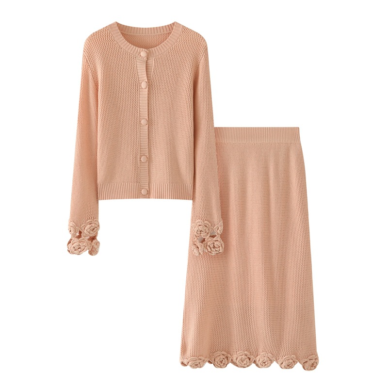 가을과 겨울 새로운 할로우 손으로 만든 크로 셰 뜨개질 양모 원피스 크루 넥 스웨터 카디건 니트 오버 스커트 세트 여성용 투피스 세트