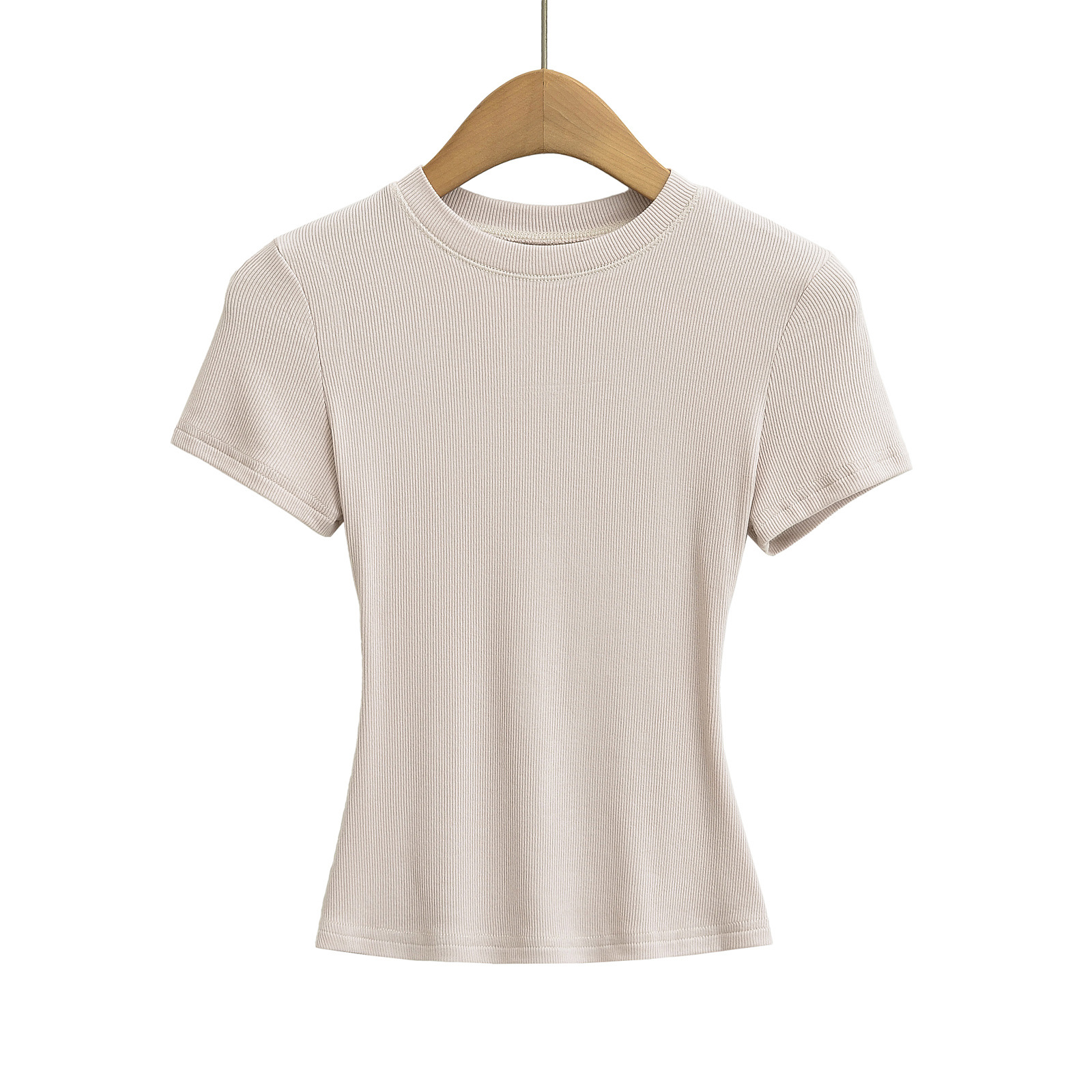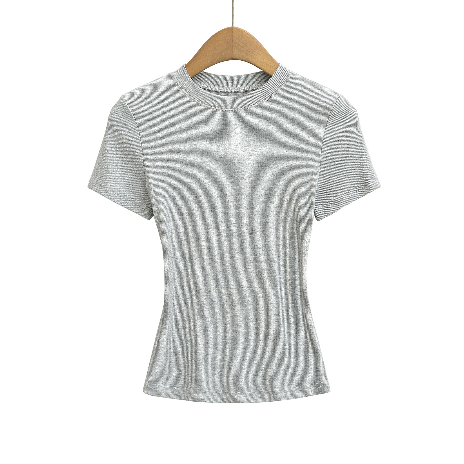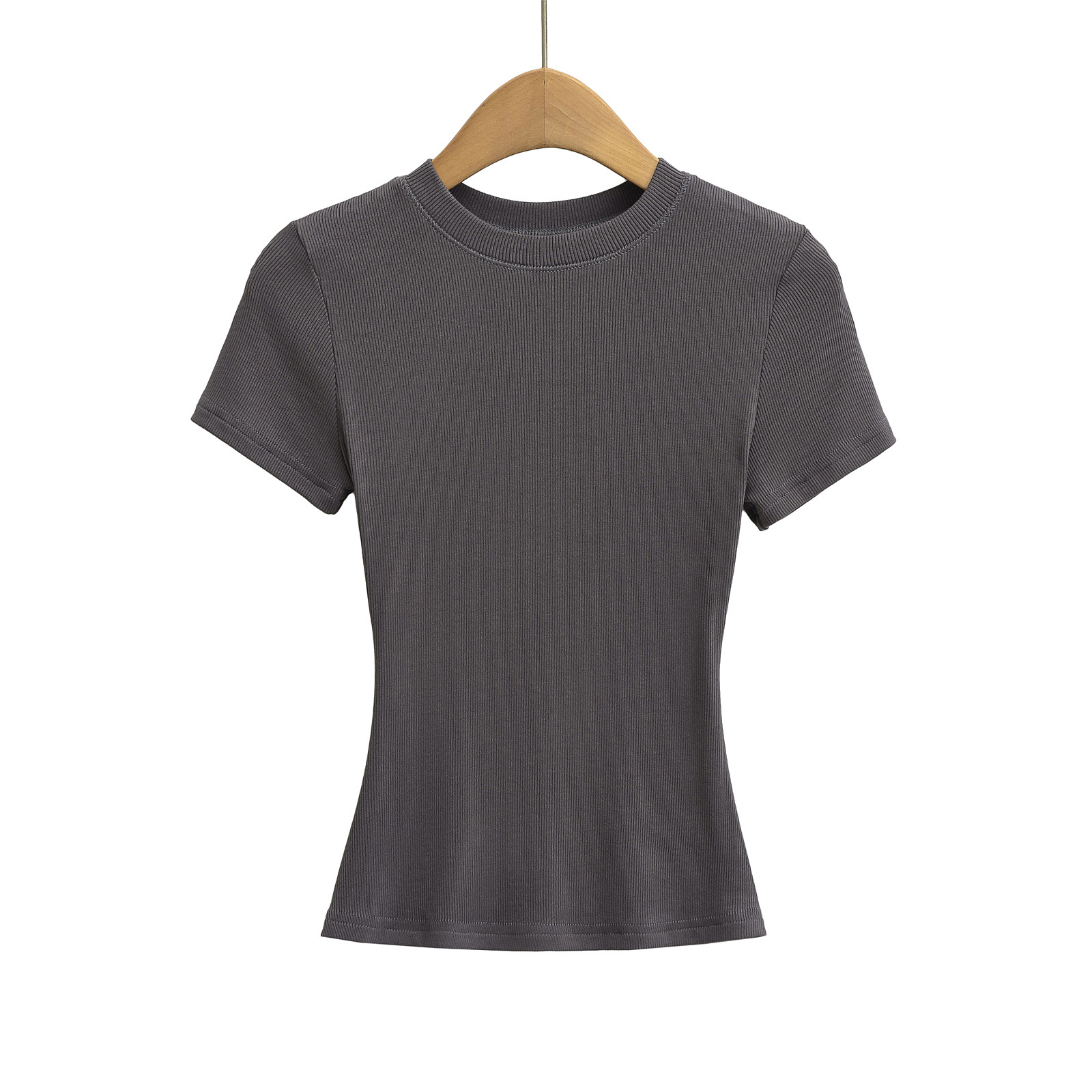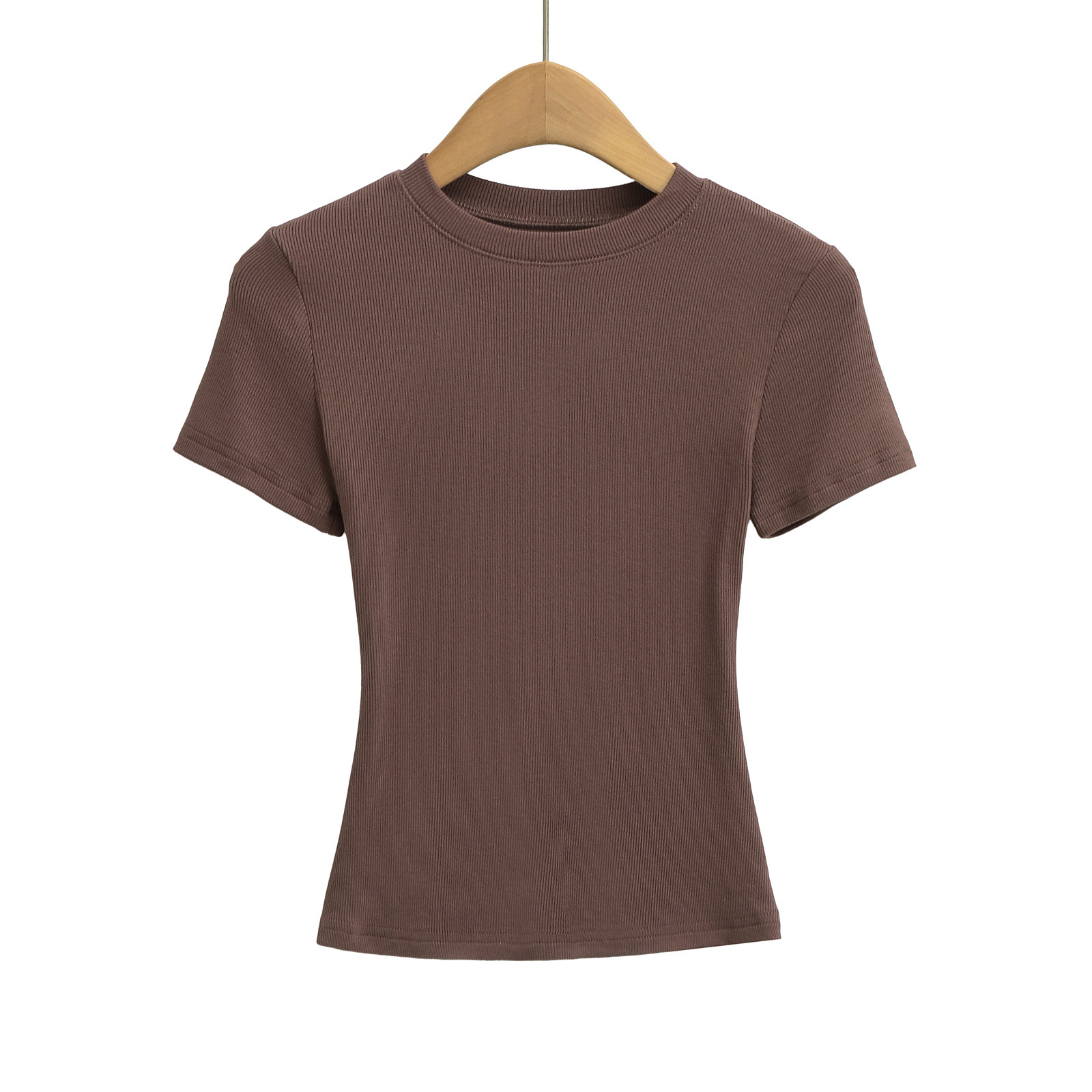 2025 Hot Girl Threaded Tight 반팔 티셔츠 여성 여름 슬림 피트 작은 라운드 넥 솔리드 컬러 스트레치 스포츠 탑 크로스 보더스토어 가기