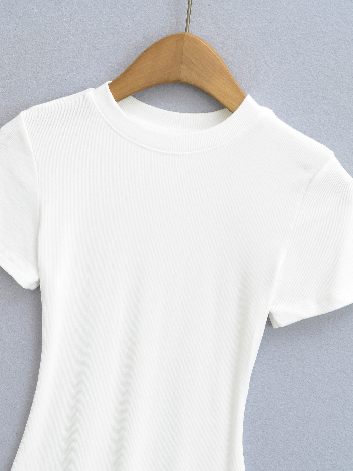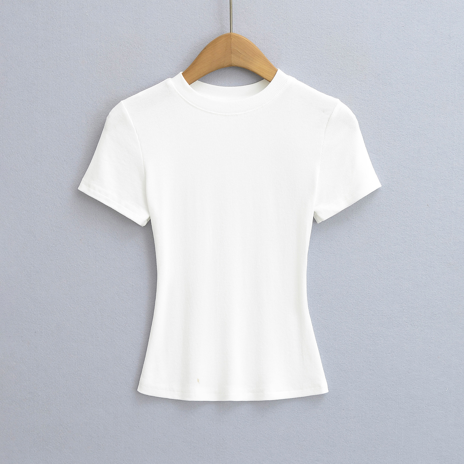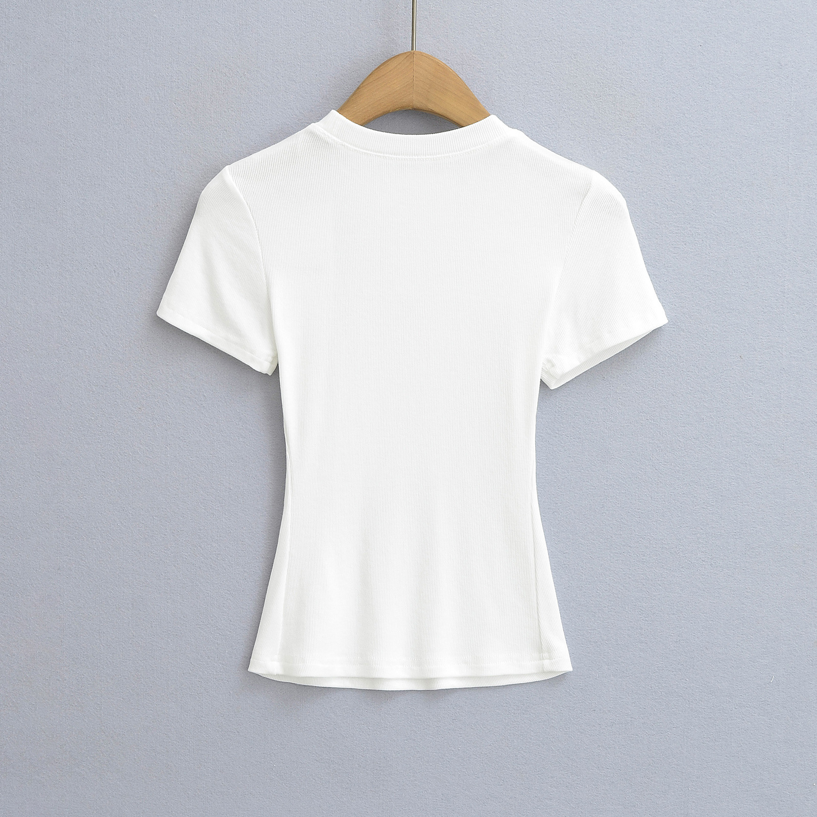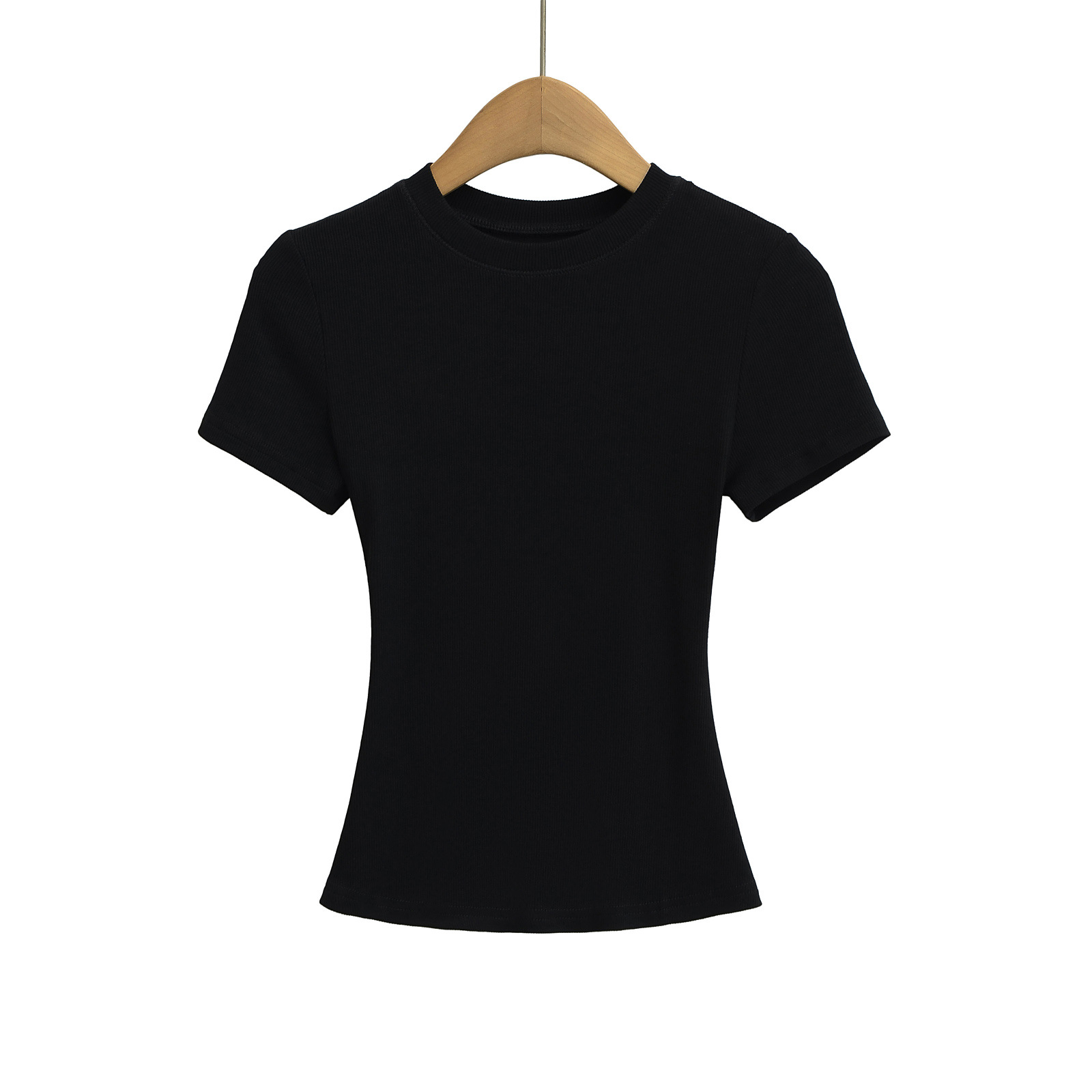 2025 Hot Girl Threaded Tight 반팔 티셔츠 여성 여름 슬림 피트 작은 라운드 넥 솔리드 컬러 스트레치 스포츠 탑 크로스 보더스토어 가기