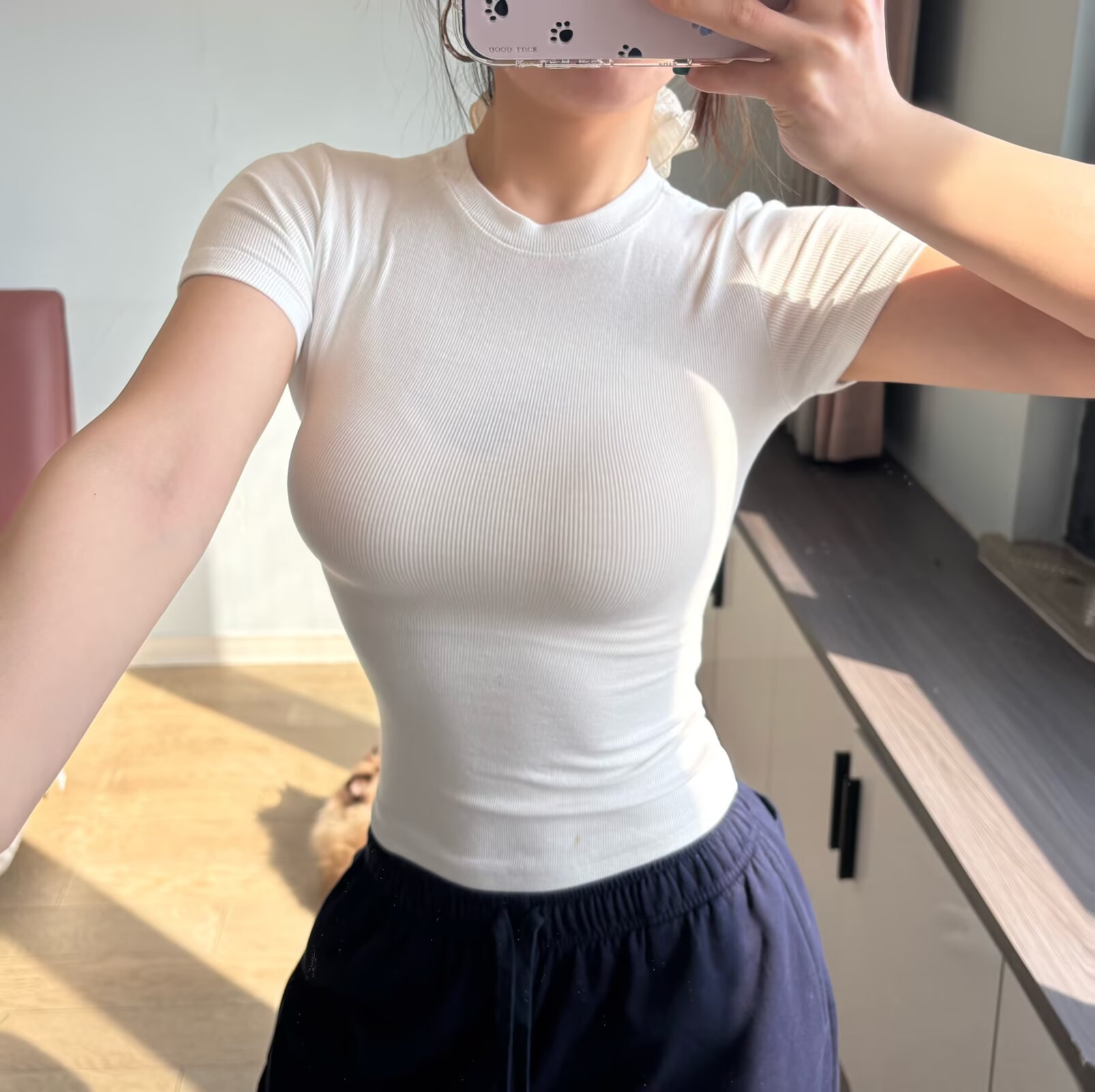 2025 Hot Girl Threaded Tight 반팔 티셔츠 여성 여름 슬림 피트 작은 라운드 넥 솔리드 컬러 스트레치 스포츠 탑 크로스 보더
