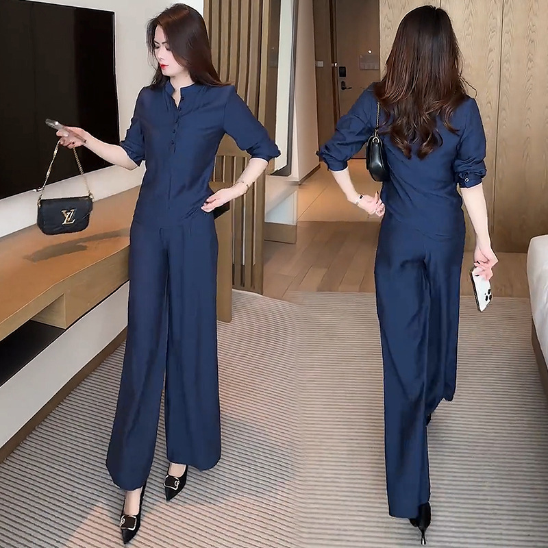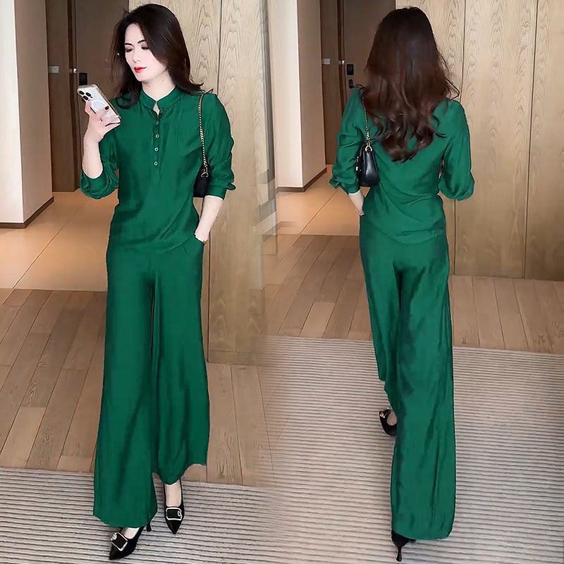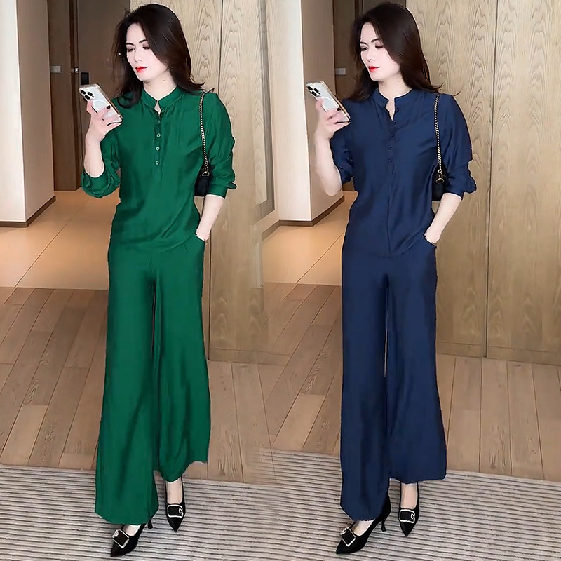 패션 세트 여성 2025 봄 새로운 외국 우아한 슬림 V 넥 셔츠 높은 허리 넓은 다리 바지 대외 무역 투피스 세트스토어 가기