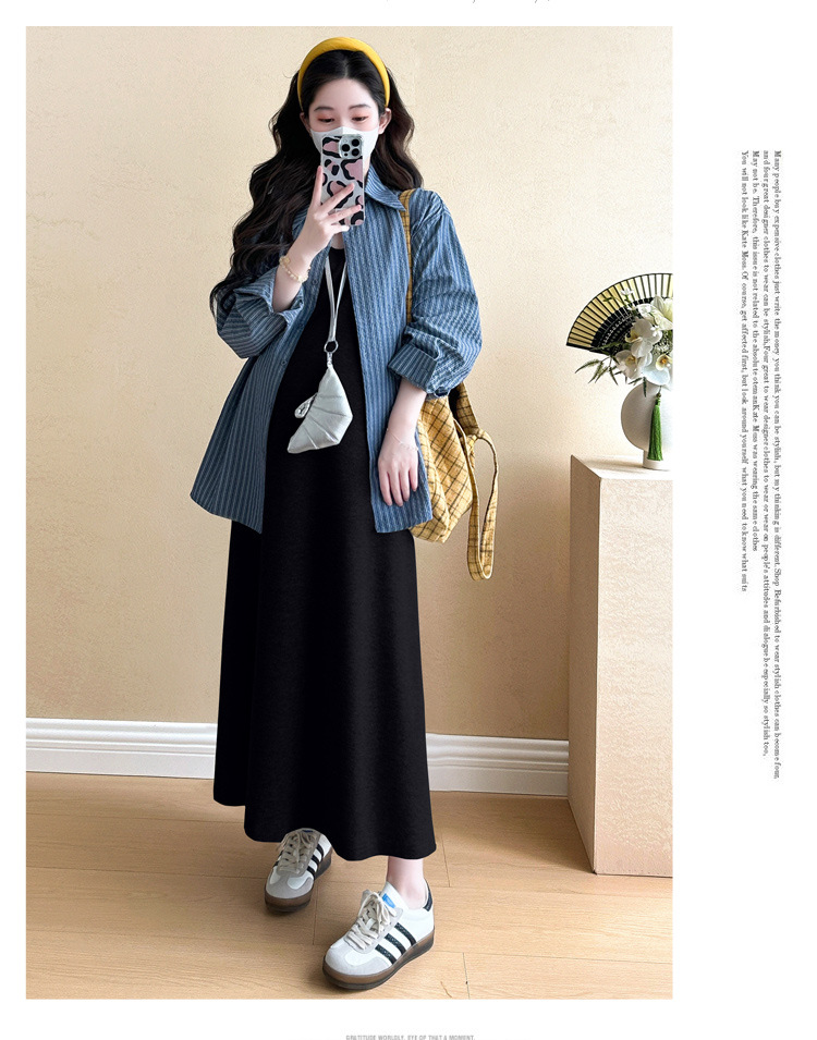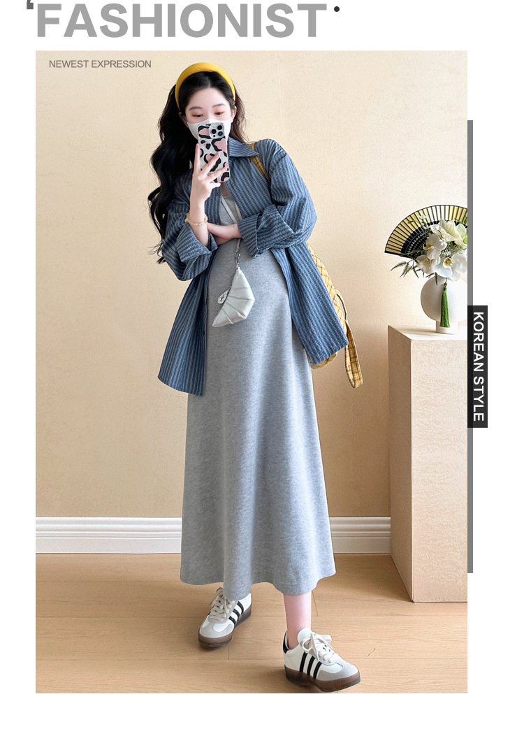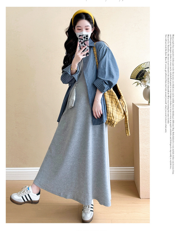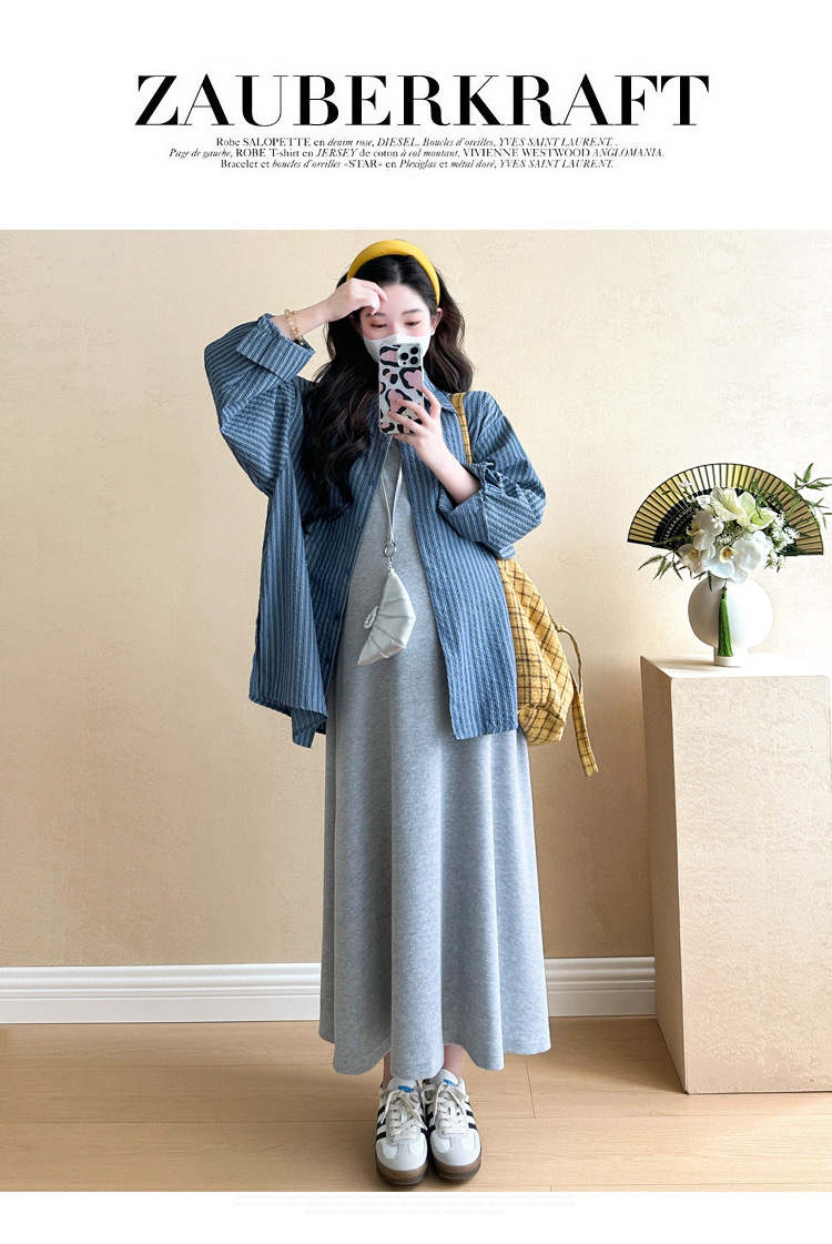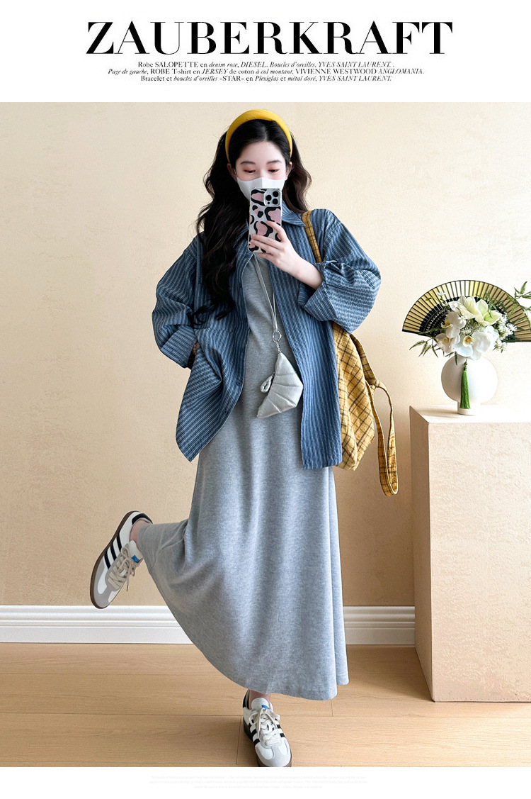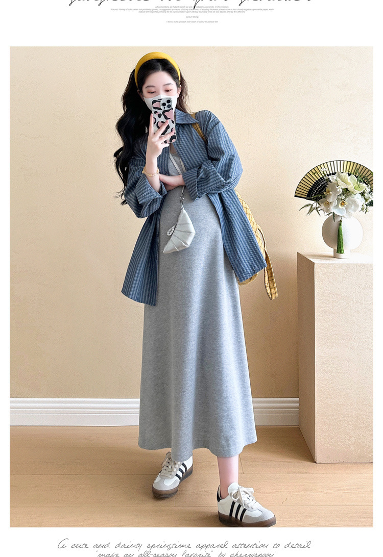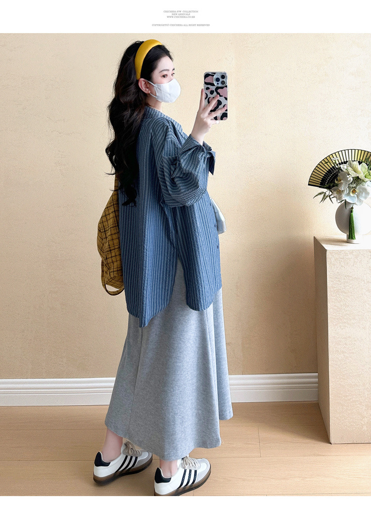 출산 2025 새로운 한국 패션 느슨한 슬림 빅 원피스 줄무늬 셔츠 투피스 캐주얼 세트