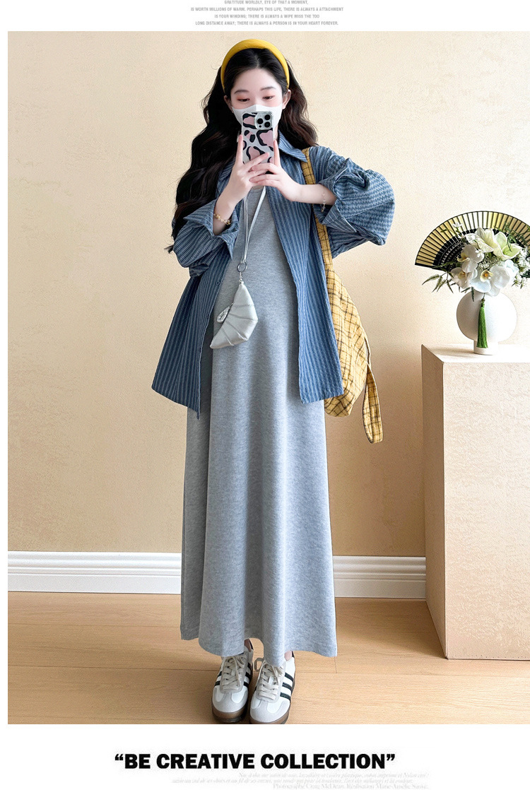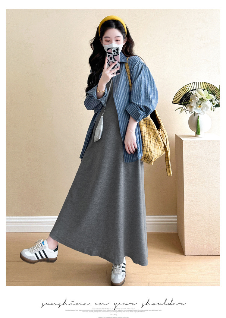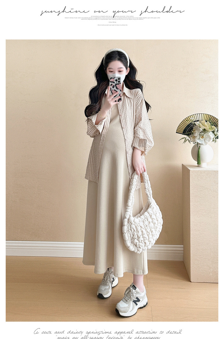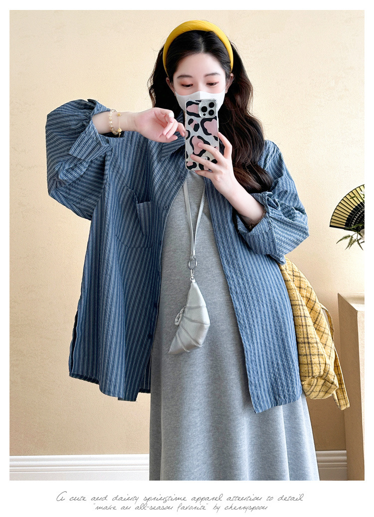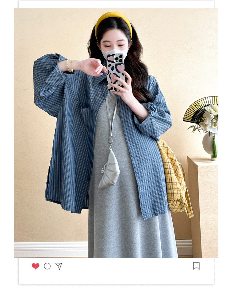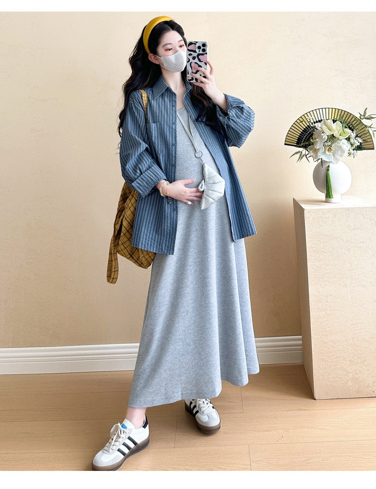 출산 2025 새로운 한국 패션 느슨한 슬림 빅 원피스 줄무늬 셔츠 투피스 캐주얼 세트