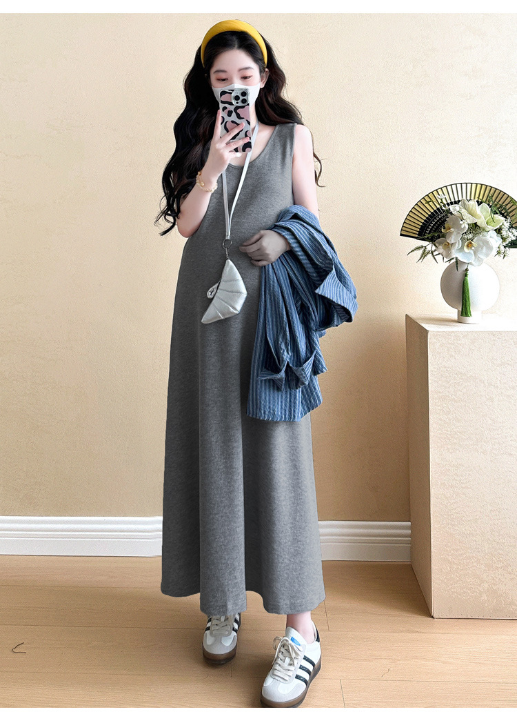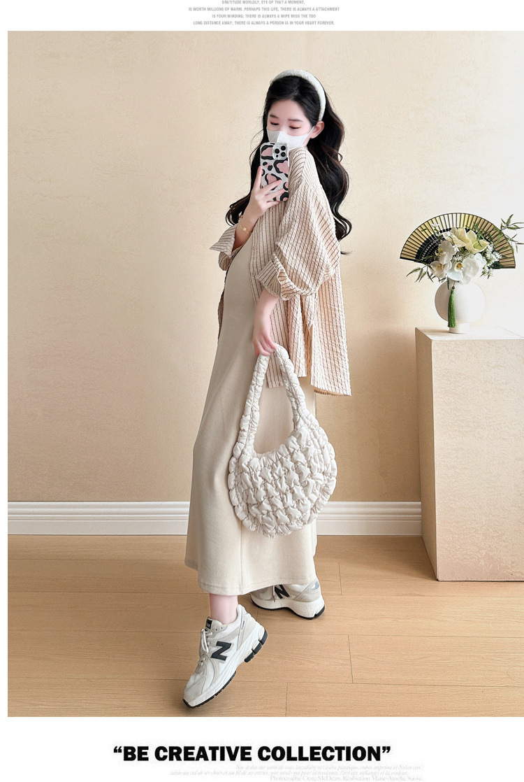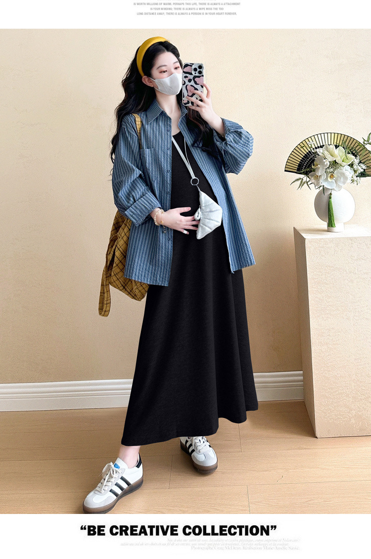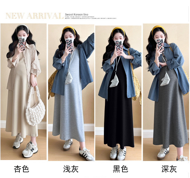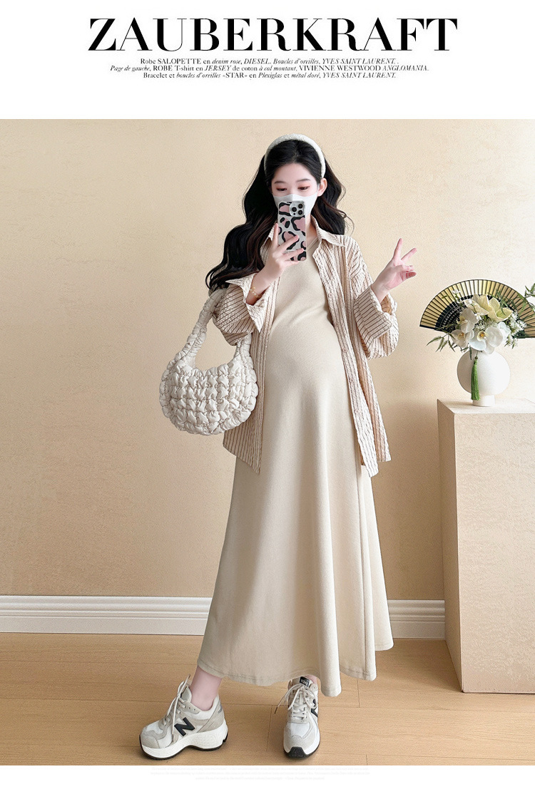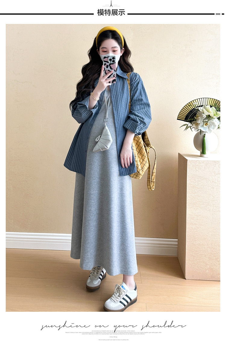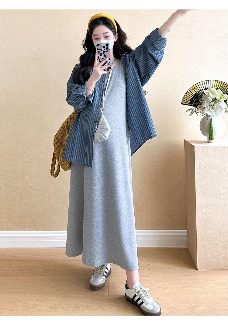 출산 2025 새로운 한국 패션 느슨한 슬림 빅 원피스 줄무늬 셔츠 투피스 캐주얼 세트