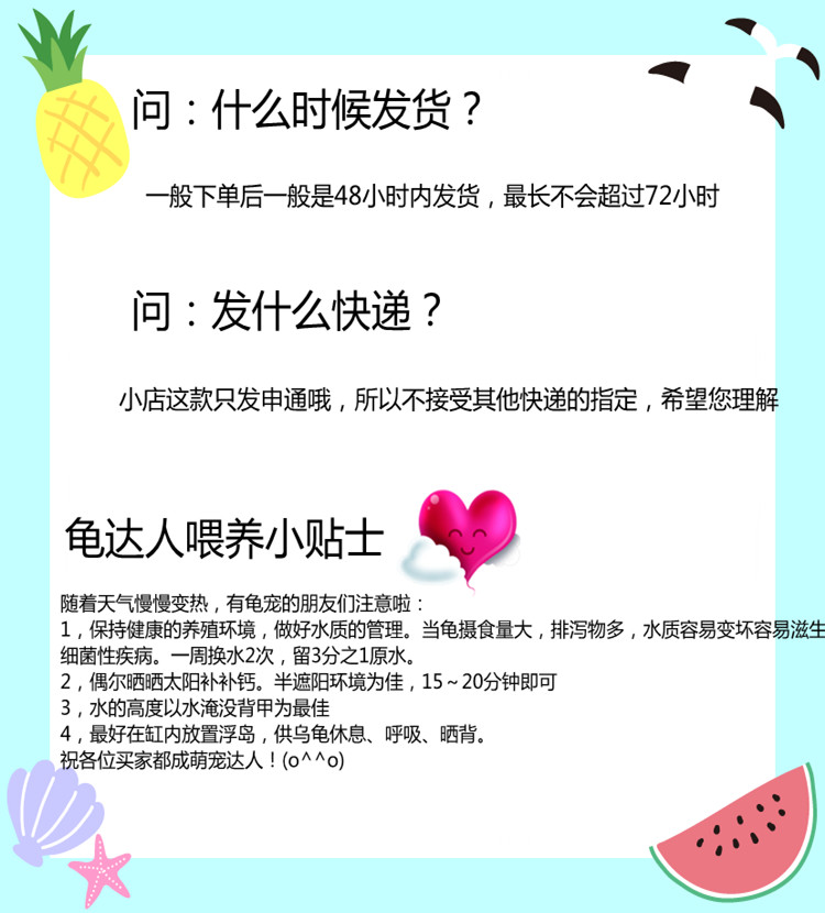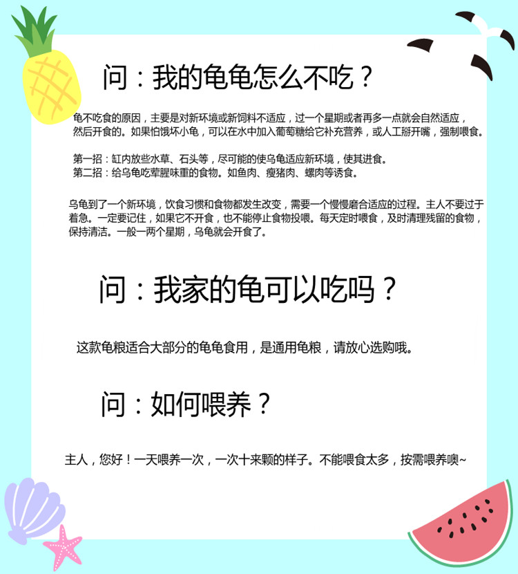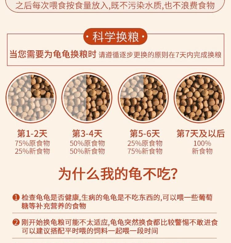 龟不吃食的原因,主要是对新环境或新饲料不适应,过一个星期或者再多一点就会自然适应,然后开食的。如果怕饿坏小龟,可以在水中加入葡萄糖给它补充营养食。招:缸内放些水草、石头等,尽可能的使乌龟适应新环境,使其进食。第二招:给乌龟吃荤腥味重的食物。如鱼肉、瘦猪肉、螺肉等一起喂食,切碎搅拌喂食。第三招:饿几天,然后喂食。饥饿状态也容易进食。第四招:配合原饲料一起喂食,原饲料为主,新饲料为辅,慢慢改变新饲料、原饲料的比例,乌龟更容易接受。(推荐)不需要盯着乌龟进食,放在水里或者晒台上就好了。新买的乌龟怕生,可能有人不会进食,等你走了它会偷偷吃。过一阵子去看看就好了。水温25度左右容易进食,也可以买加热棒人工控温,请不要次喂食不吃就着急,乌龟需要适应,一般一周左右会开食,特殊情况可能要1-2周时间(个别)。
