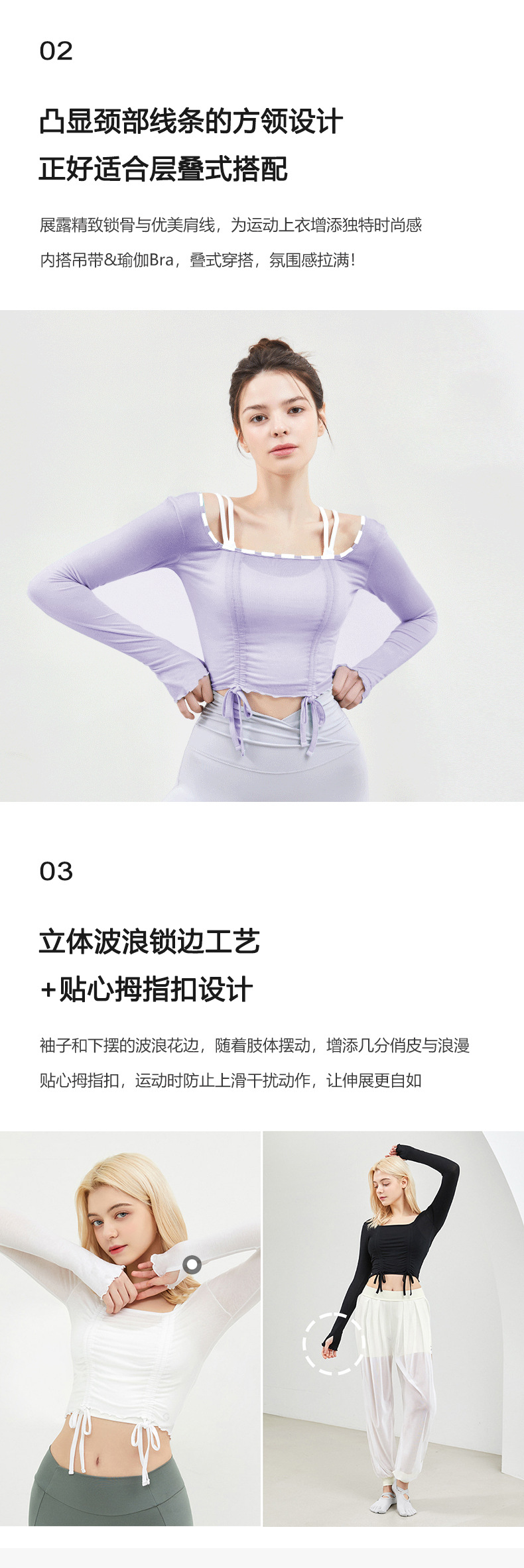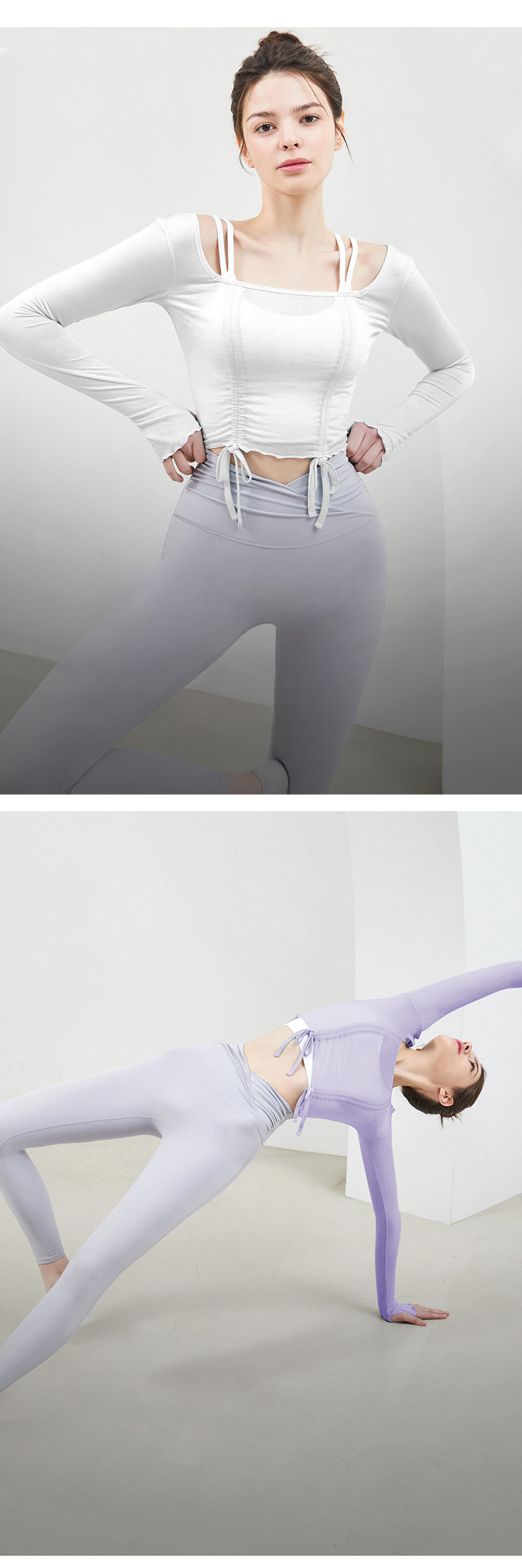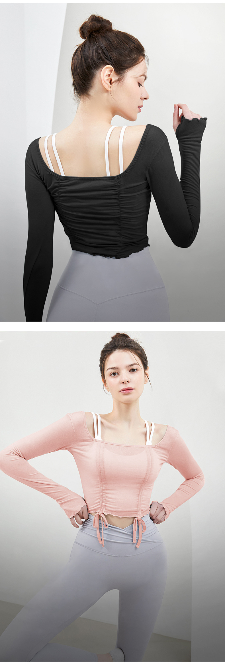 새로운 드로스트링 주름 스퀘어 칼라 긴 소매 스포츠 티셔츠 여성 패션 스트랩 메쉬 요가 탑 아우터베이스 셔츠