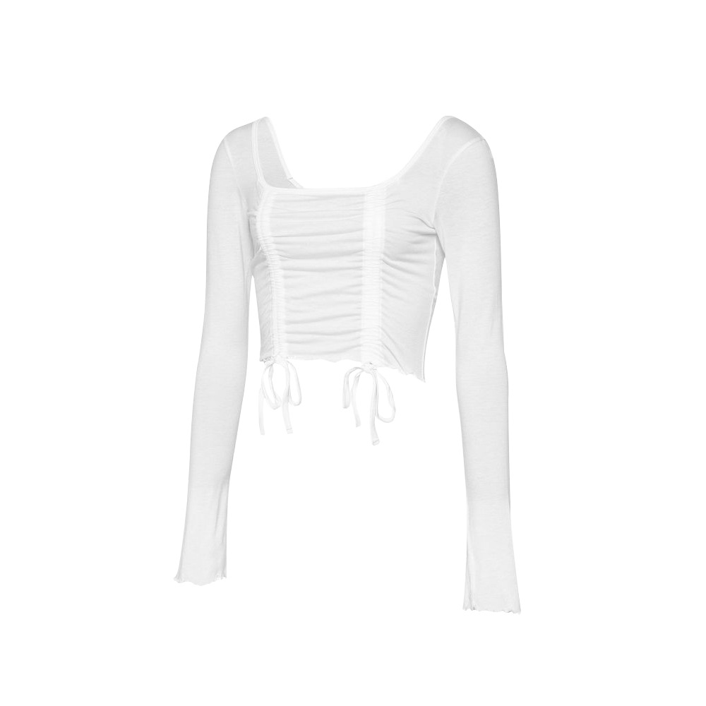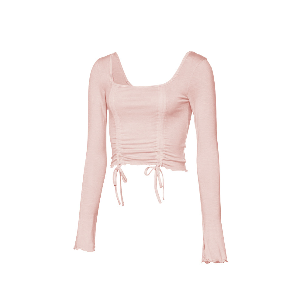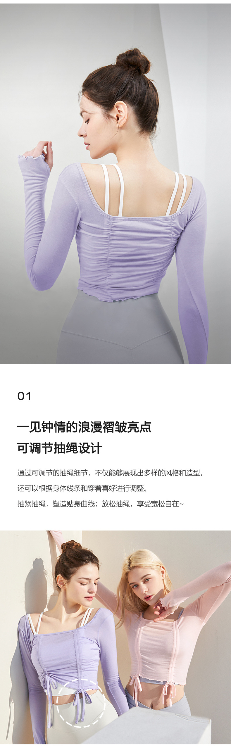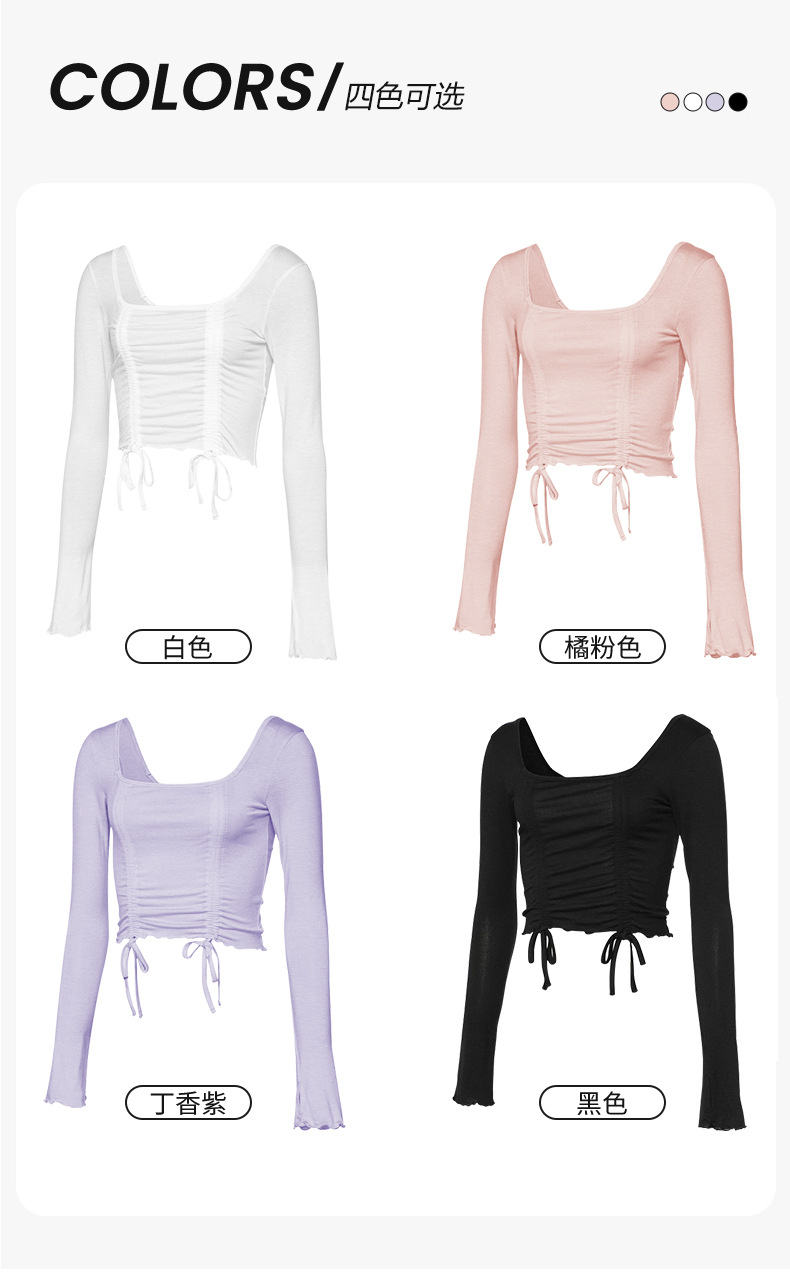 새로운 드로스트링 주름 스퀘어 칼라 긴 소매 스포츠 티셔츠 여성 패션 스트랩 메쉬 요가 탑 아우터베이스 셔츠