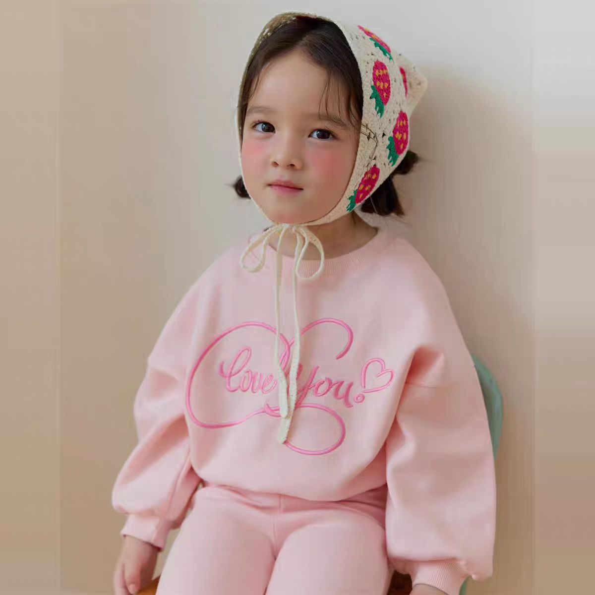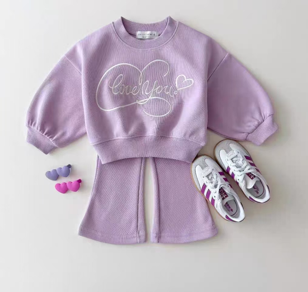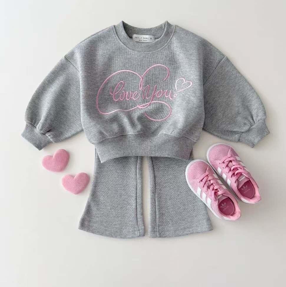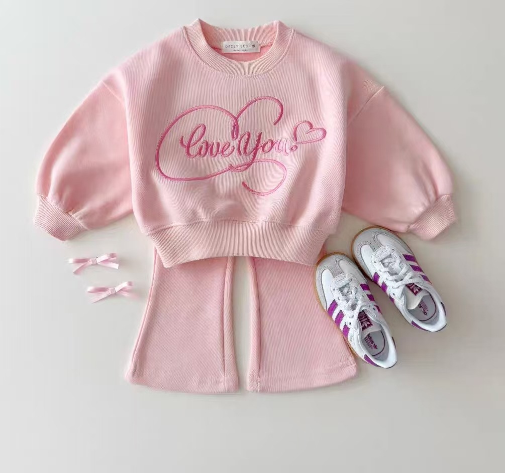 새로운 한국어 스타일 유아 및 아동 의류 소녀 봄, 가을 의류 새로운 수 놓은 짧은 운동복 벨 바닥 정장 투피스 세트