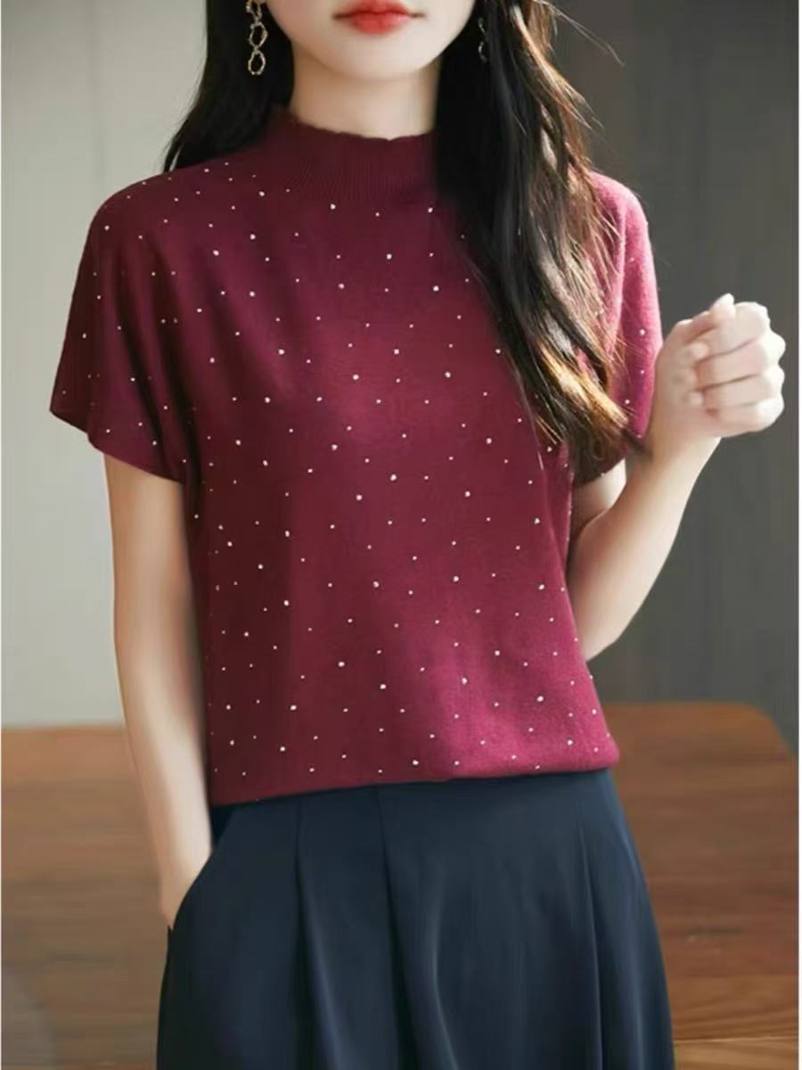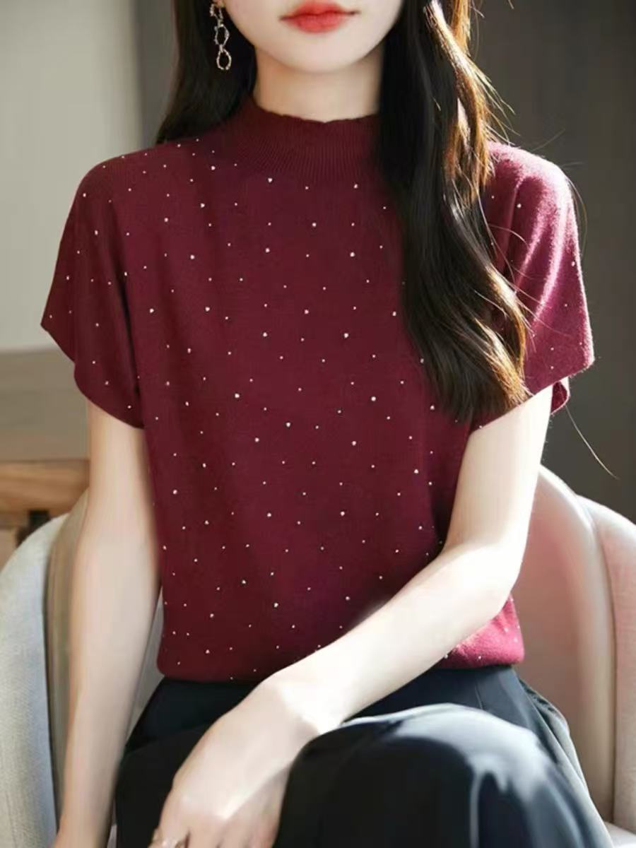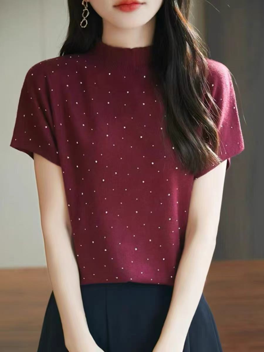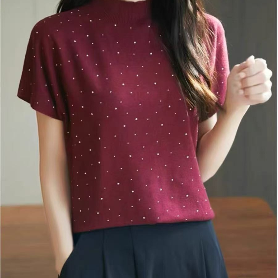가벼운 럭셔리 여성 의류 한국 스타일 우아한 톱 2025 여름 새로운 도착 모의 높은 목 짧은 소매 폴로 도트 얇은 올 매치 티셔츠