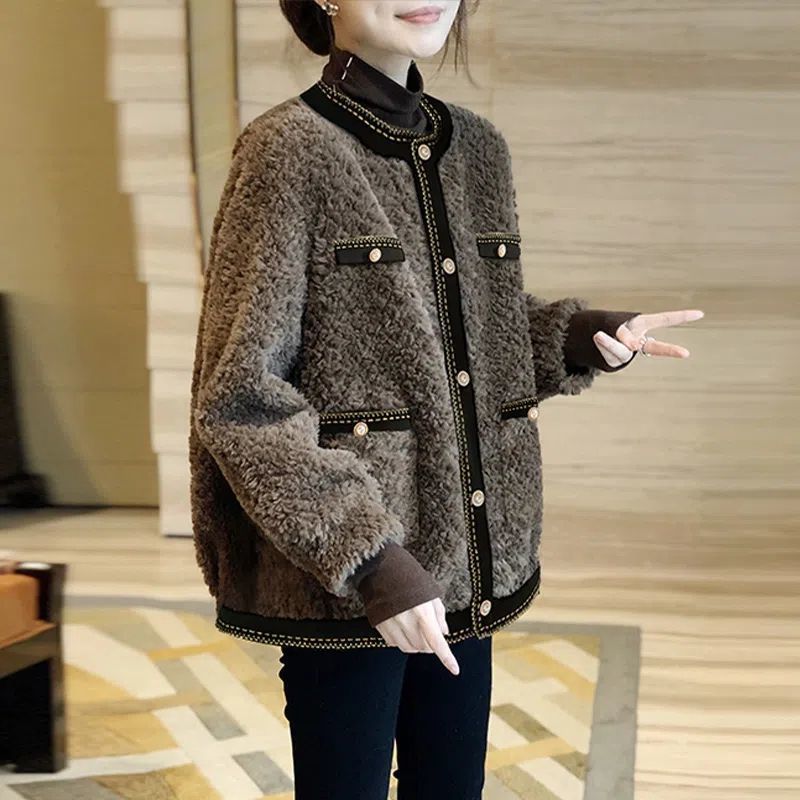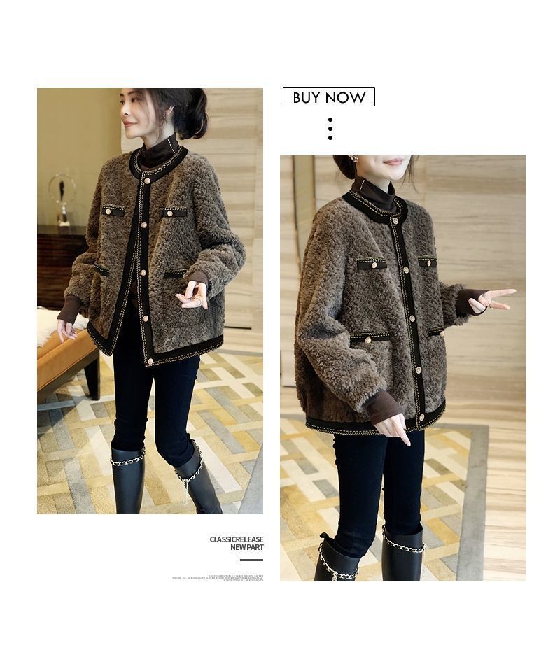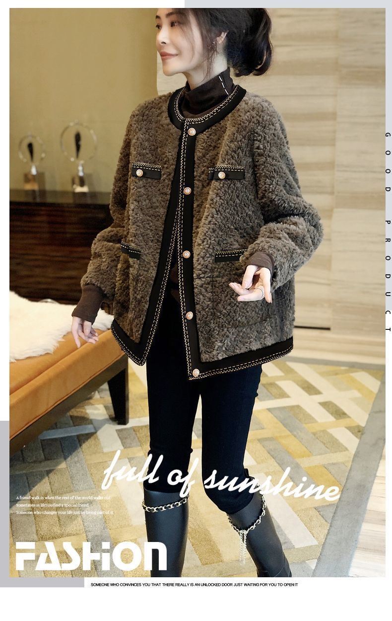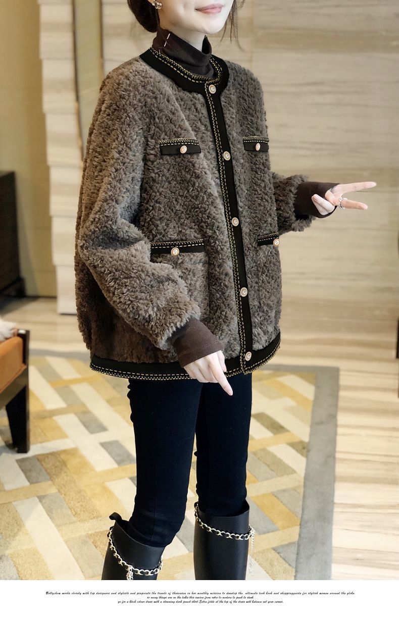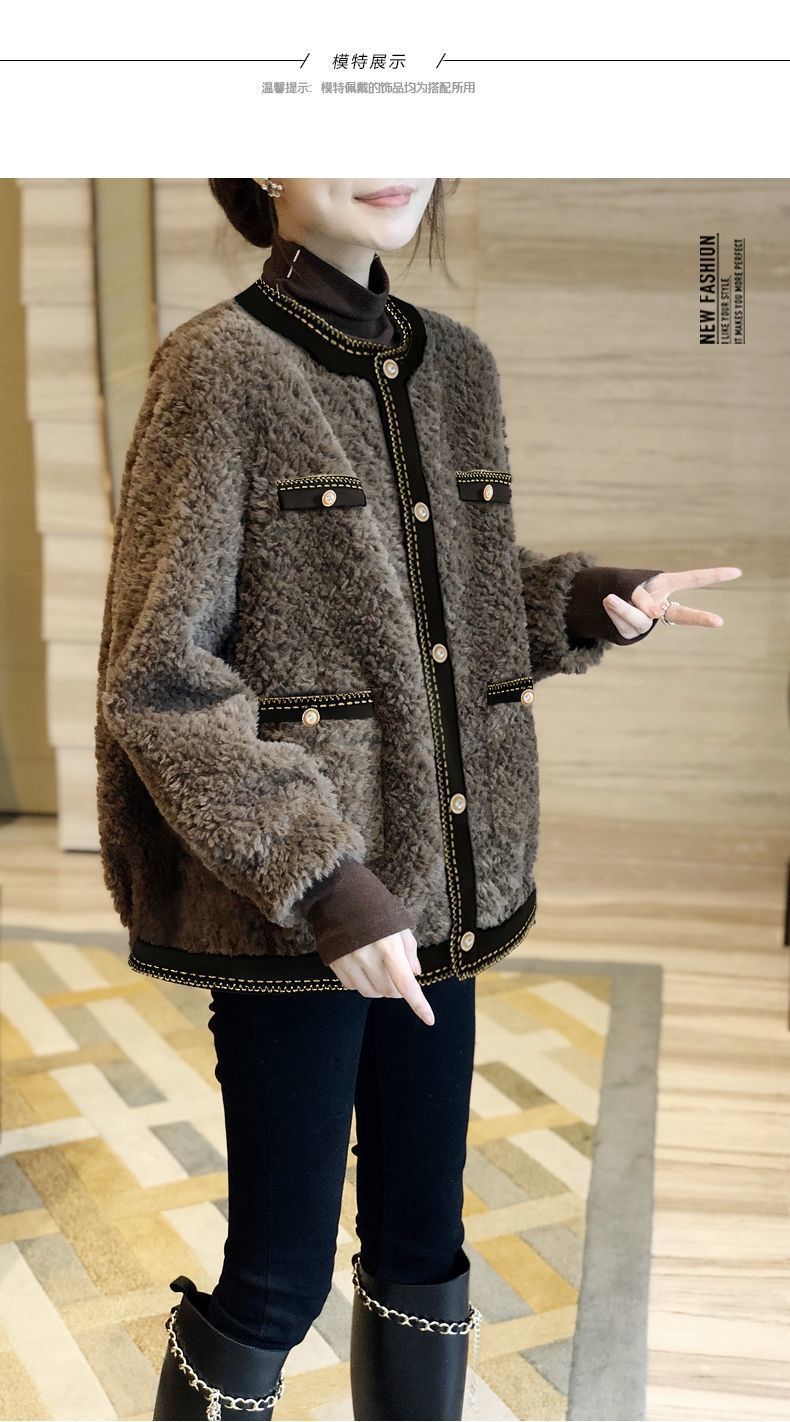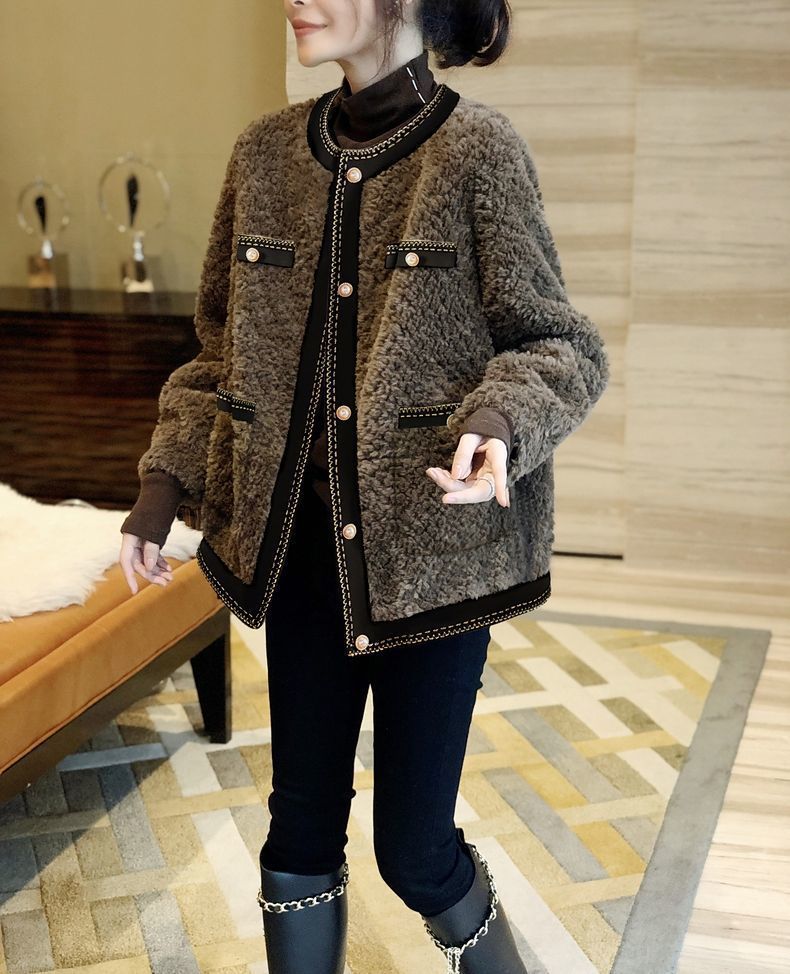 다크 브라운 샤넬 스타일 양고기 봉제 짧은 코트 여성 두꺼운 모피 원피스 탑 2024 가을 및 겨울 새로운 유럽 역스토어 가기