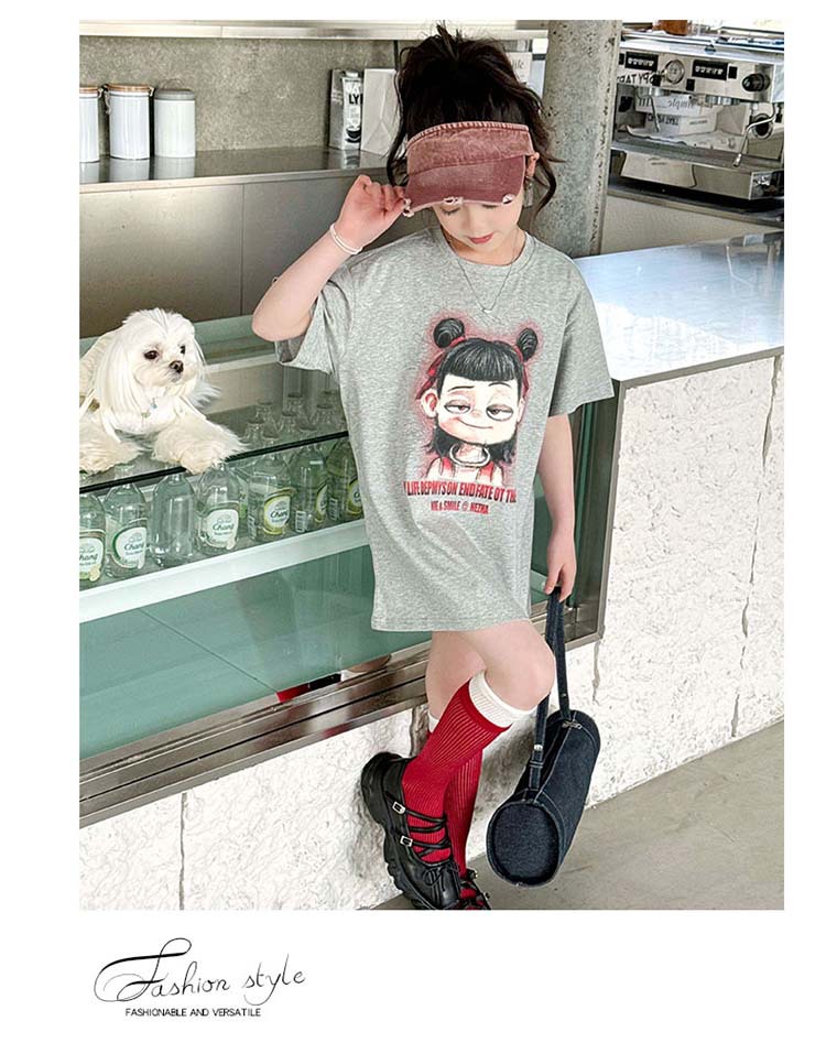 여자 반팔 티셔츠 2025 여름 새 스타일 빅 보이 걸스 서양식 만화 탑 어린이 긴 티셔츠 트렌디스토어 가기