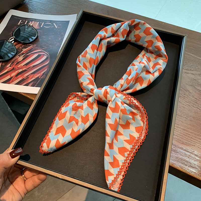 오렌지 도파민 대비 색상 기하학적 순면 실크 스카프 여성의 봄과 가을 한국 스타일 얇은 작은 광장 장식 스카프 헤드 스카프