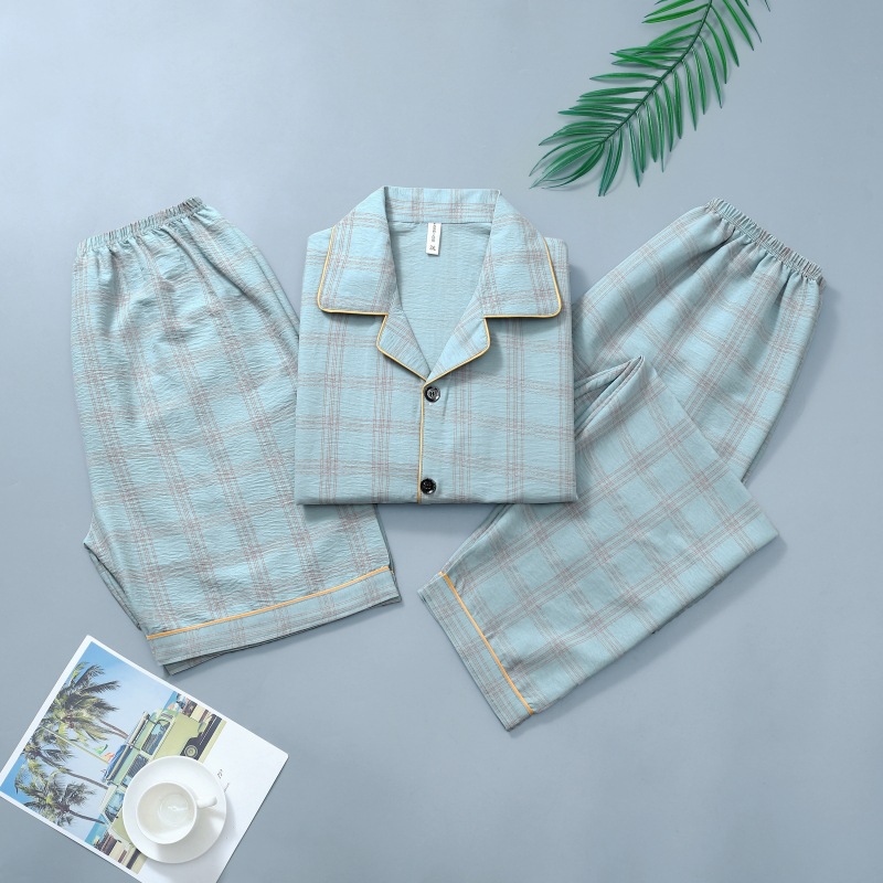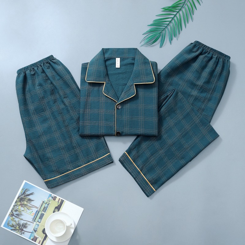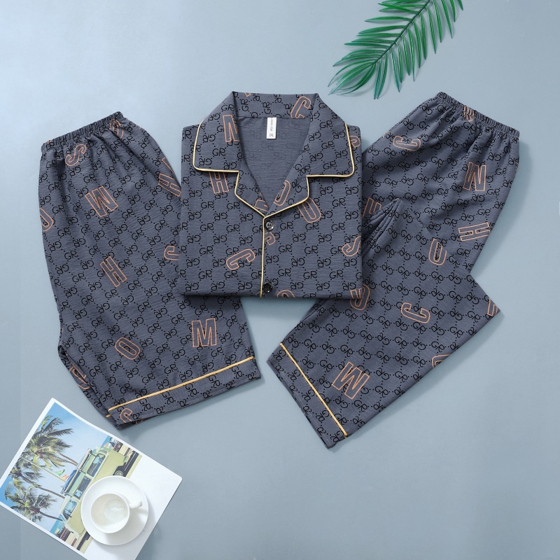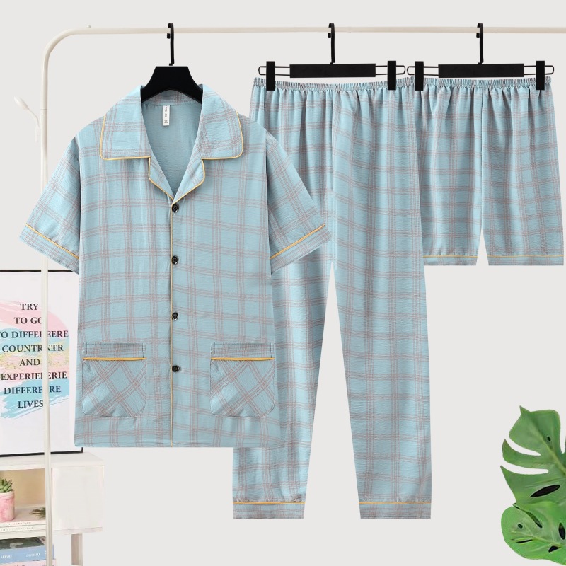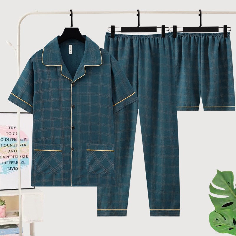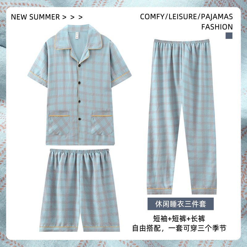 306-3 남자 잠옷 여름 면 반팔 바지 3 피스 세트 얇은 캐주얼 의상 반바지 홈 옷스토어 가기