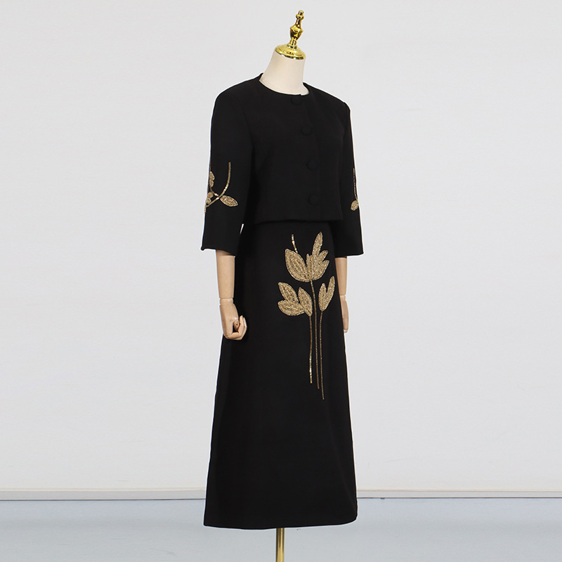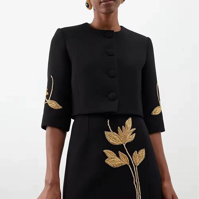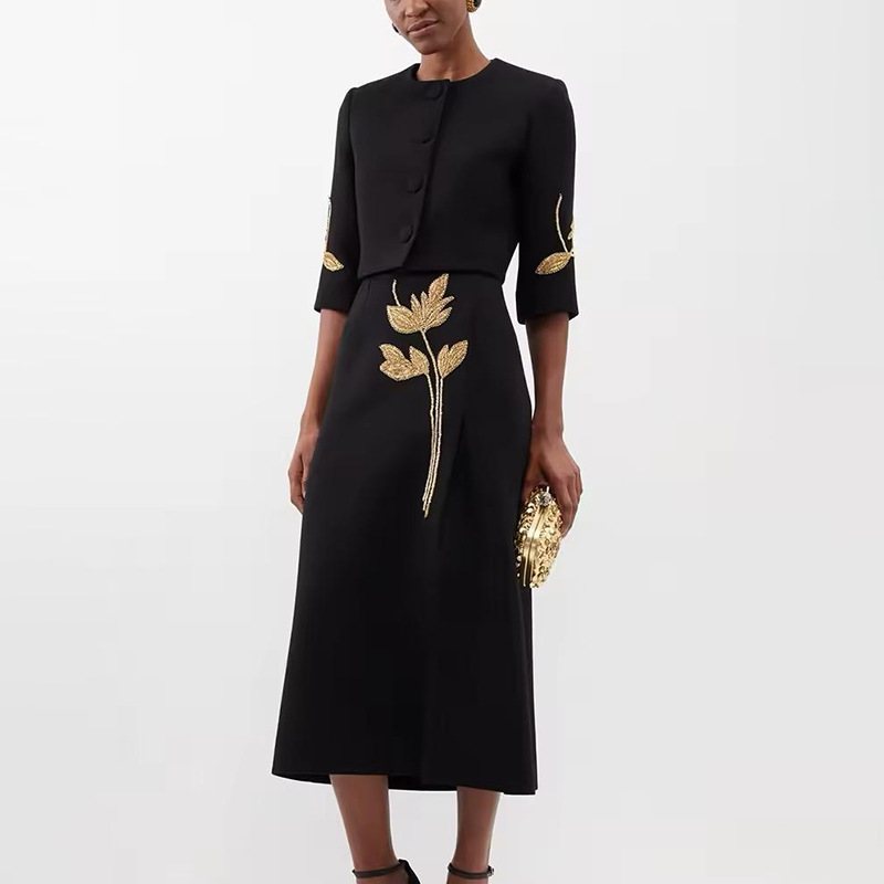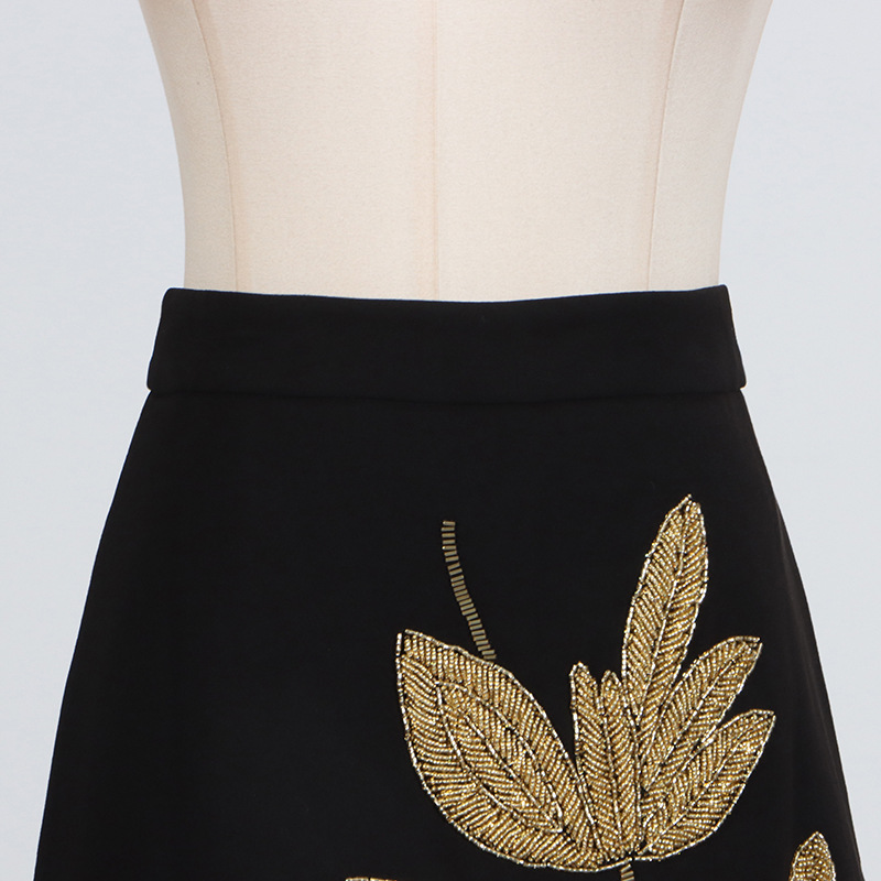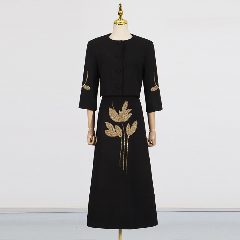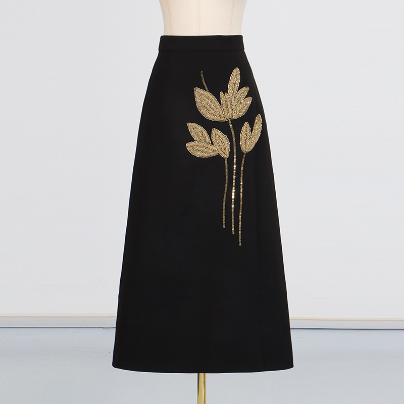 2025 새로운 유럽과 미국의 중공업 꽃 구슬 디자인 짧은 최고 코트 높은 허리 A 라인 스커트 여성 세트스토어 가기