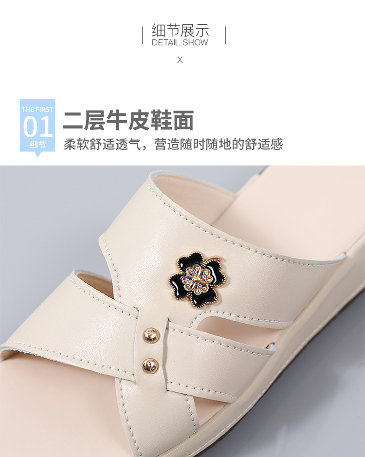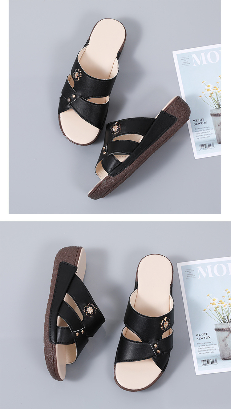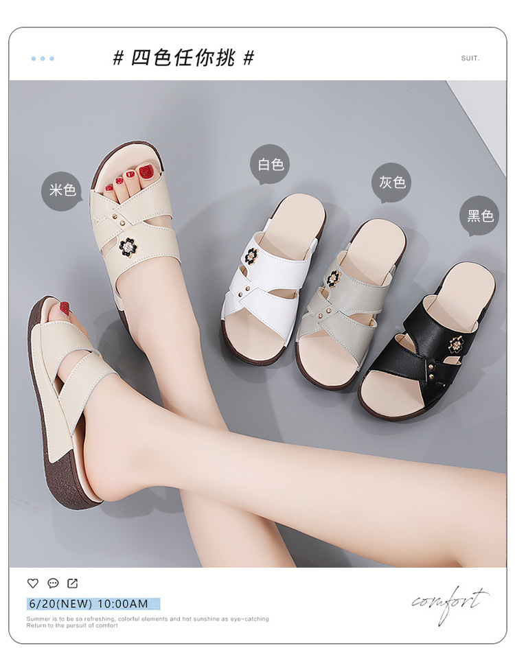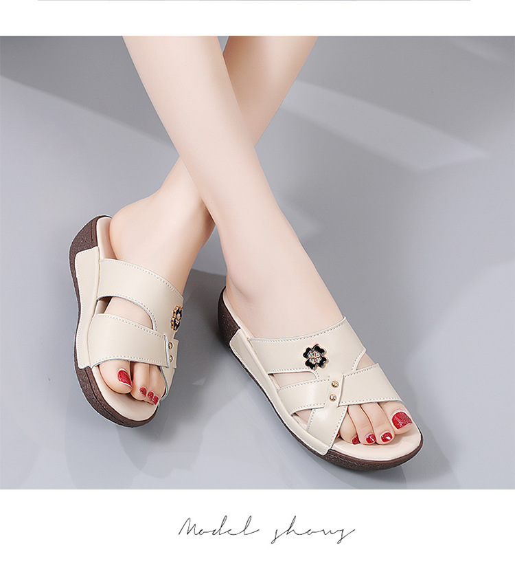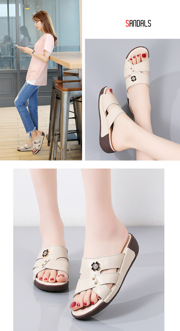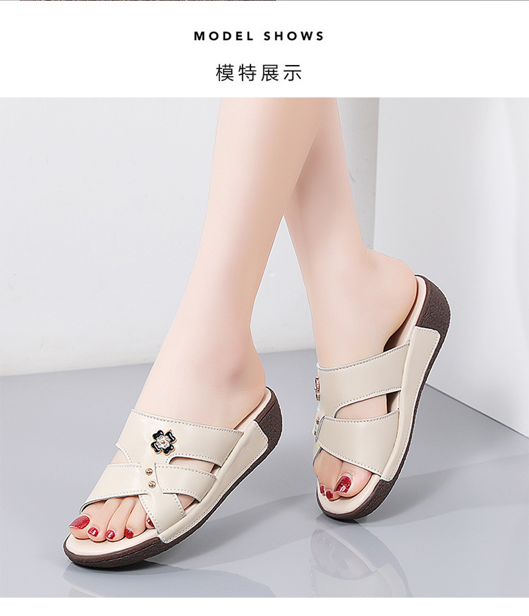 여름 새로운 정품 가죽 어머니 슬리퍼 여성 아웃웨어 중년 및 노인 여성 신발 쐐기 중년 여성 슬리퍼
