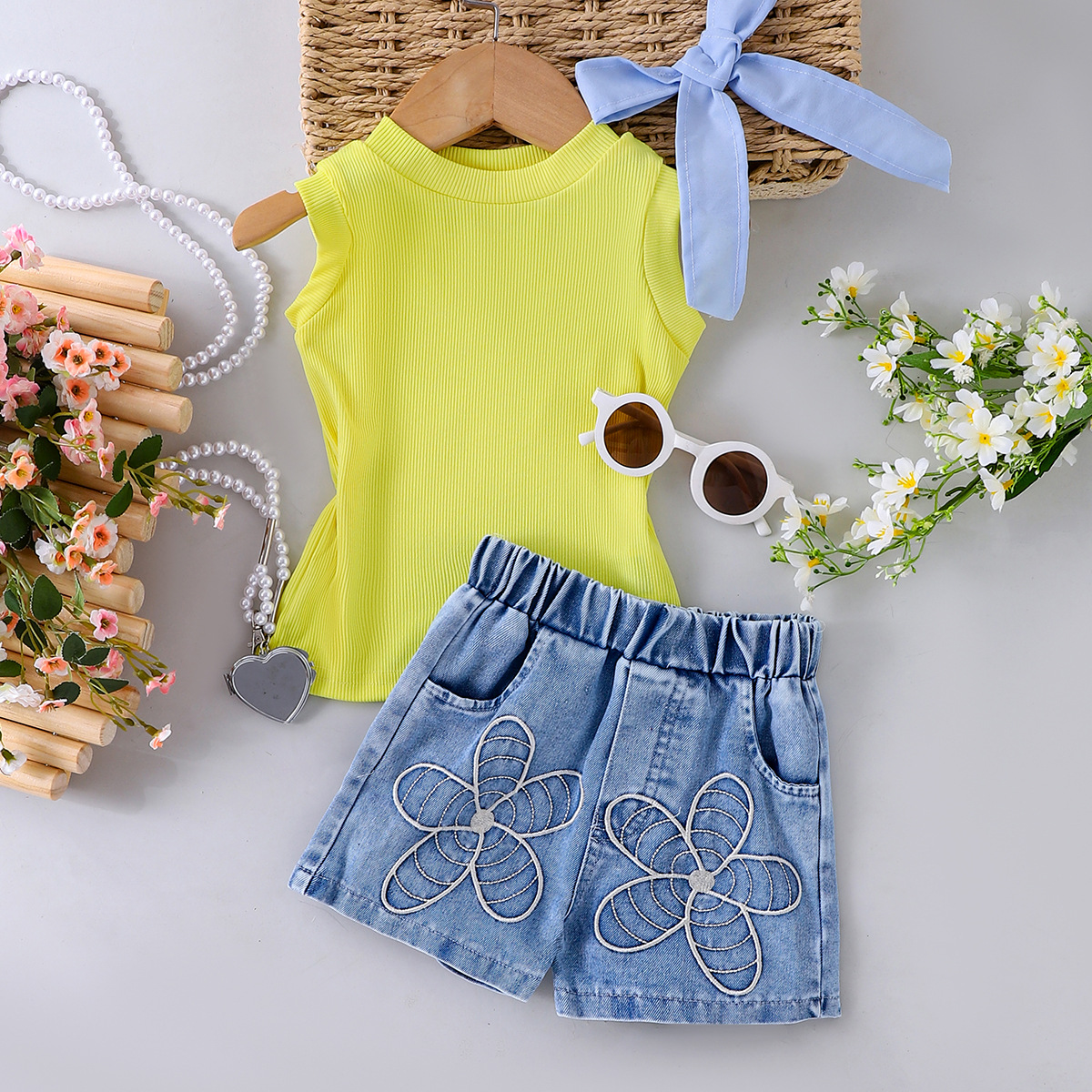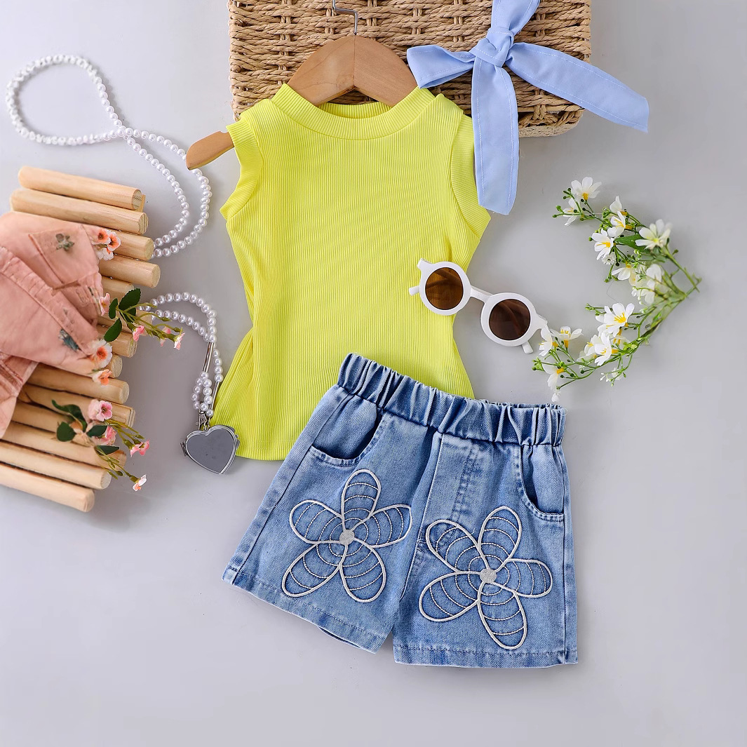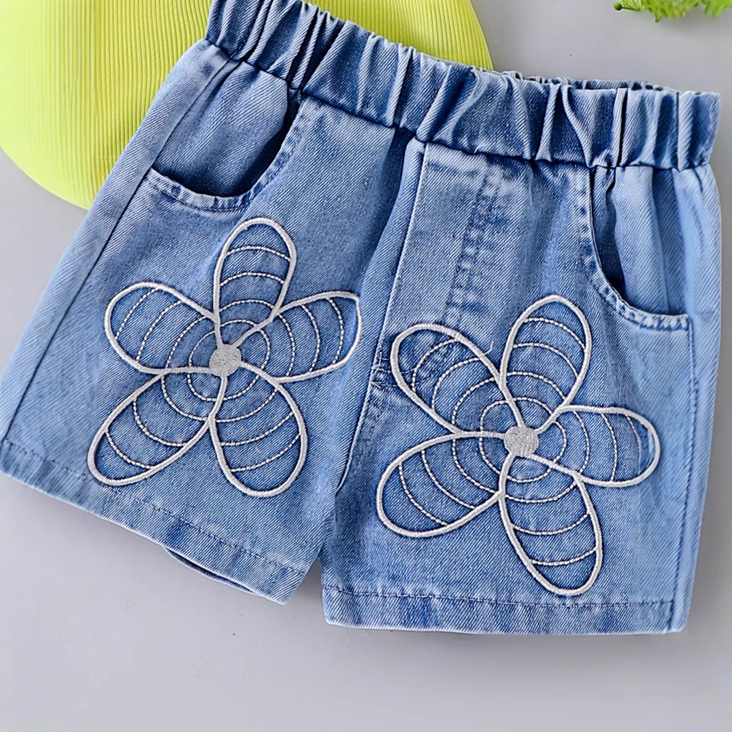 국경 간 대외 무역 2025 새로운 소녀 여름 단색 피트 스트립 패션 캐미솔 꽃 자수 데님 반바지