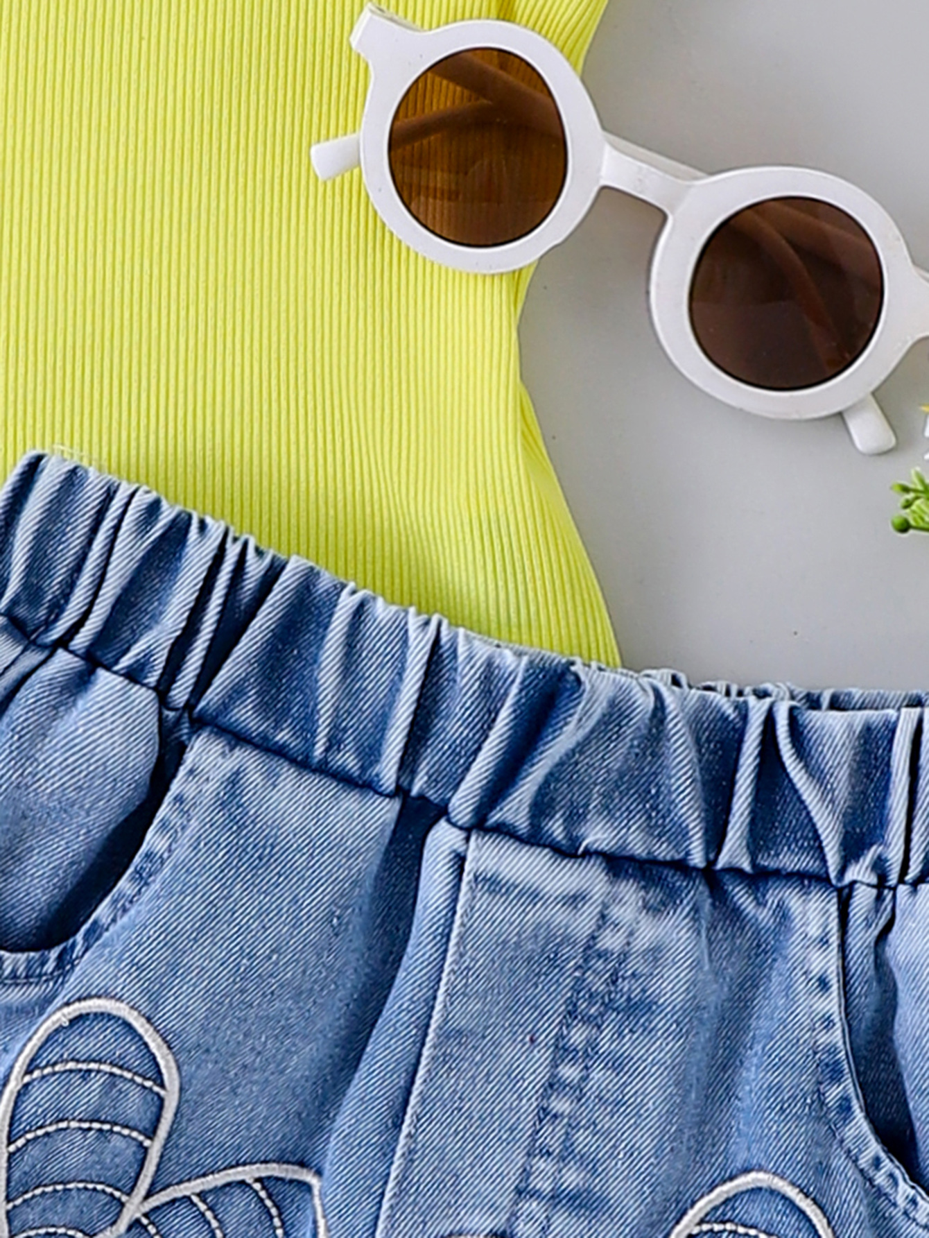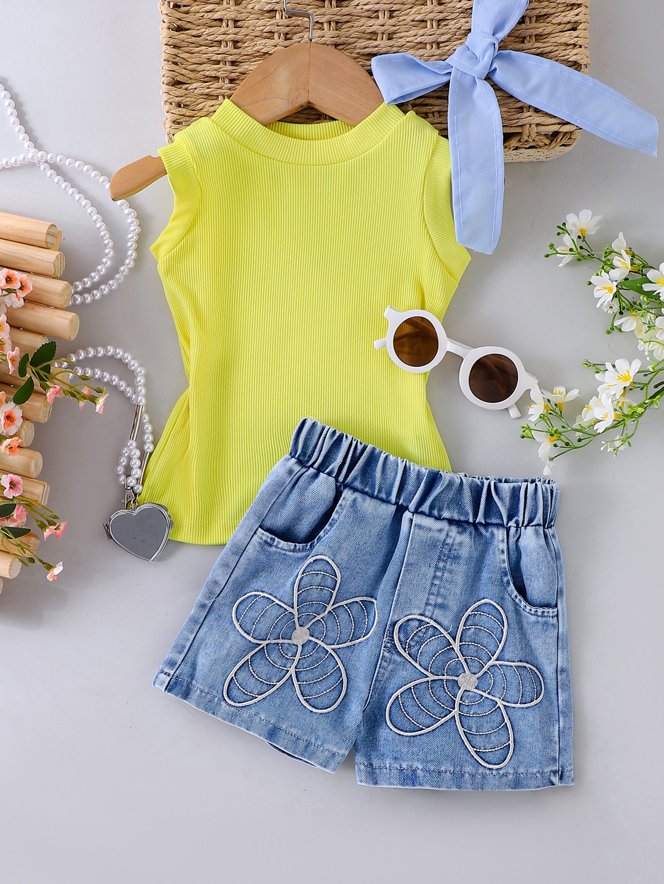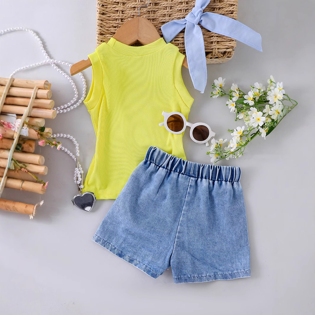 국경 간 대외 무역 2025 새로운 소녀 여름 단색 피트 스트립 패션 캐미솔 꽃 자수 데님 반바지