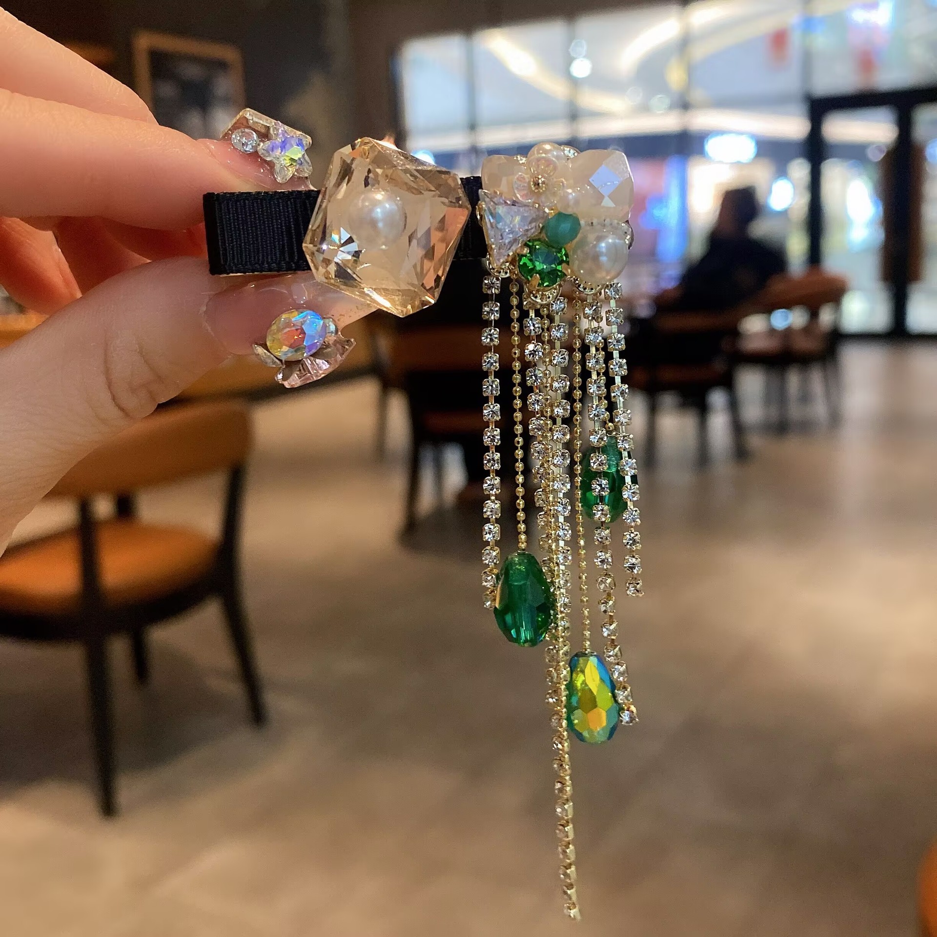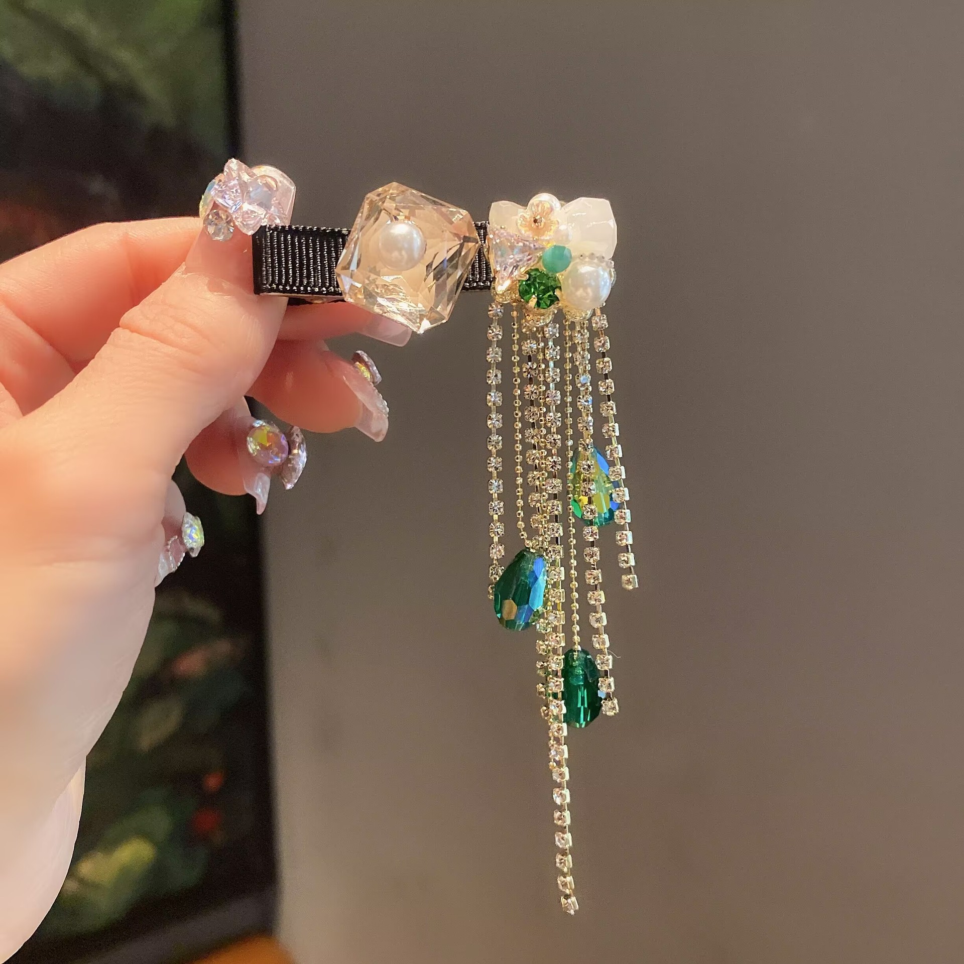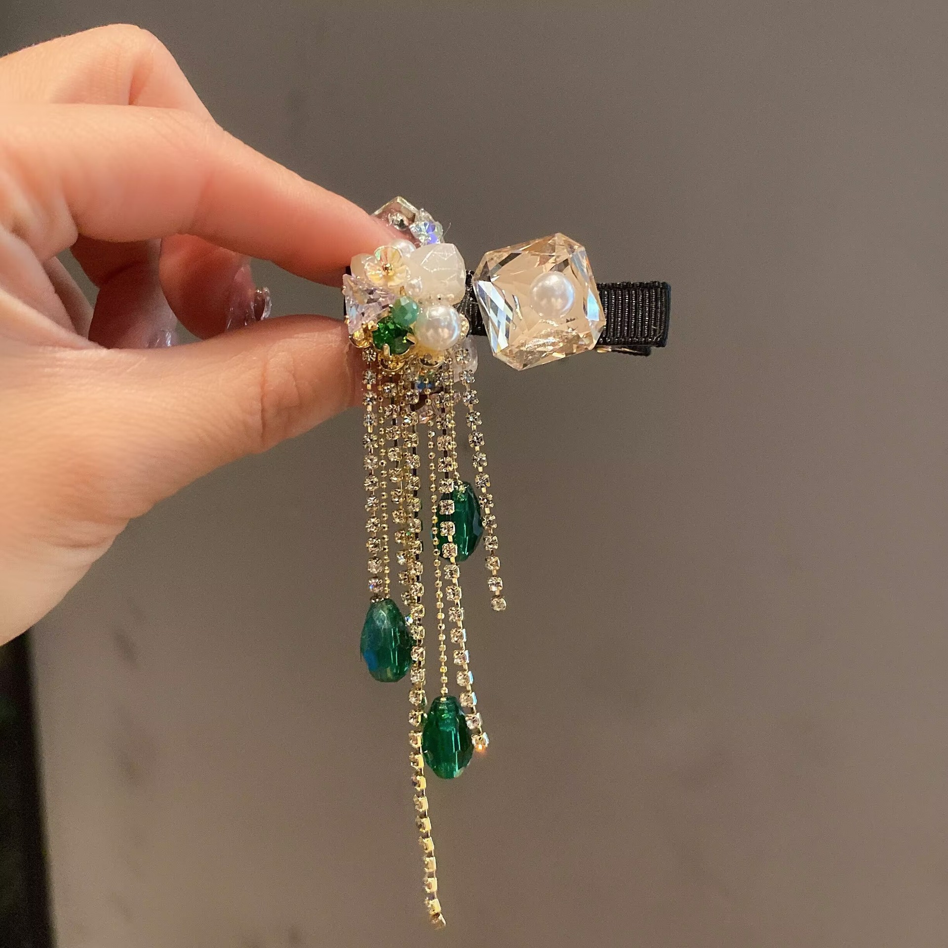 고급 중공업 플래시 다이아몬드 술 사이드 클립 여성 패션 절묘한 그린 펄 사이드 깨진 헤어핀 우아한 헤어핀