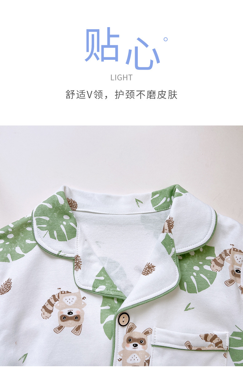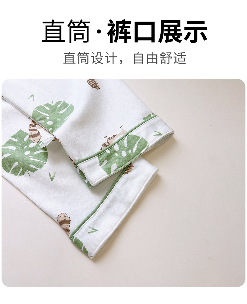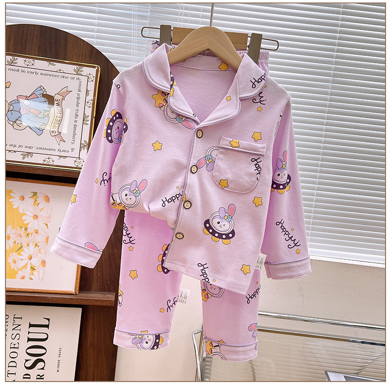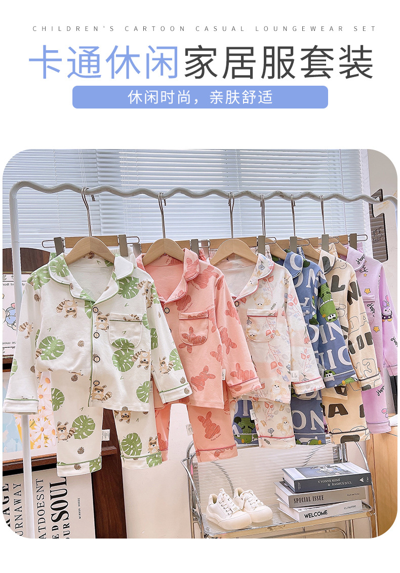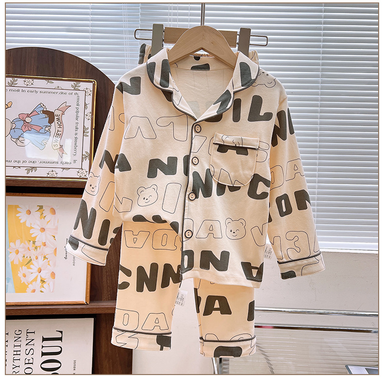 남학생과 여학생을위한 여름 어린이 잠옷 코튼 옷깃 긴팔 바지 세트 중대형 어린이 면사 세트스토어 가기