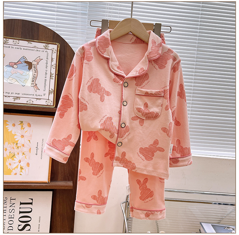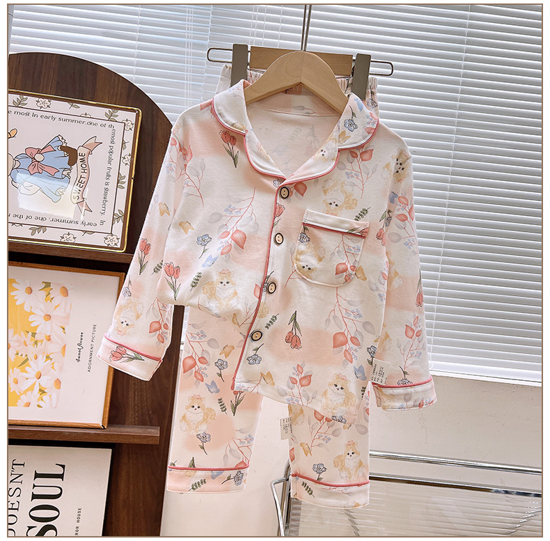 남학생과 여학생을위한 여름 어린이 잠옷 코튼 옷깃 긴팔 바지 세트 중대형 어린이 면사 세트