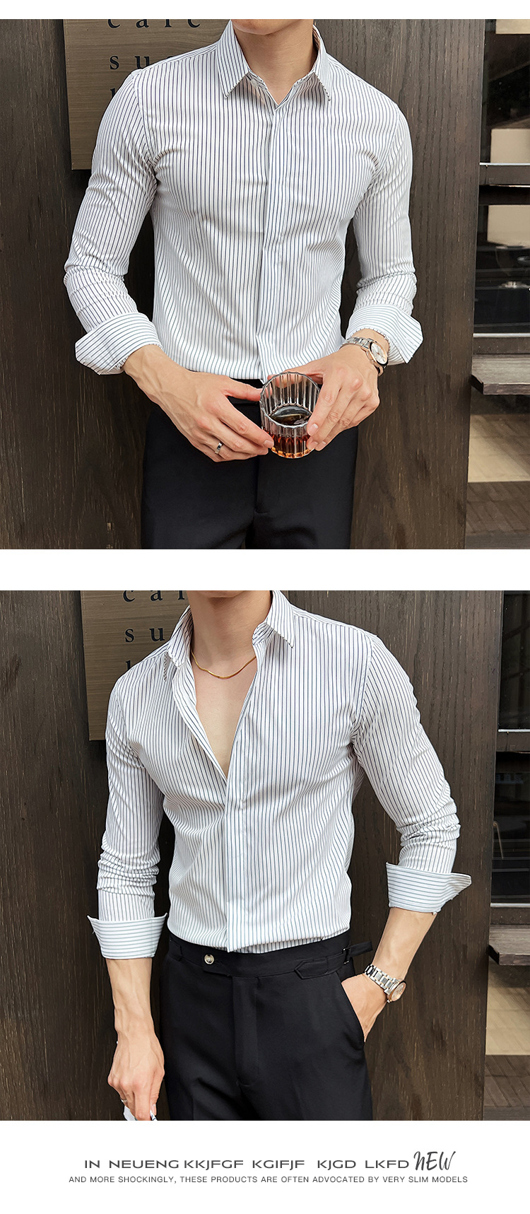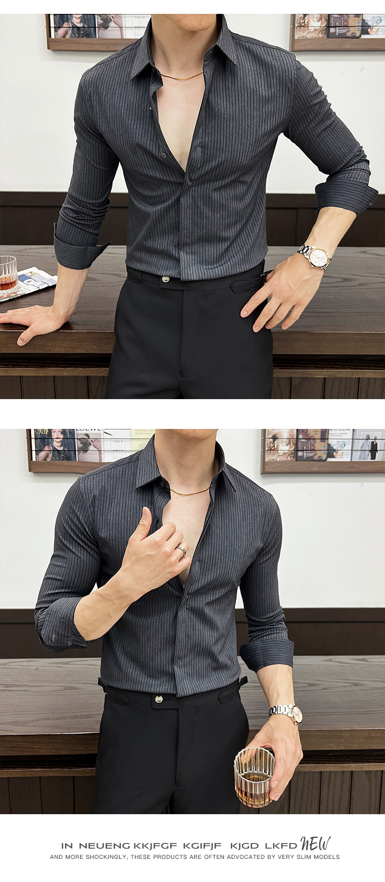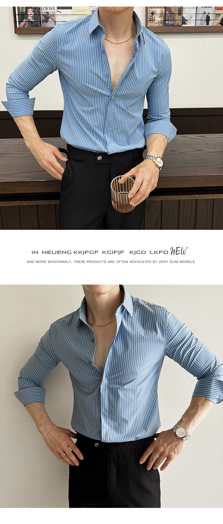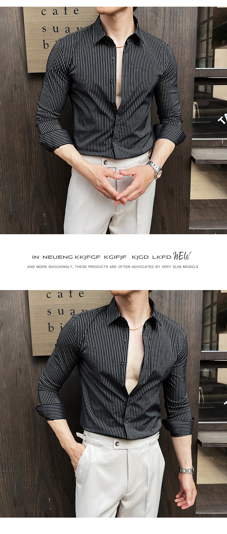 라이브 방송 판매 봄 신상 남성 스트라이프 다크 플래킷 긴팔 셔츠 슬림핏 멋스러운 영국 트렌드 셔츠