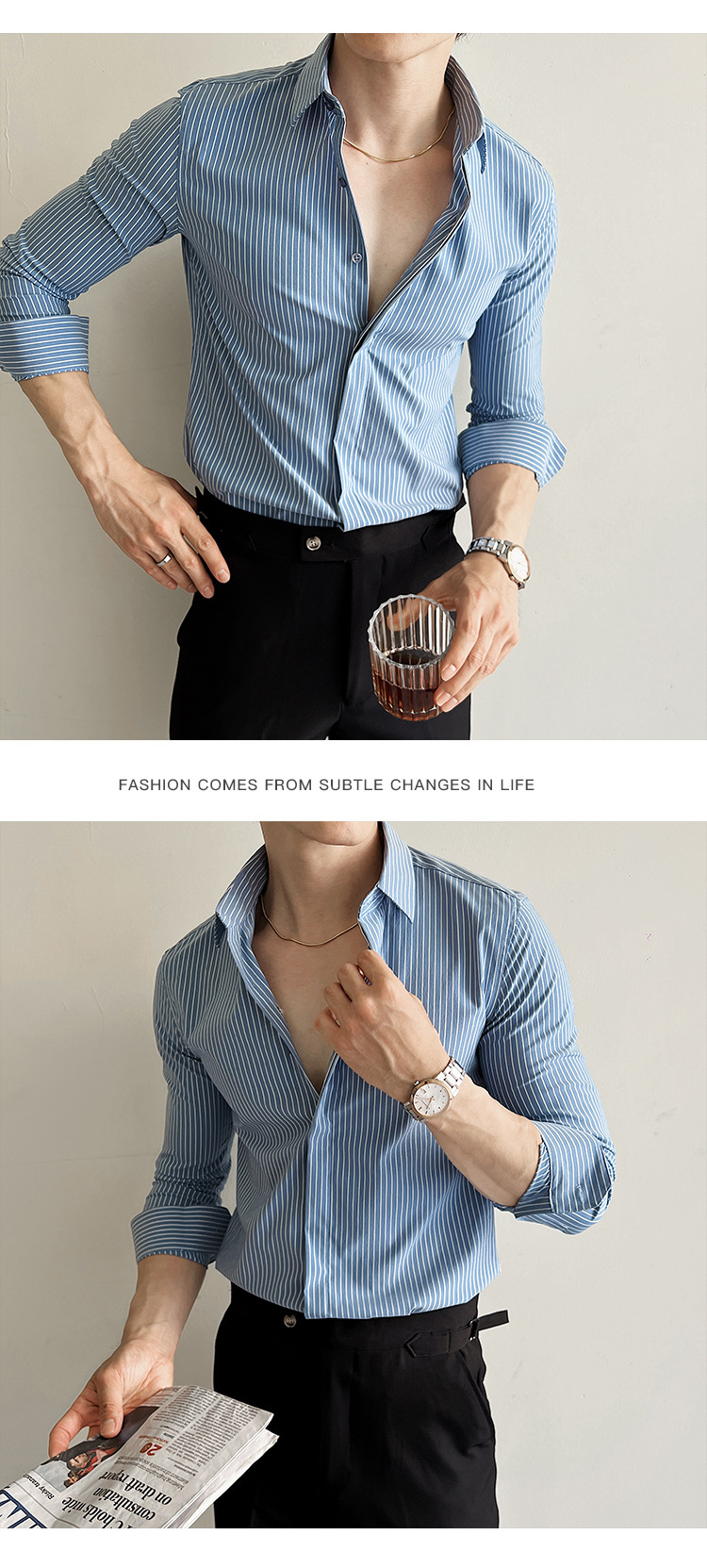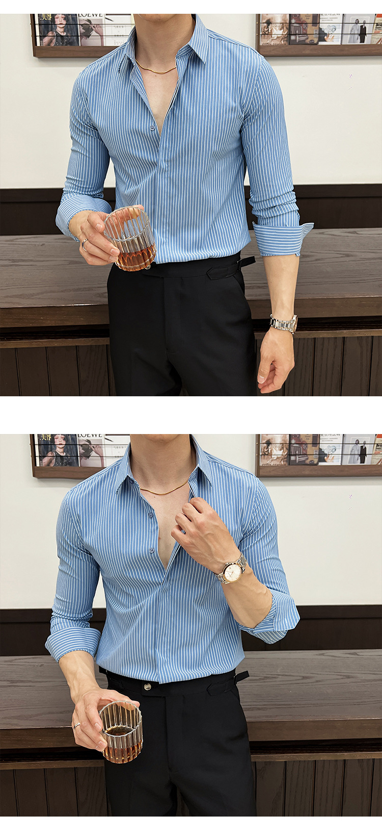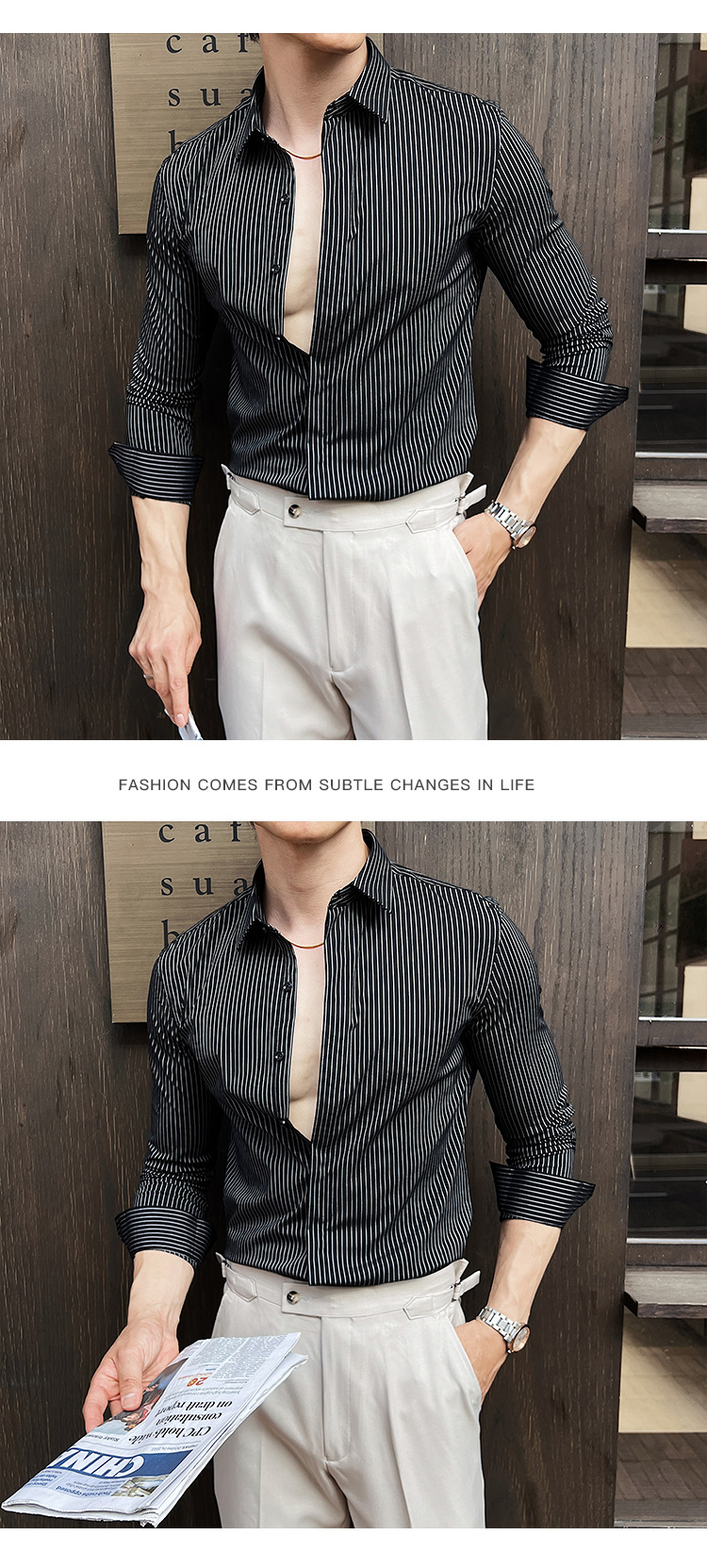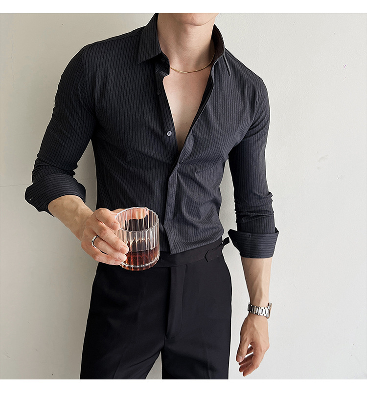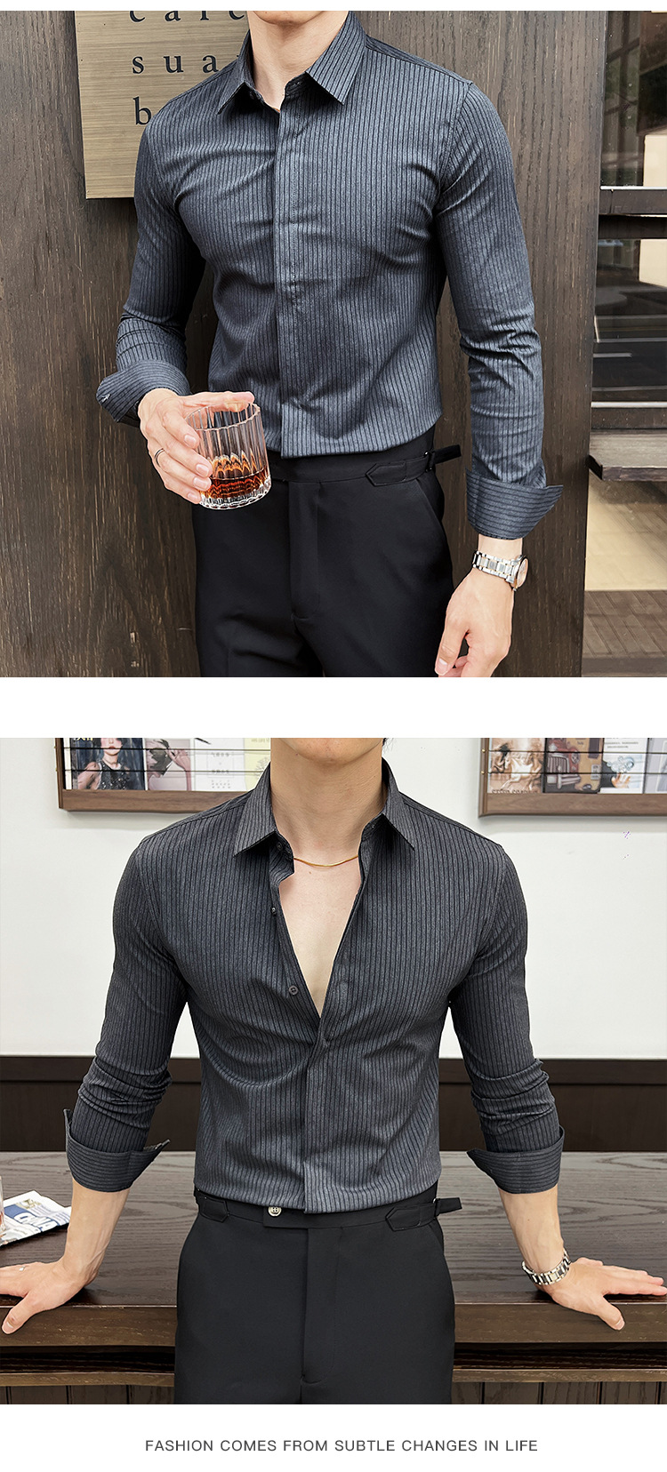 라이브 방송 판매 봄 신상 남성 스트라이프 다크 플래킷 긴팔 셔츠 슬림핏 멋스러운 영국 트렌드 셔츠