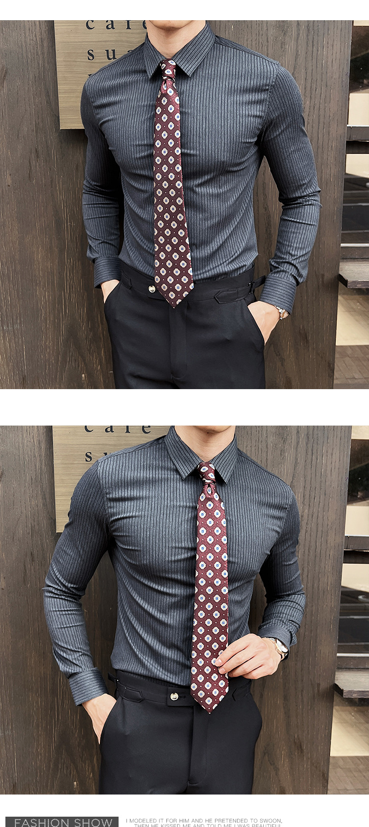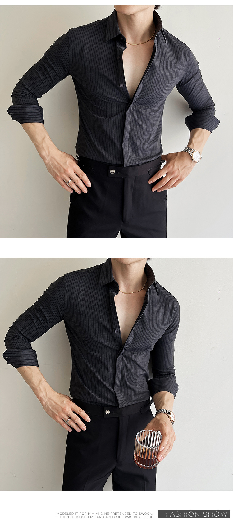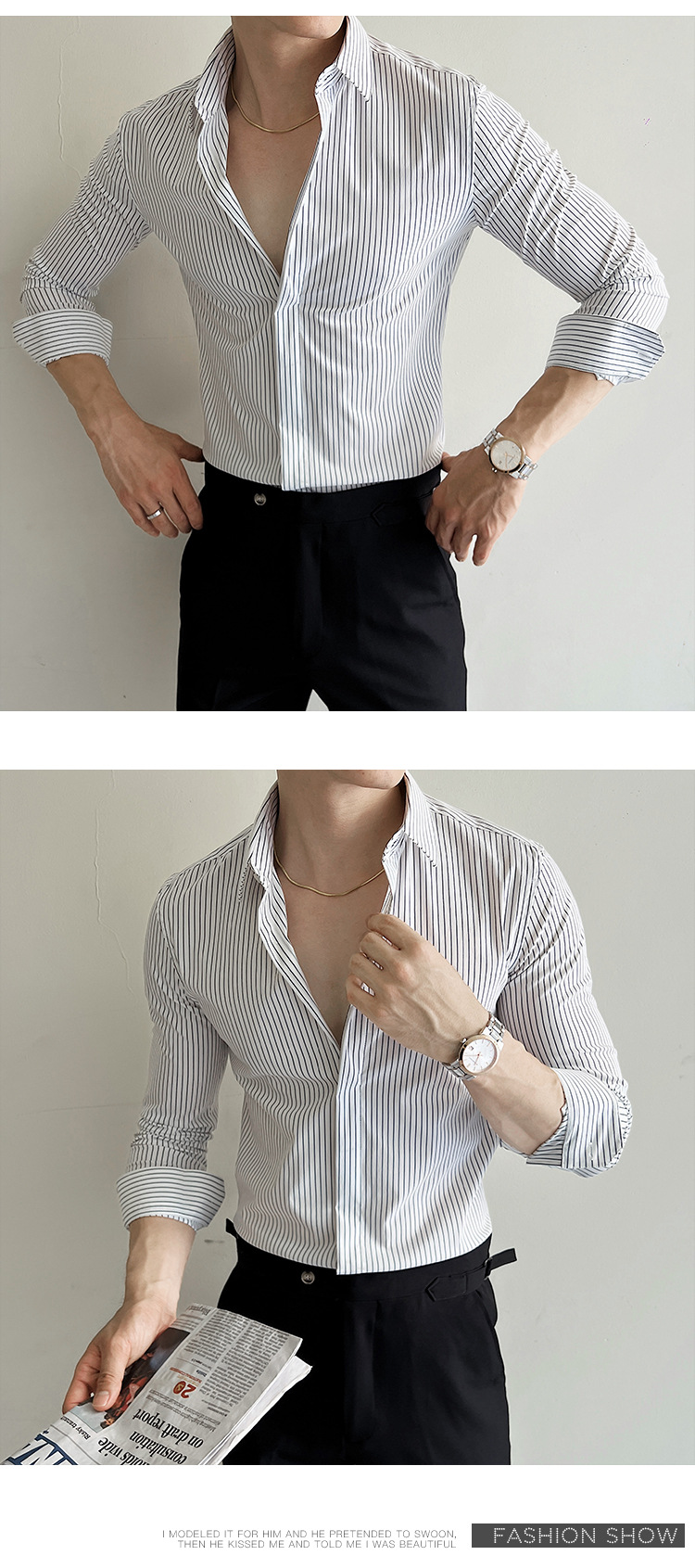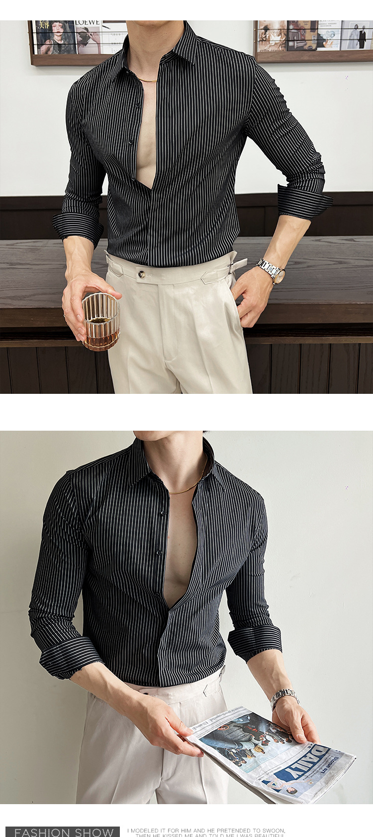 라이브 방송 판매 봄 신상 남성 스트라이프 다크 플래킷 긴팔 셔츠 슬림핏 멋스러운 영국 트렌드 셔츠