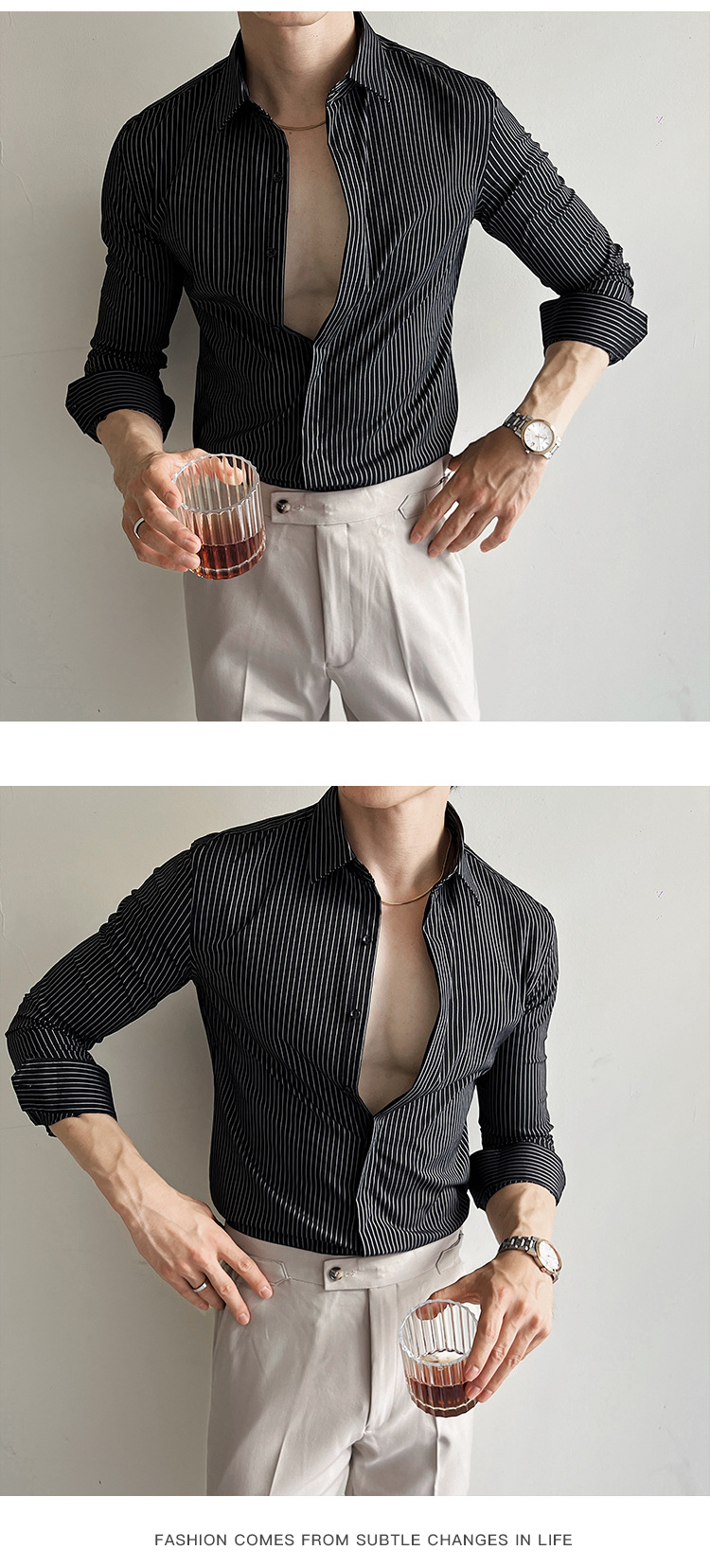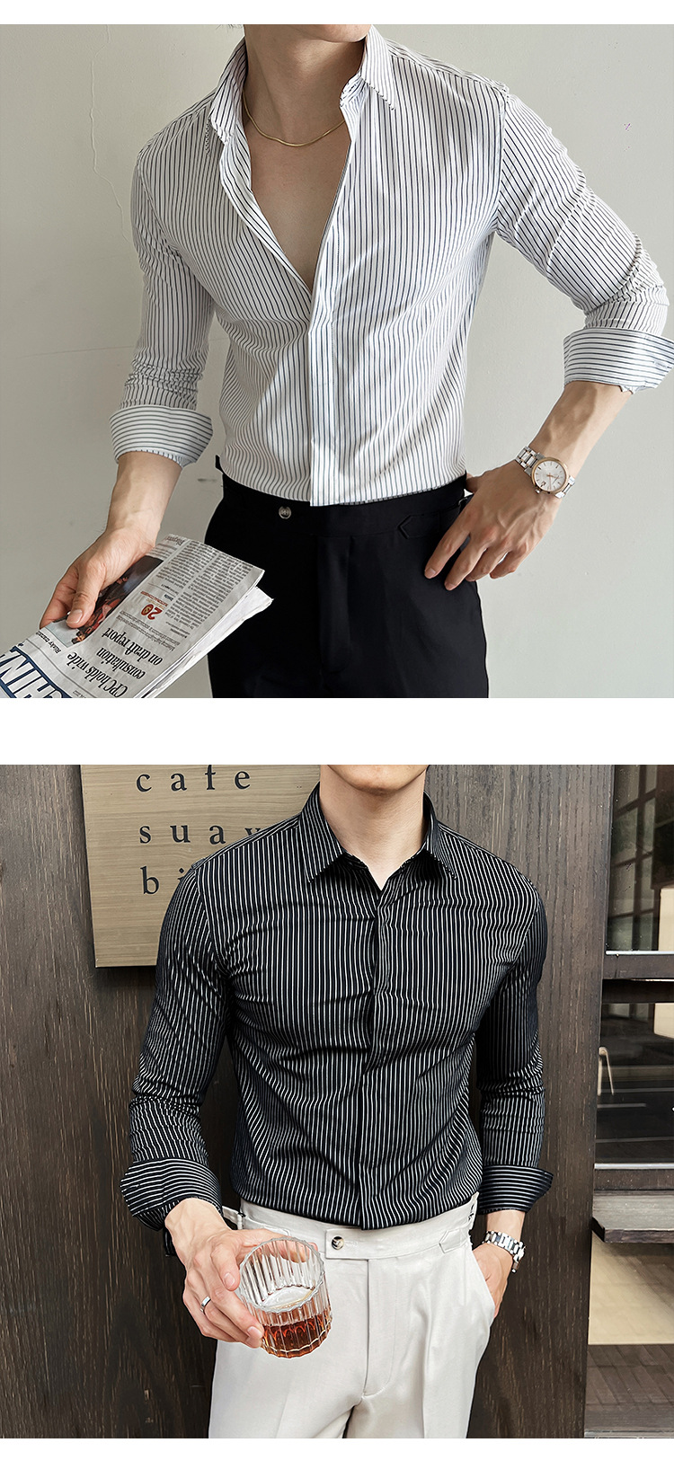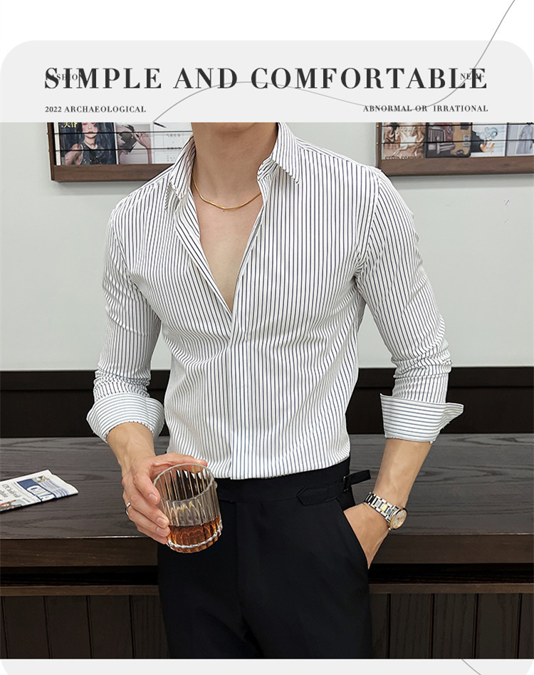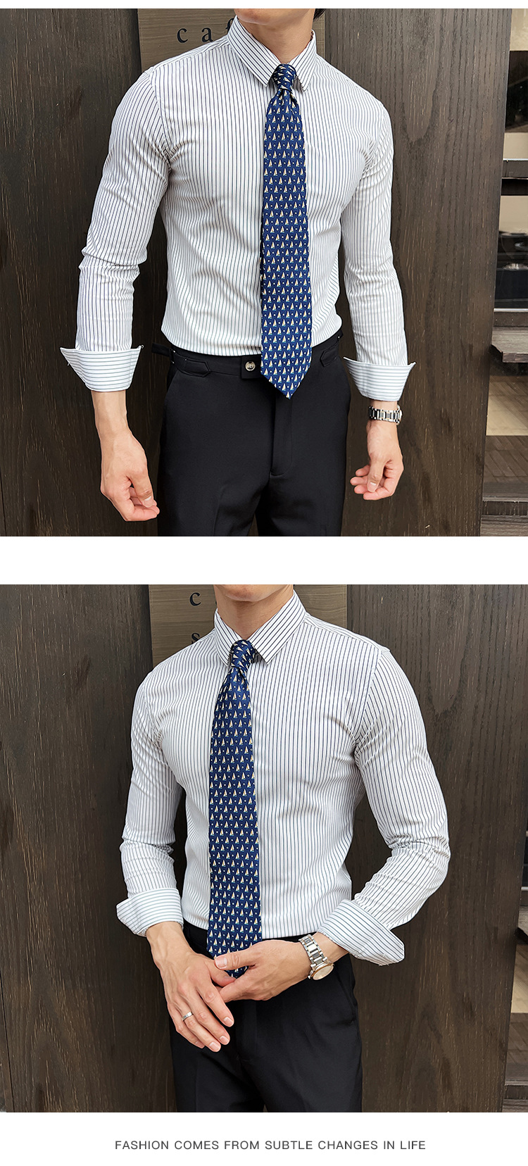 라이브 방송 판매 봄 신상 남성 스트라이프 다크 플래킷 긴팔 셔츠 슬림핏 멋스러운 영국 트렌드 셔츠